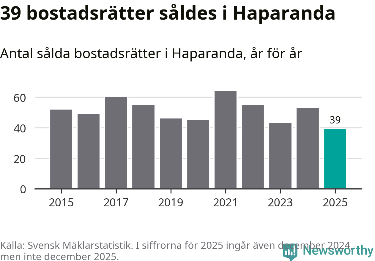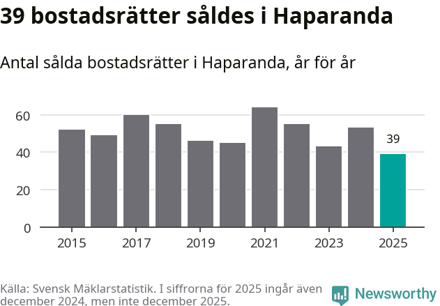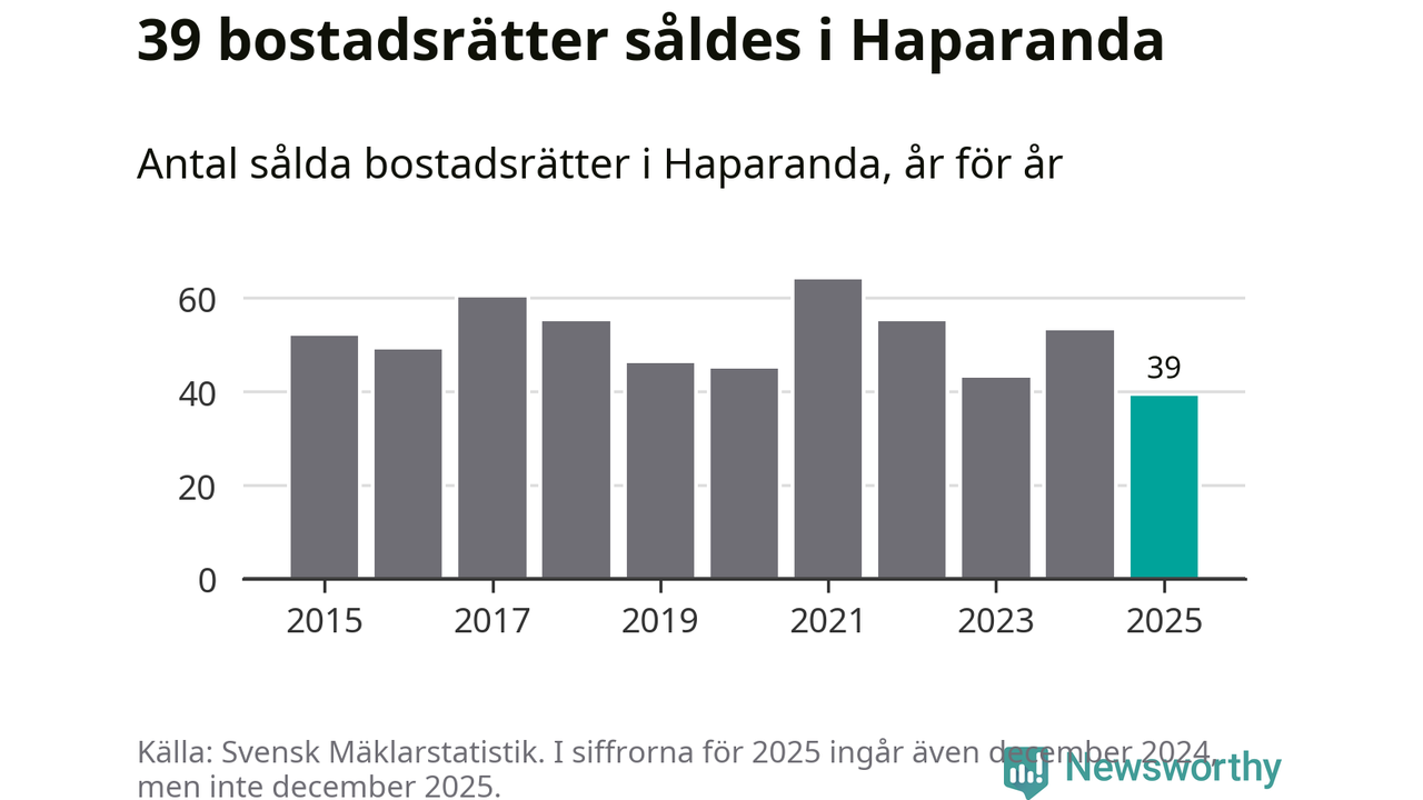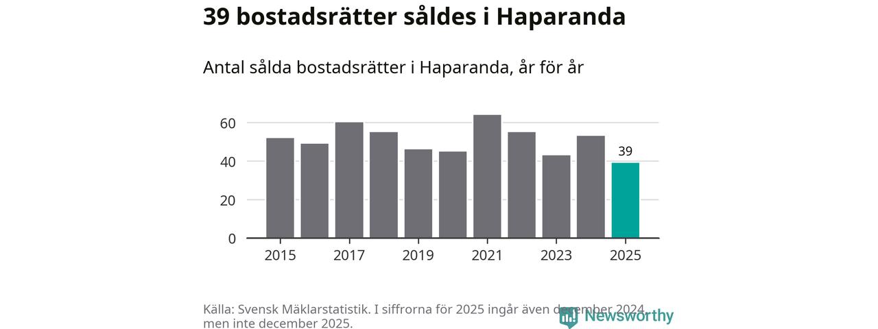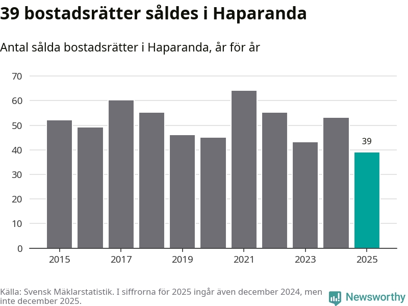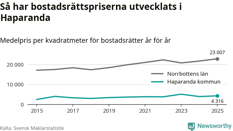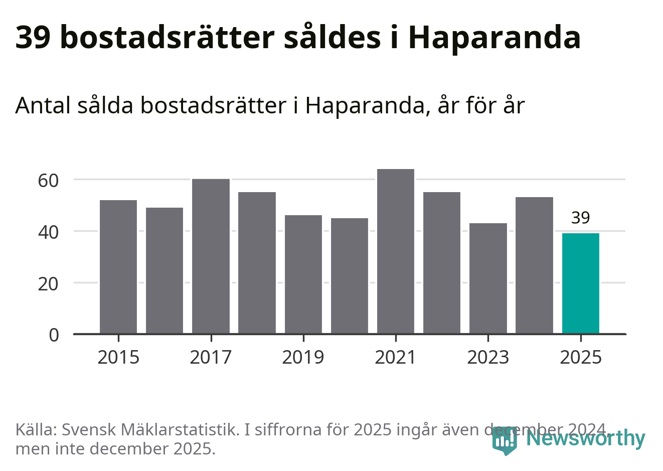 Det såldes totalt 39 bostadsrätter i Haparanda kommun under året. Det är färre än något annat år sedan 2015. Genomsnittspriset per kvadratmeter landade på 4 316 kronor. Det är en ökning med tio procent i kommunen på ett år.