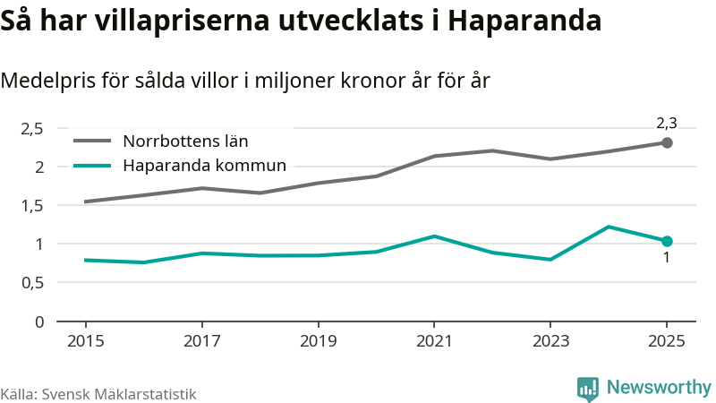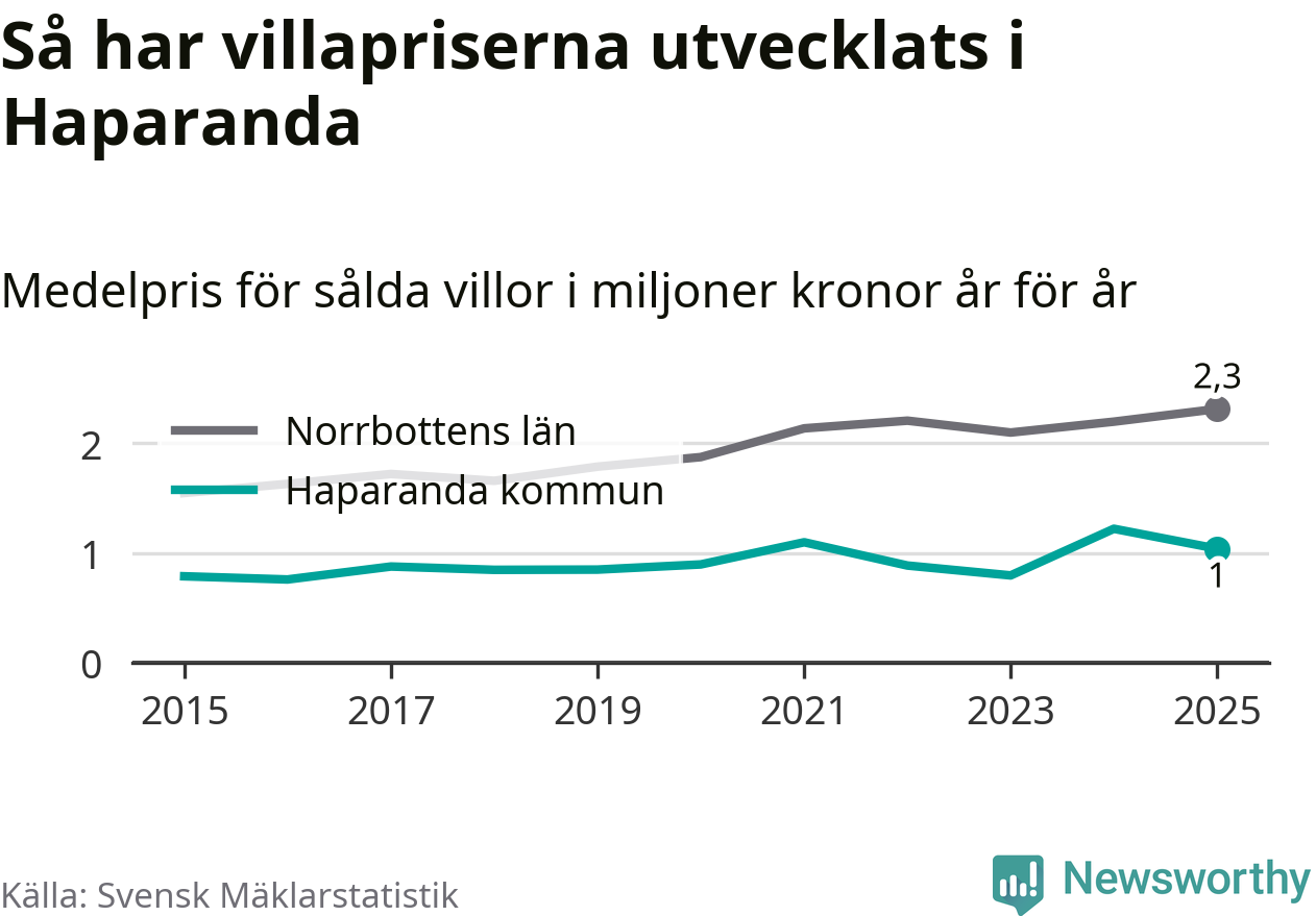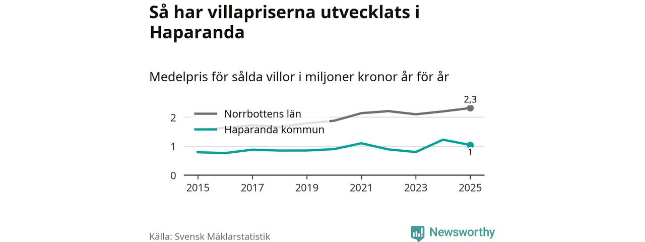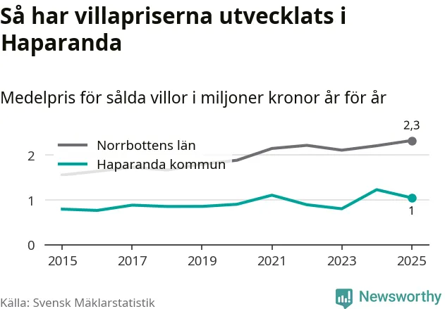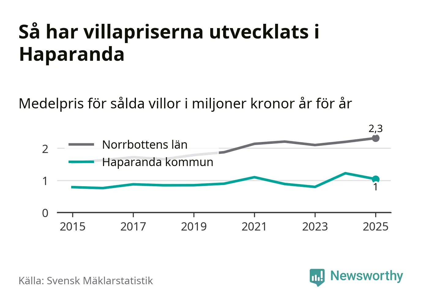 En miljon kronor är medelpriset för de villor som såldes i Haparanda kommun under året, eller 9 840 kronor per kvadratmeter. Det innebär en prisminskning med 15 procent på ett år.