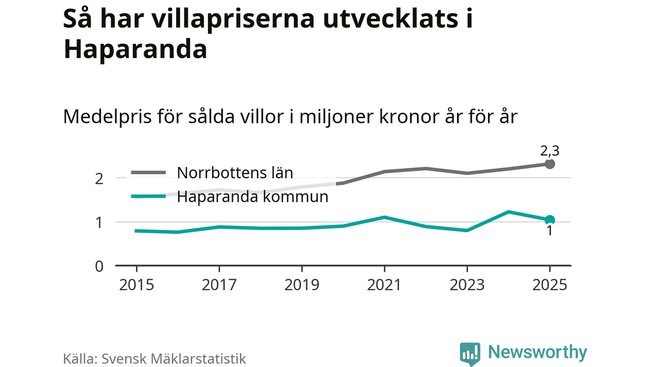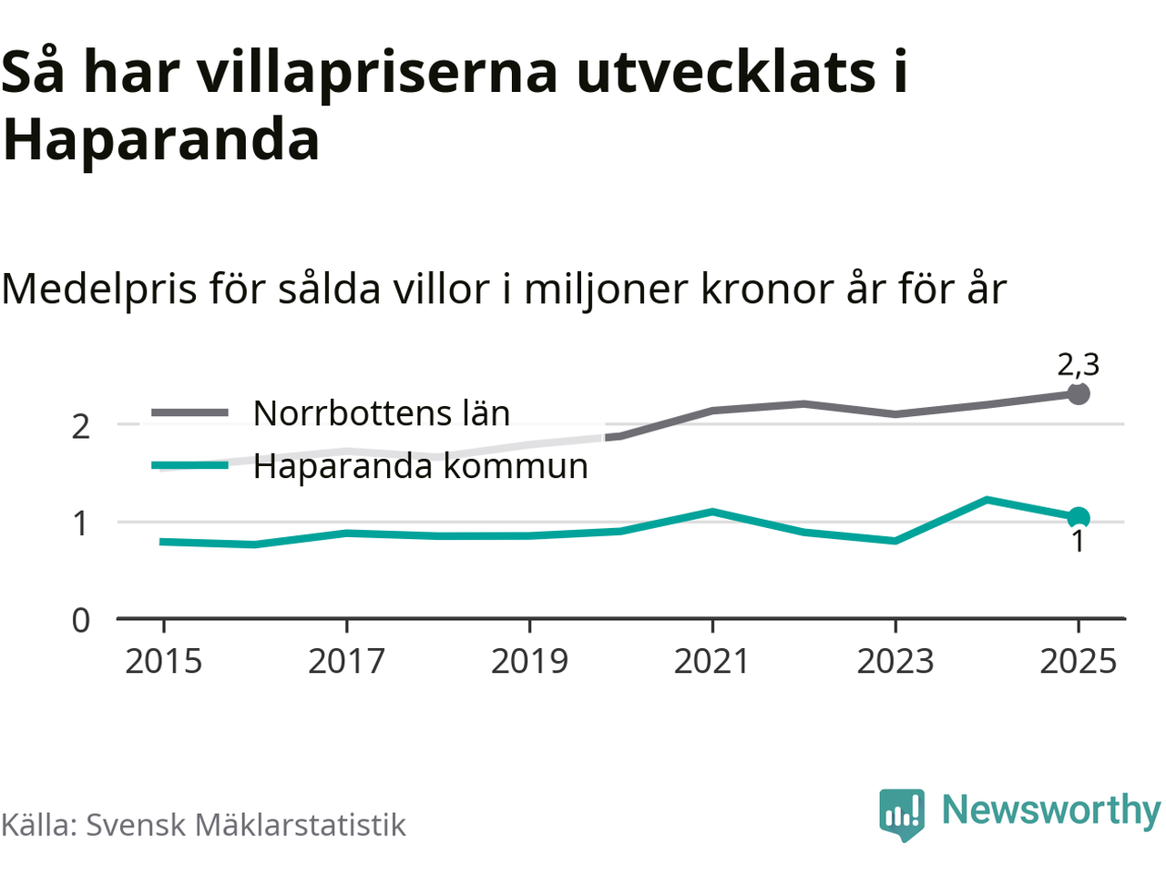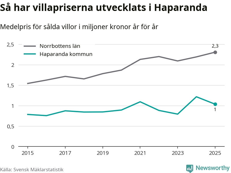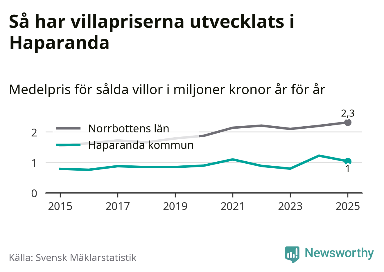 En miljon kronor är medelpriset för de villor som såldes i Haparanda kommun under året, eller 9 840 kronor per kvadratmeter. Det innebär en prisminskning med 15 procent på ett år.