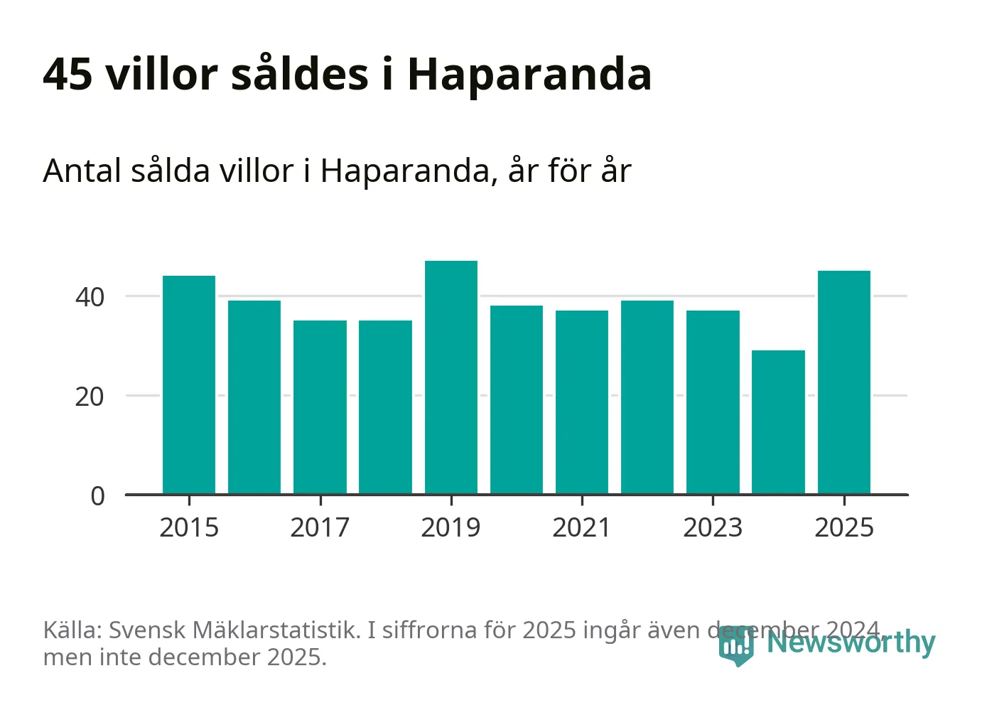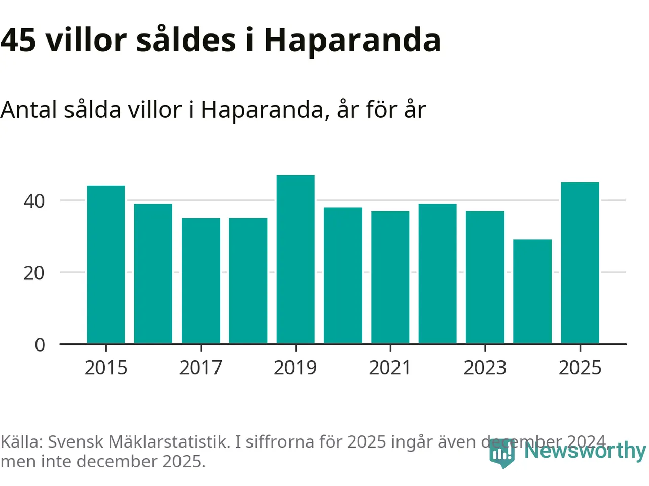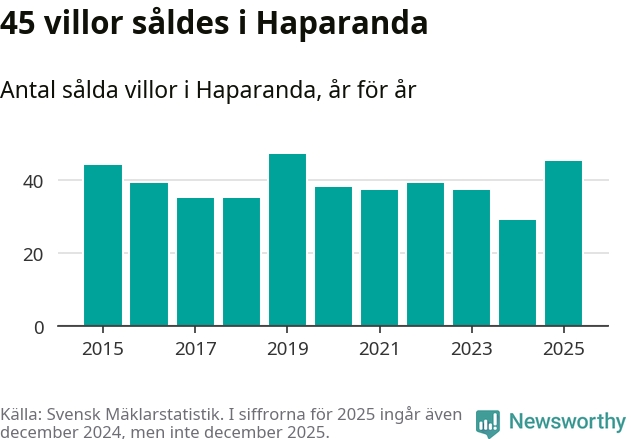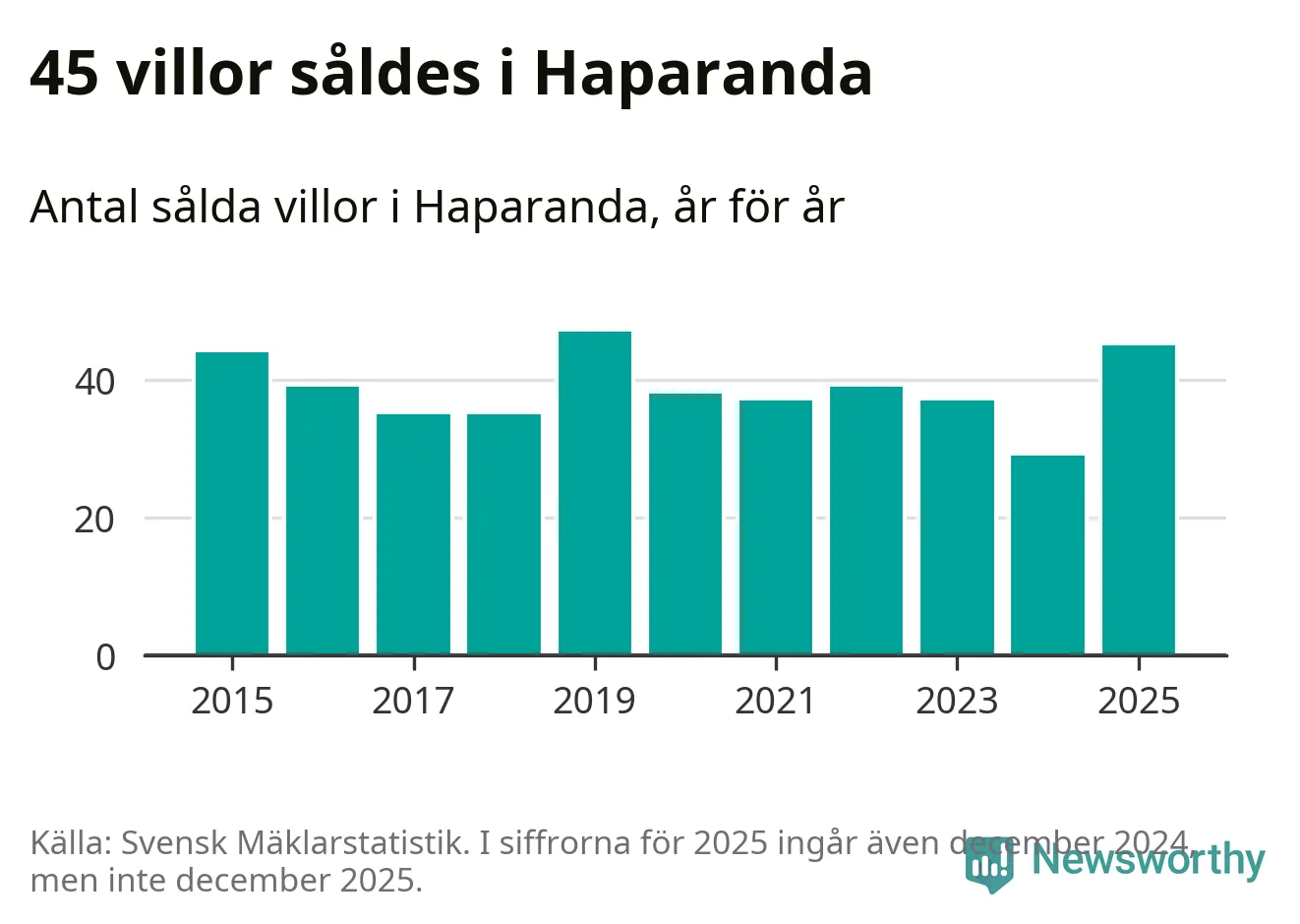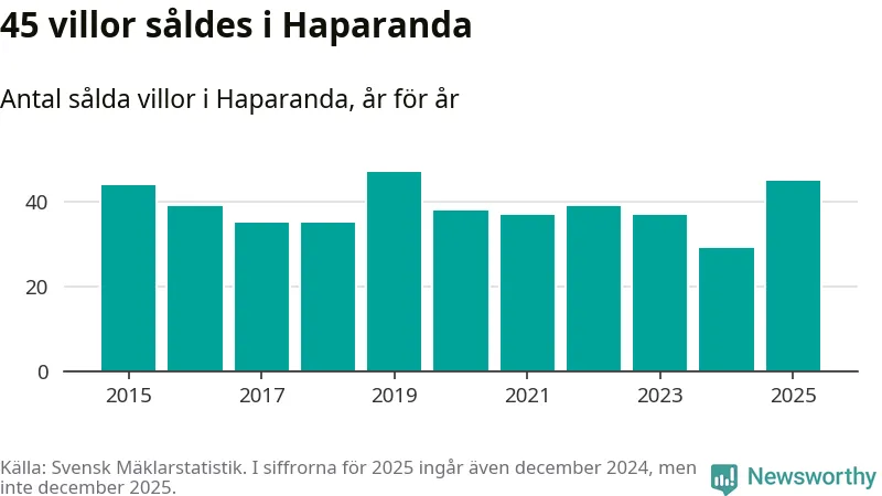 Däremot ökade antalet sålda villor. Totalt såldes 45 villor, att jämföra med 29 under 2024.