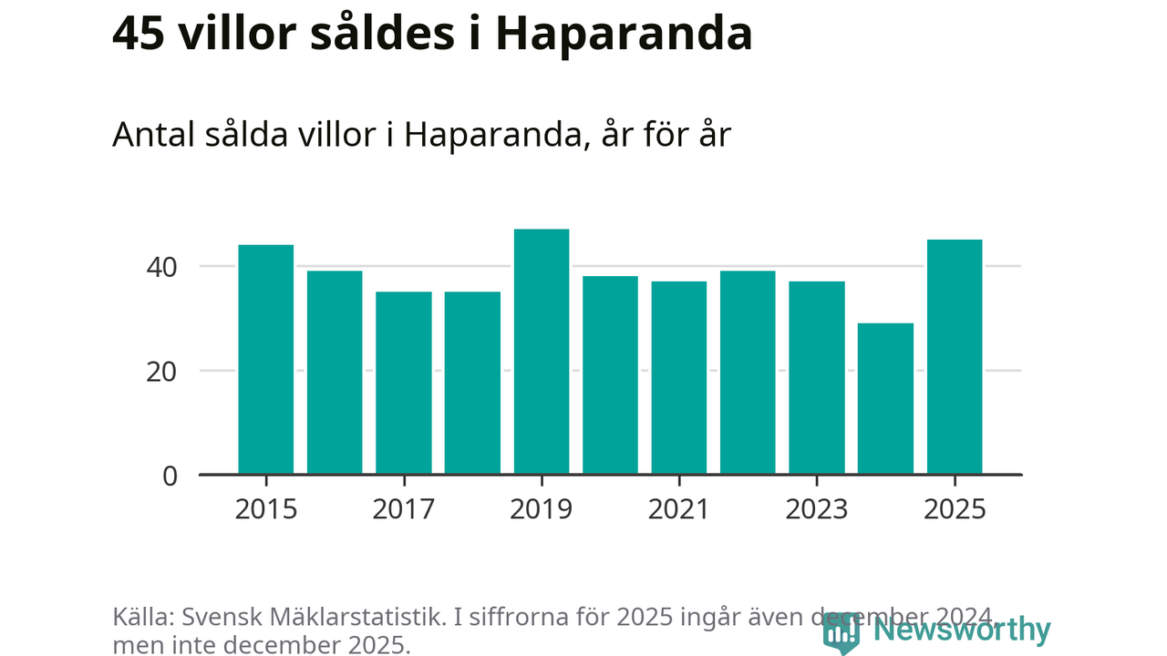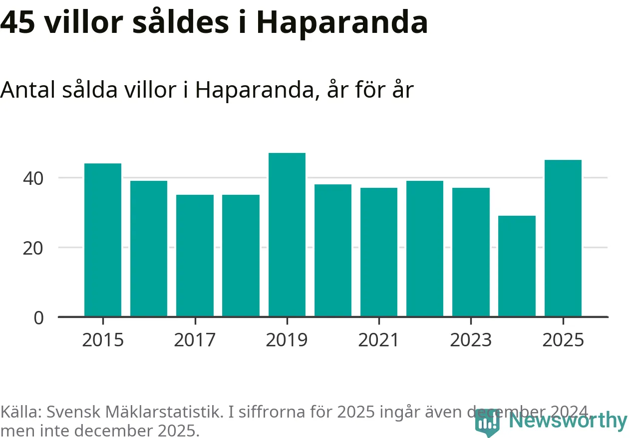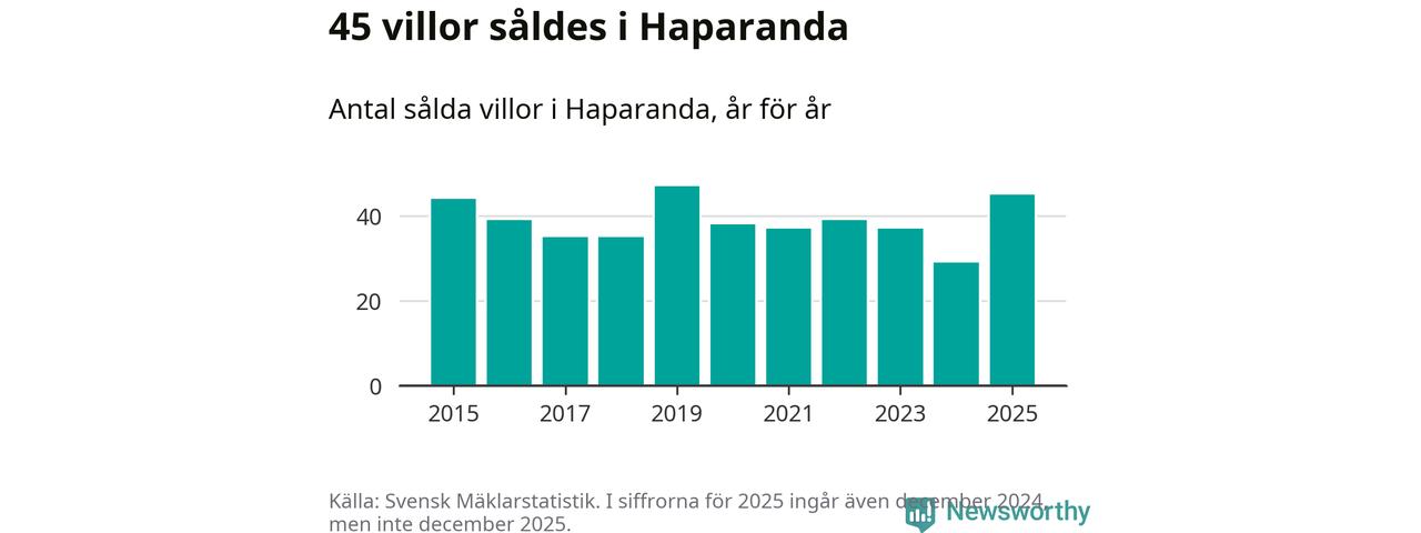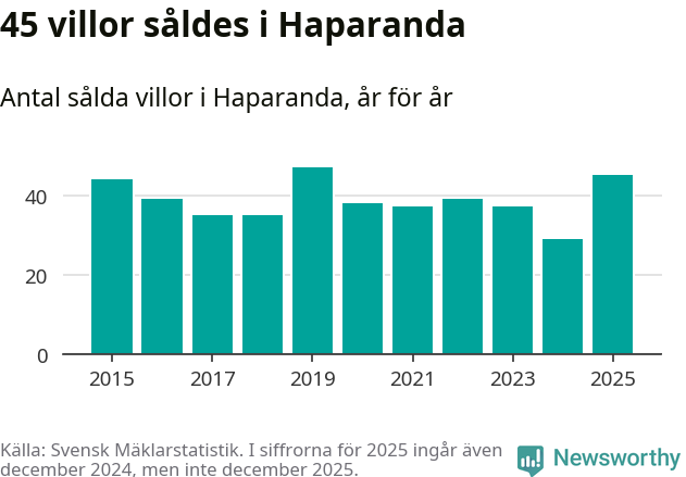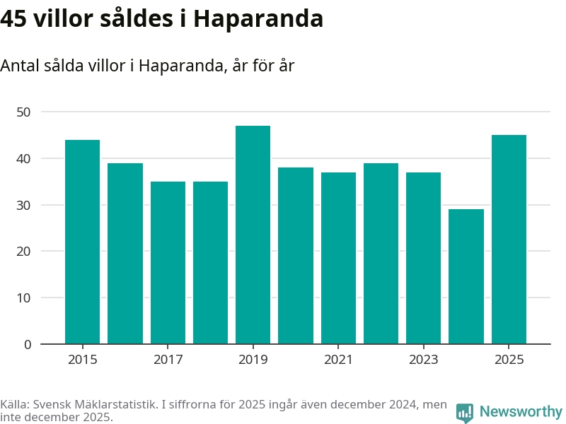 Däremot ökade antalet sålda villor. Totalt såldes 45 villor, att jämföra med 29 under 2024.