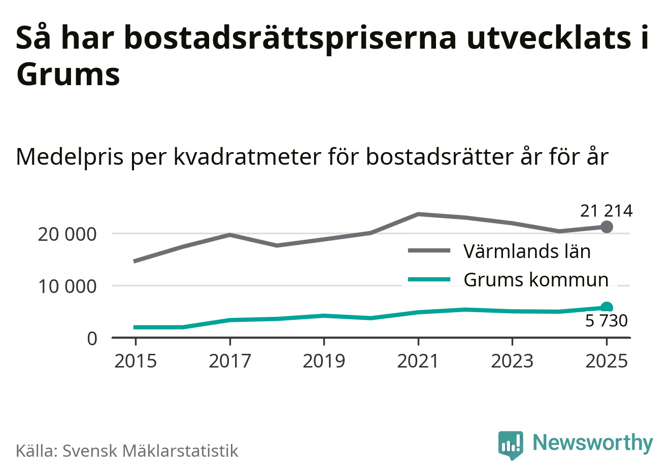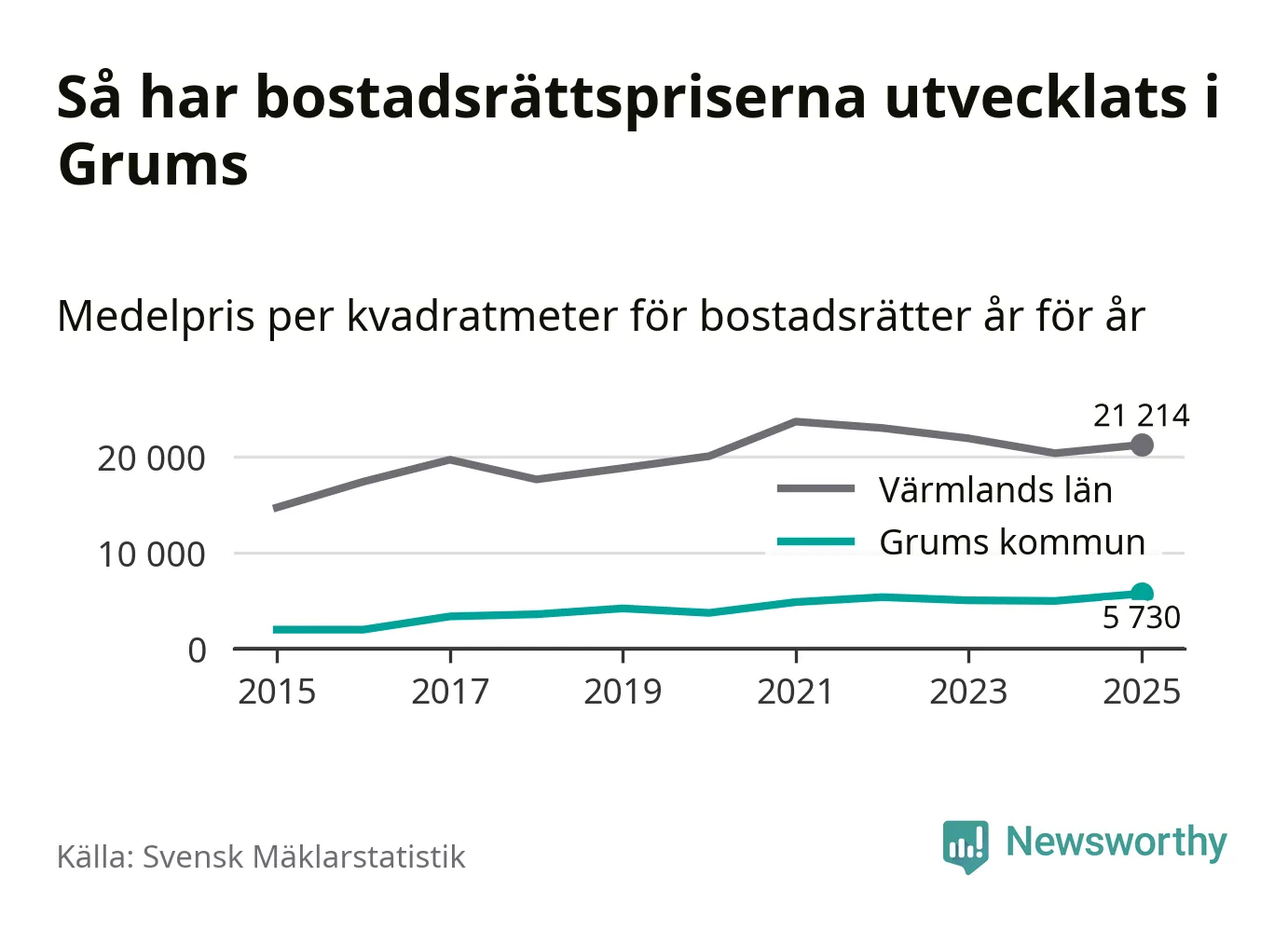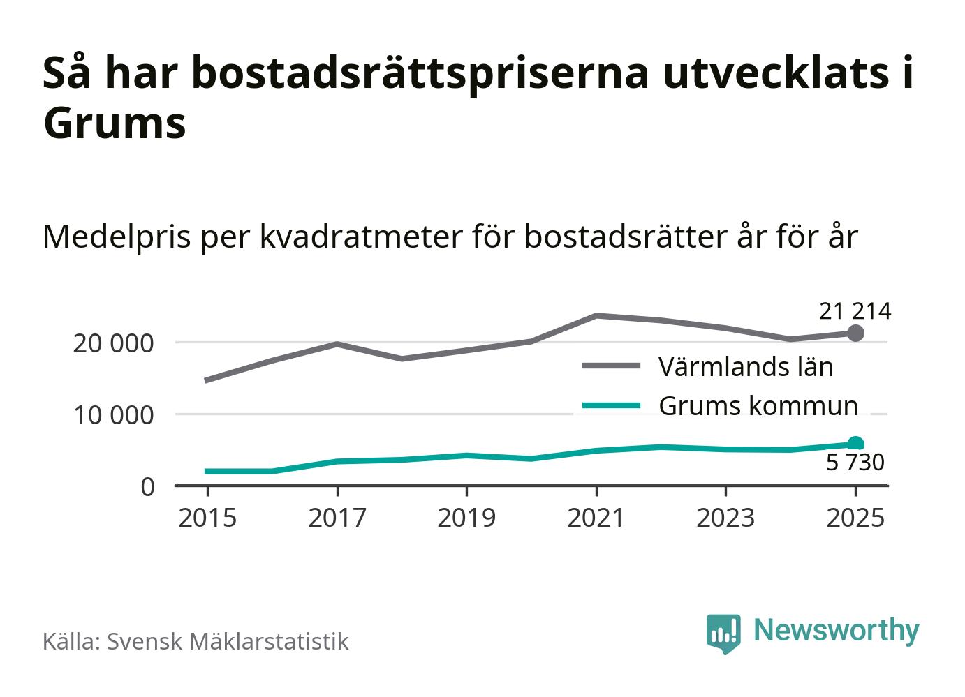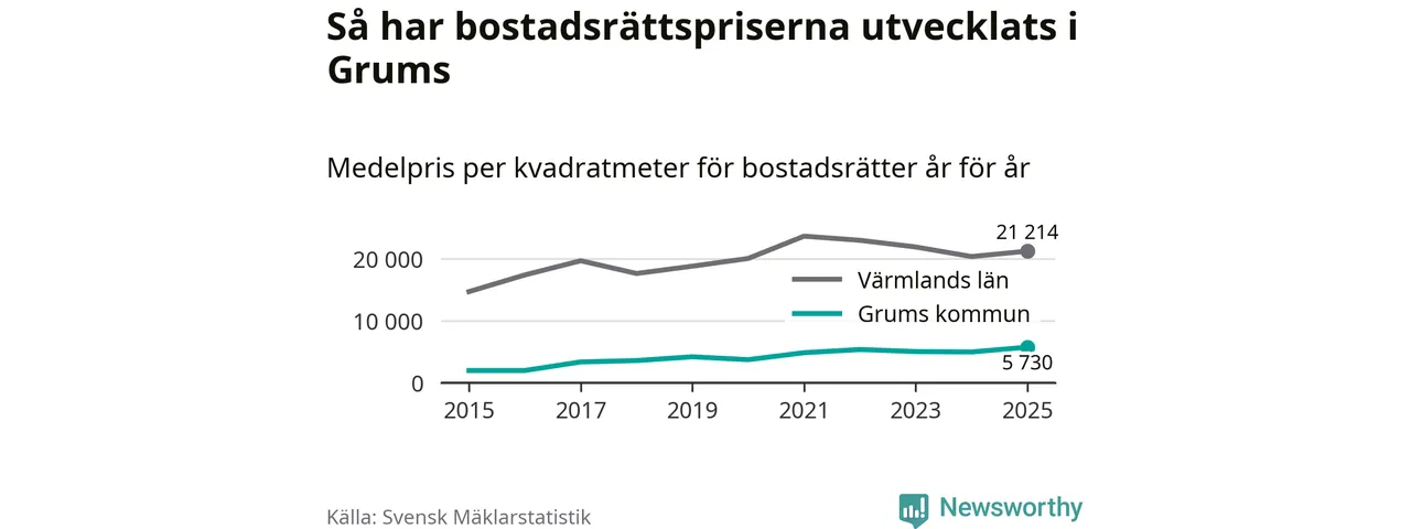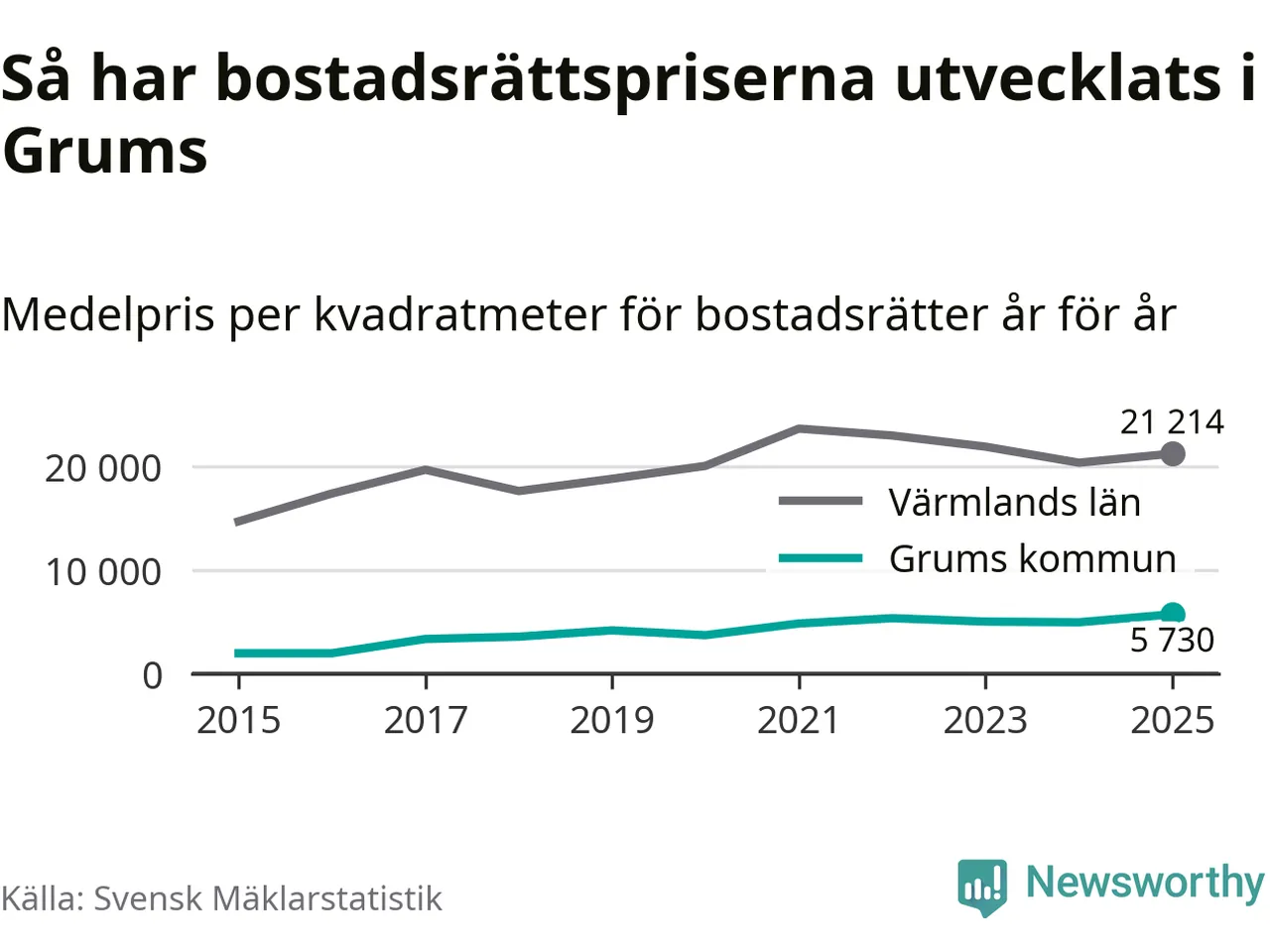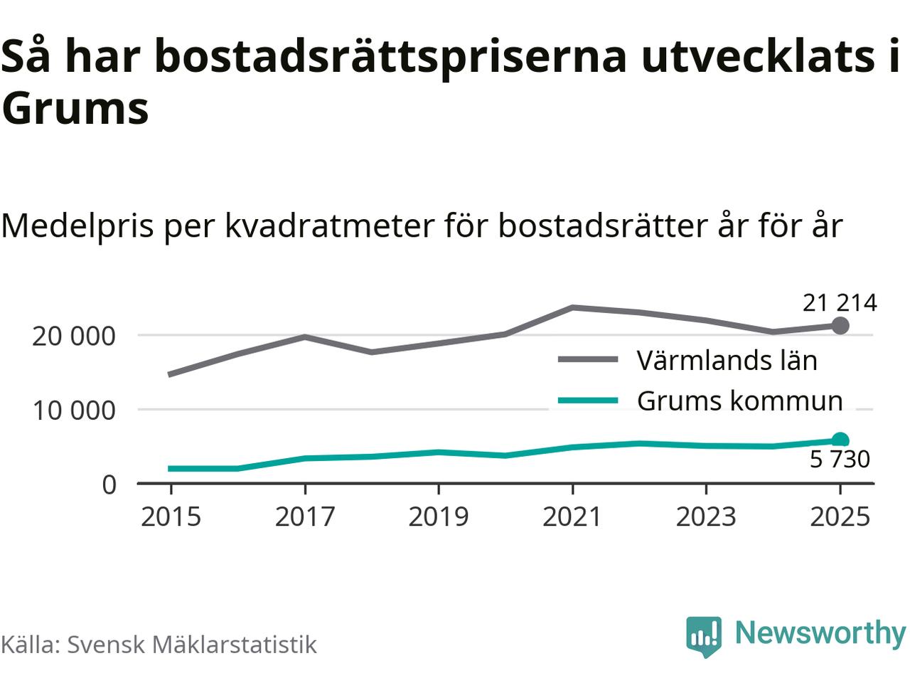 Det såldes totalt 30 bostadsrätter i Grums kommun under året. Genomsnittspriset per kvadratmeter landade på 5 730 kronor. Det är en ökning med 15 procent i kommunen på ett år och den högsta årsnivån på över ett decennium.