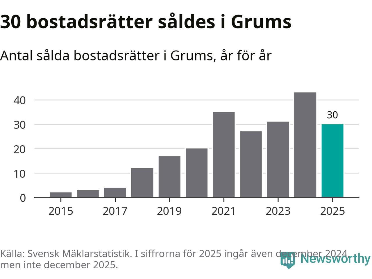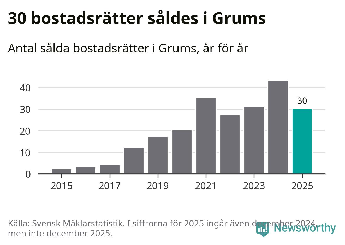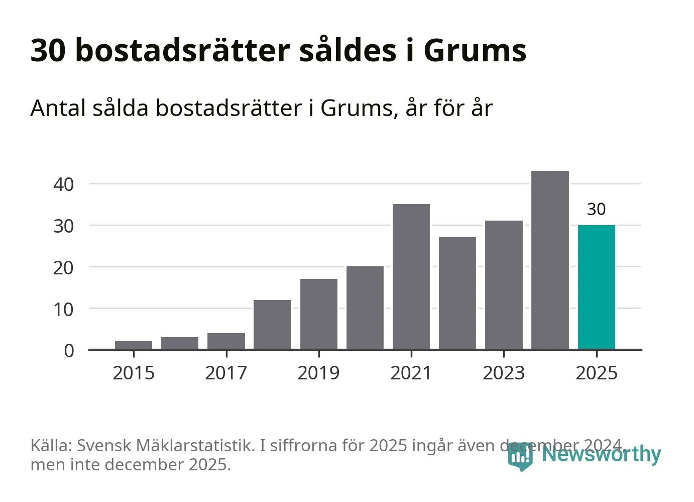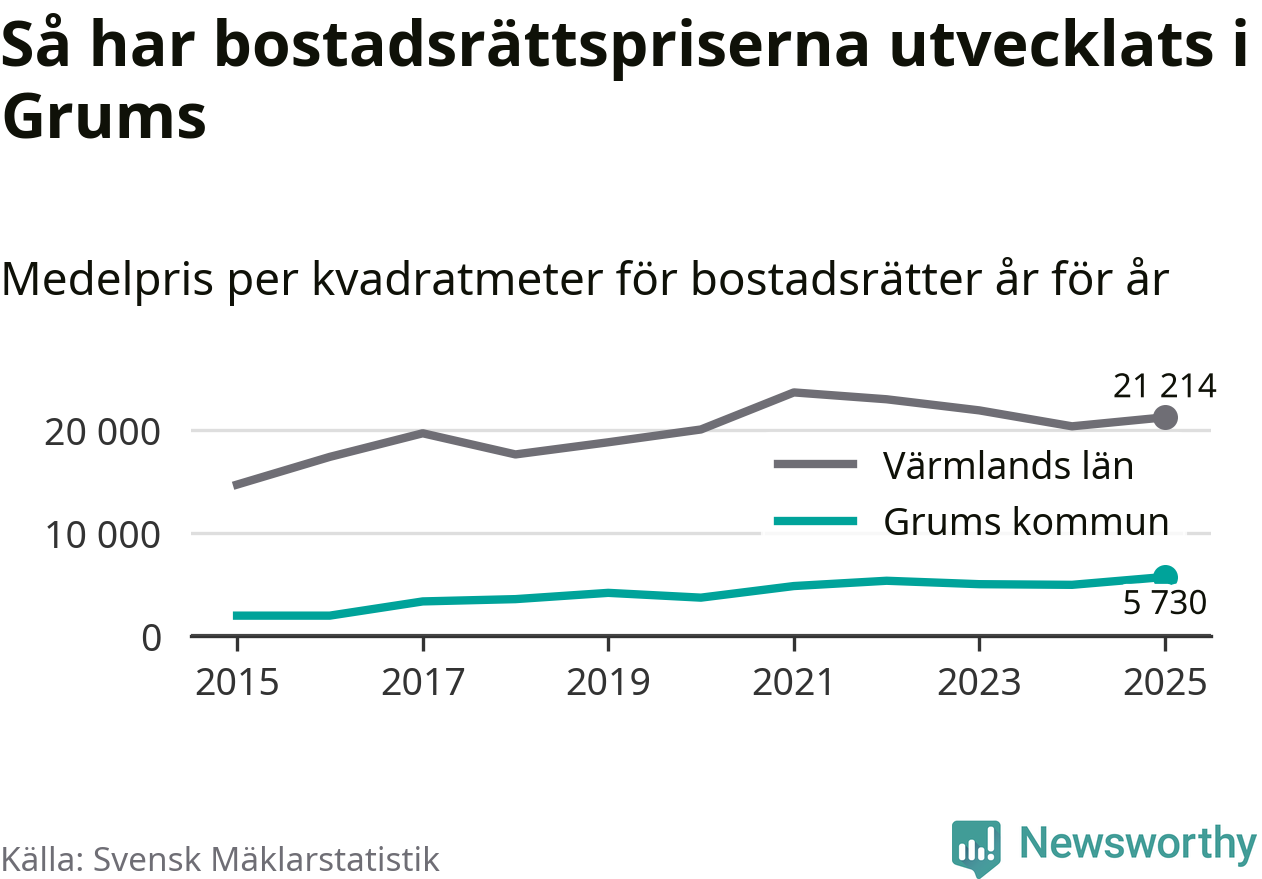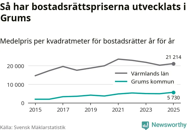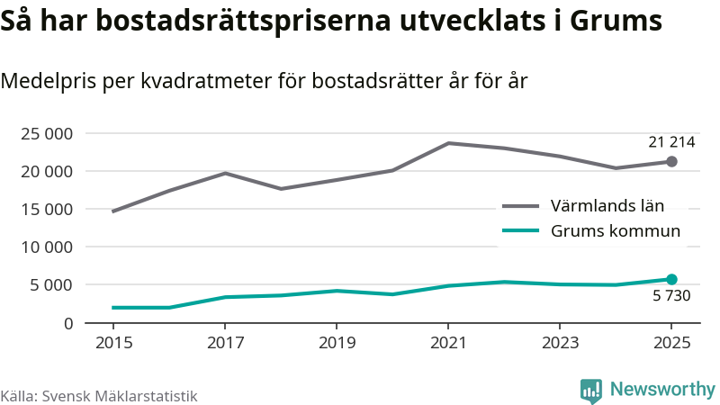 Det såldes totalt 30 bostadsrätter i Grums kommun under året. Genomsnittspriset per kvadratmeter landade på 5 730 kronor. Det är en ökning med 15 procent i kommunen på ett år och den högsta årsnivån på över ett decennium.