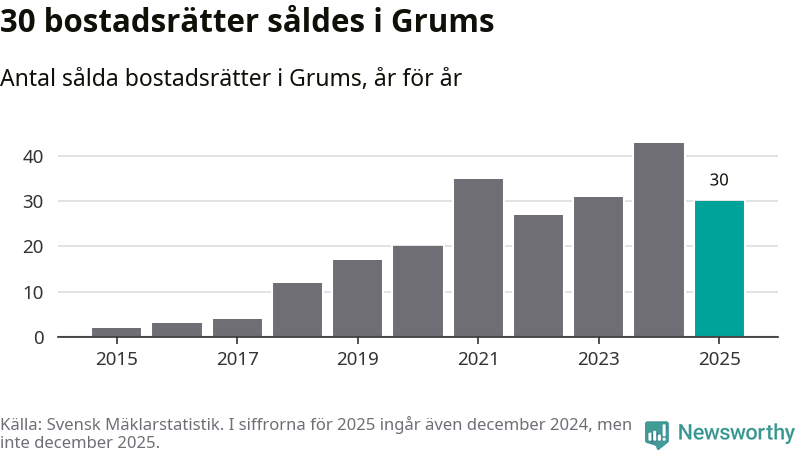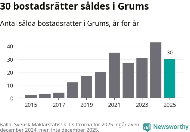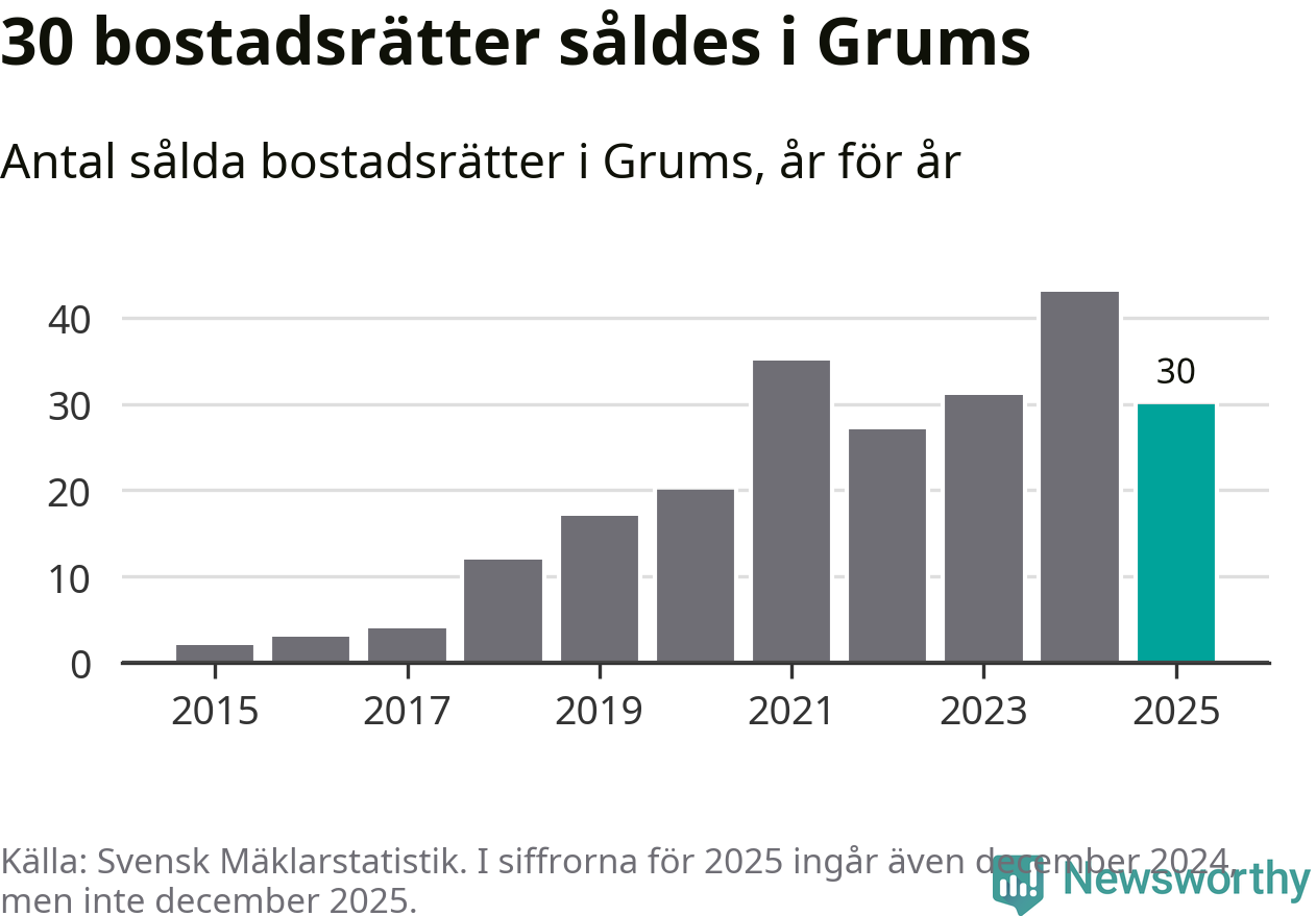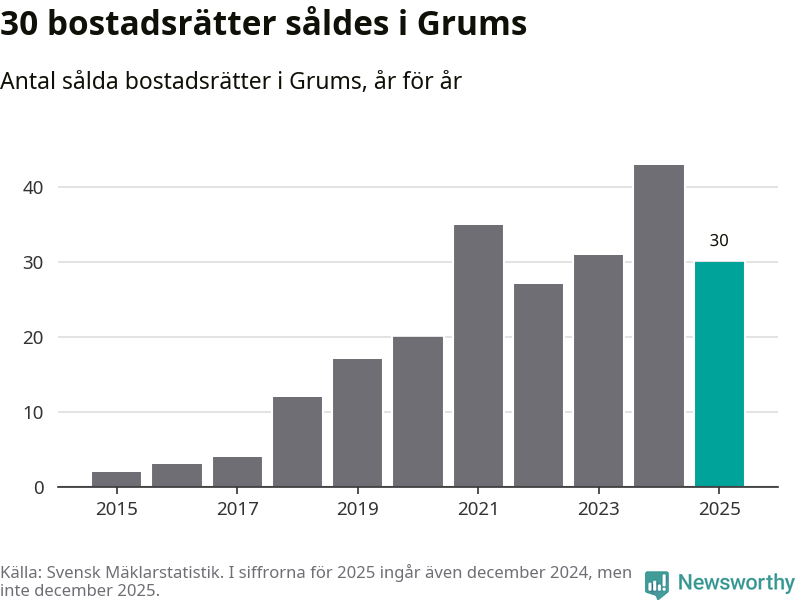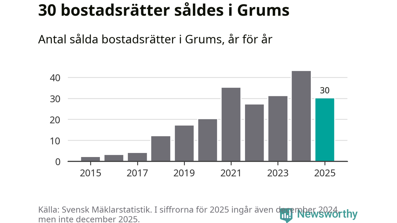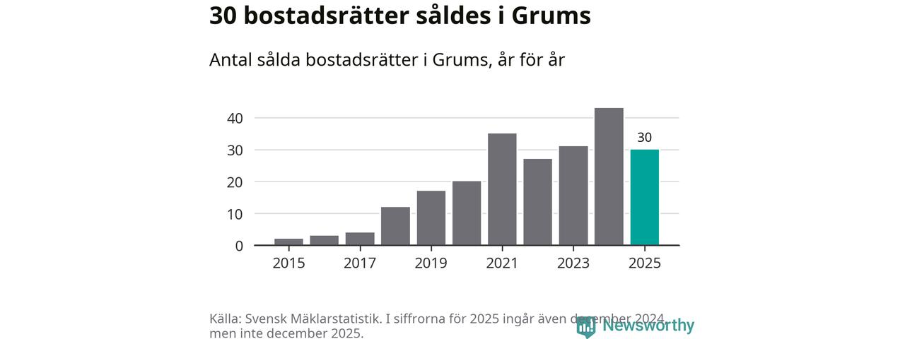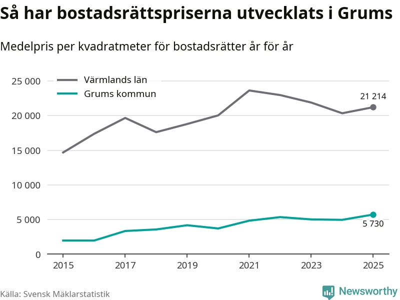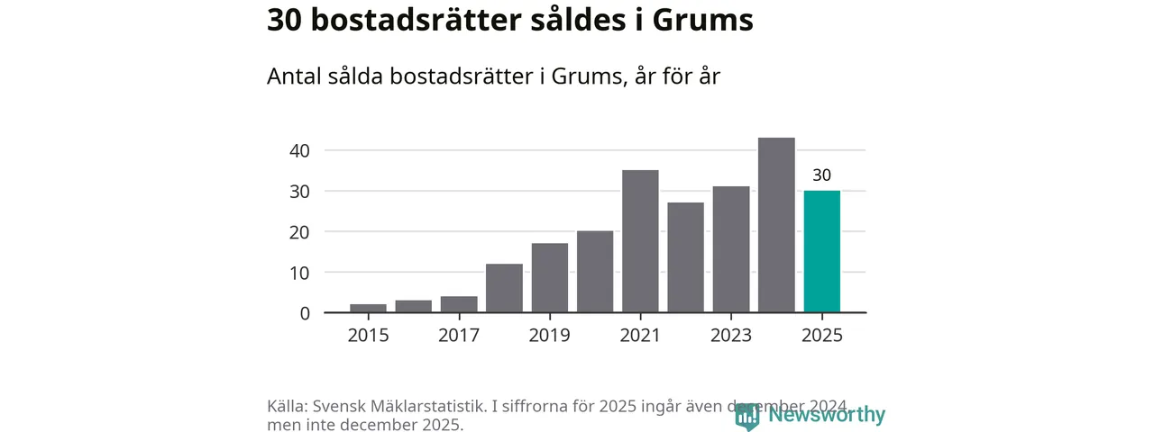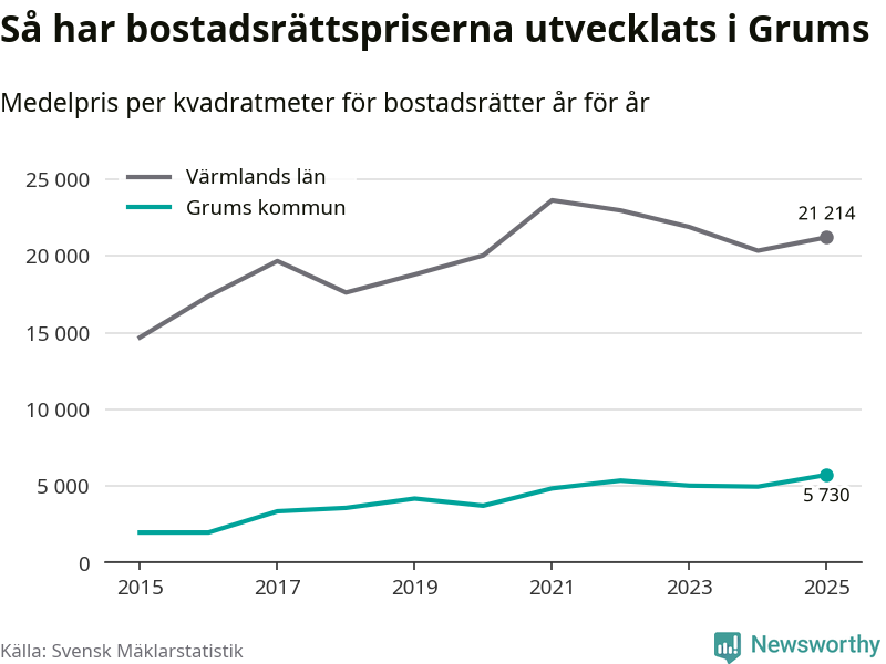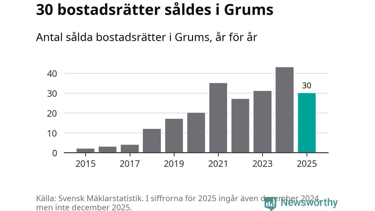 Det såldes totalt 30 bostadsrätter i Grums kommun under året. Genomsnittspriset per kvadratmeter landade på 5 730 kronor. Det är en ökning med 15 procent i kommunen på ett år och den högsta årsnivån på över ett decennium.