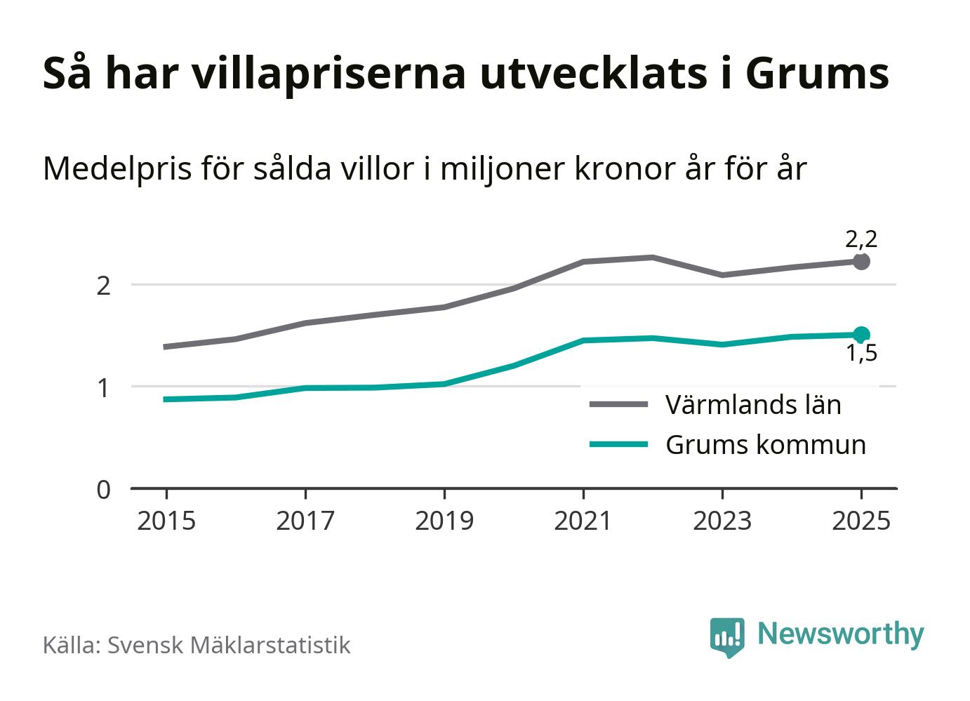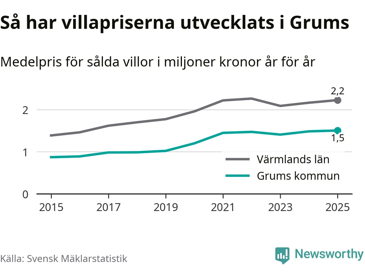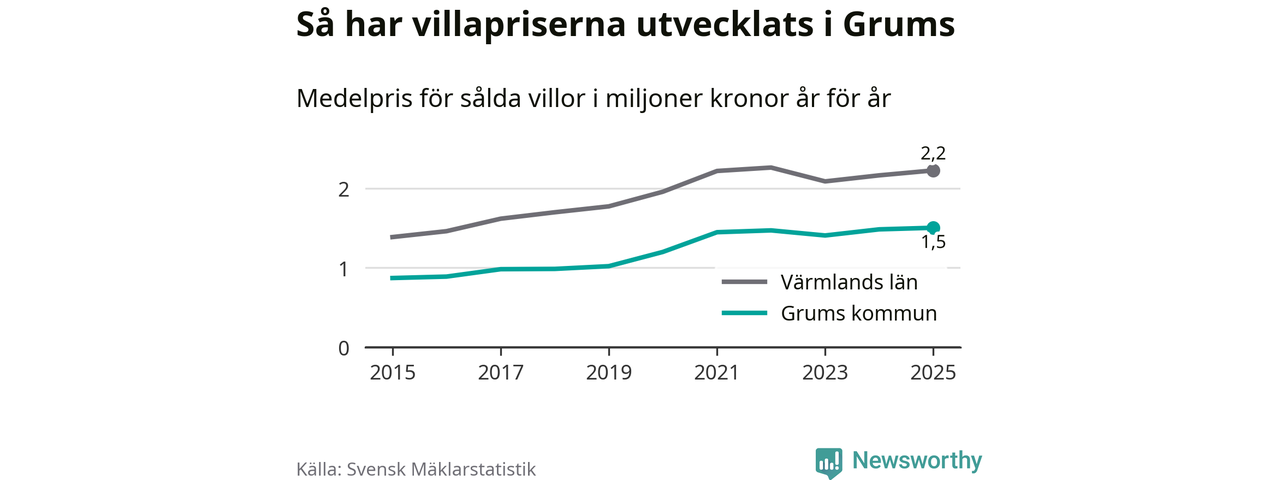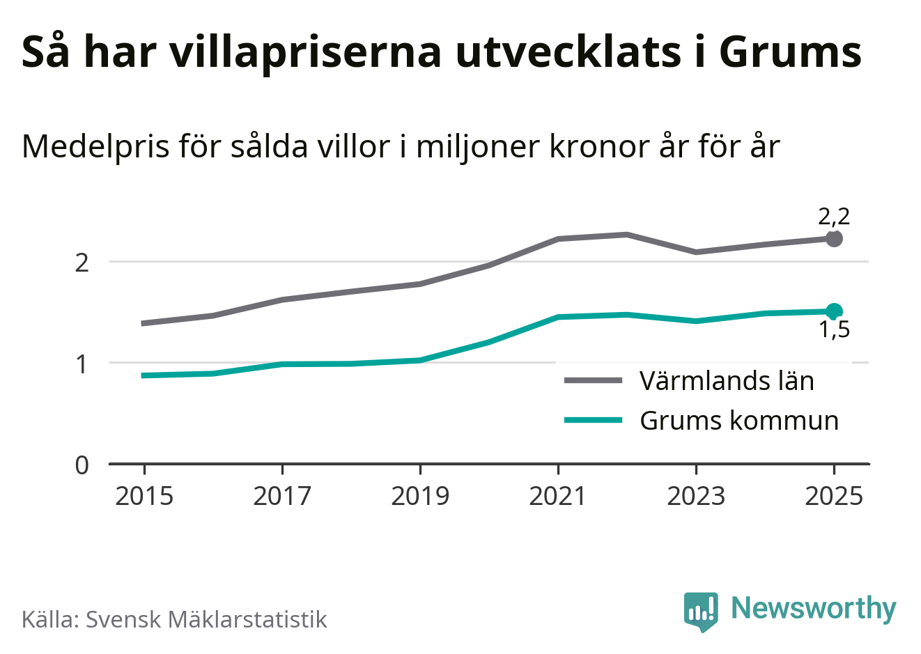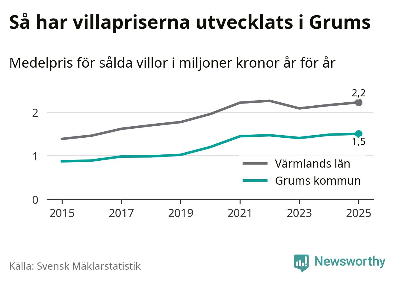 1,5 miljoner kronor är medelpriset för de villor som såldes i Grums kommun under året, eller 13 199 kronor per kvadratmeter. Det innebär en prisökning med en procent på ett år. Det är det högsta årssnittet på åtminstone tio år.