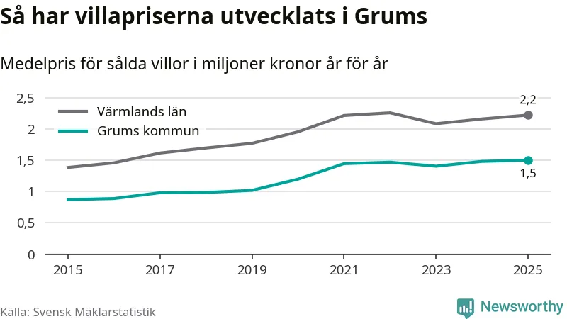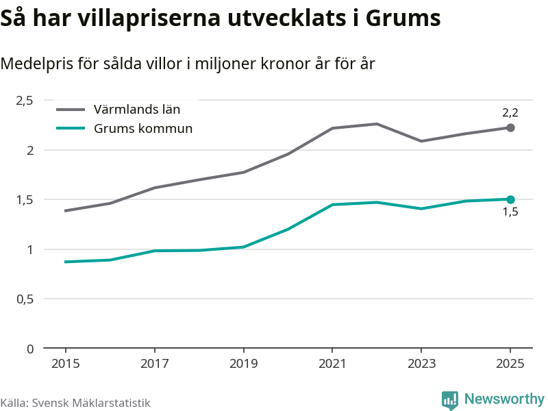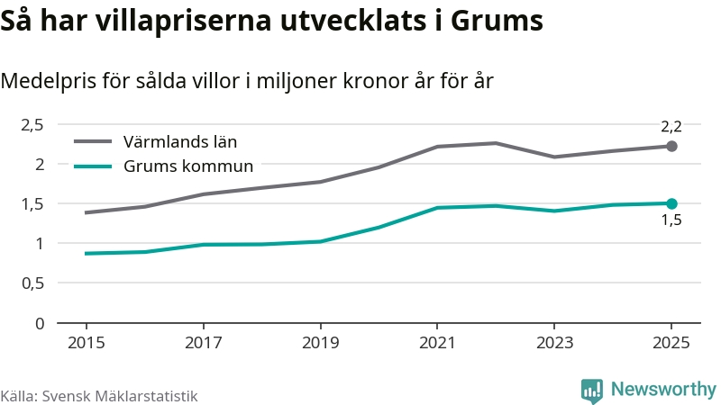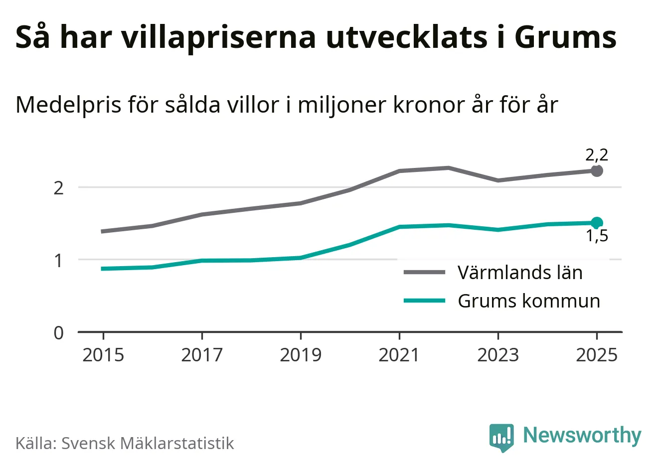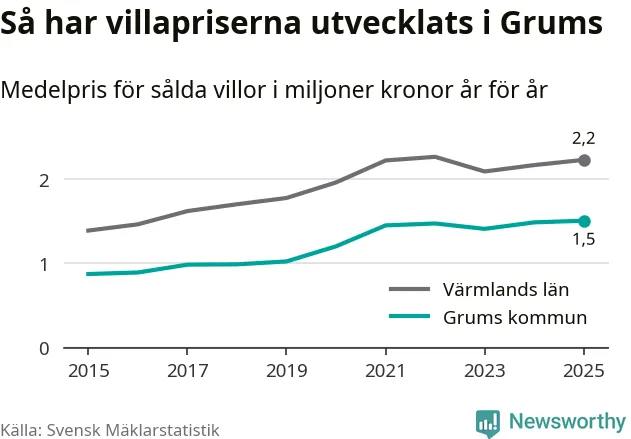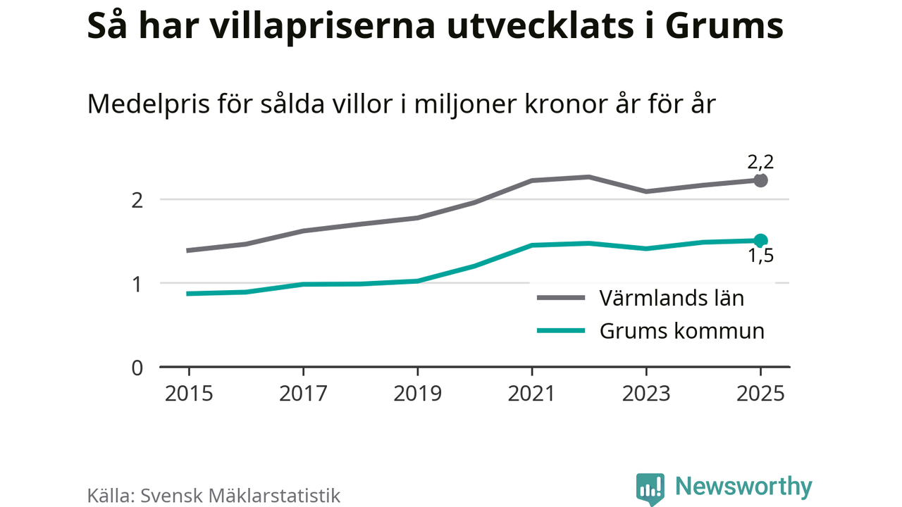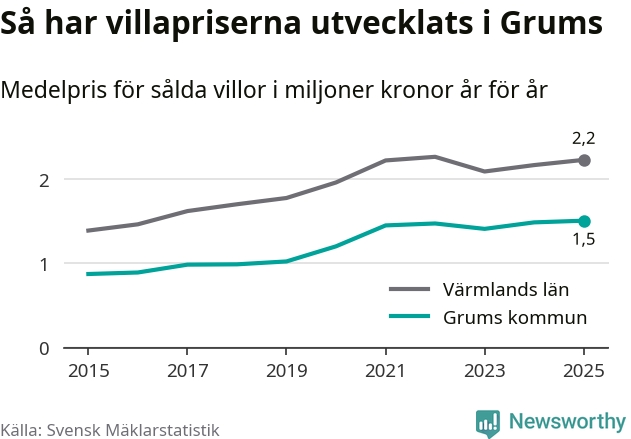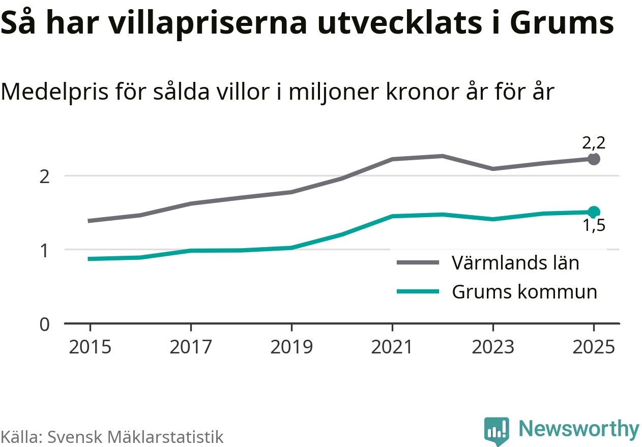 1,5 miljoner kronor är medelpriset för de villor som såldes i Grums kommun under året, eller 13 199 kronor per kvadratmeter. Det innebär en prisökning med en procent på ett år. Det är det högsta årssnittet på åtminstone tio år.