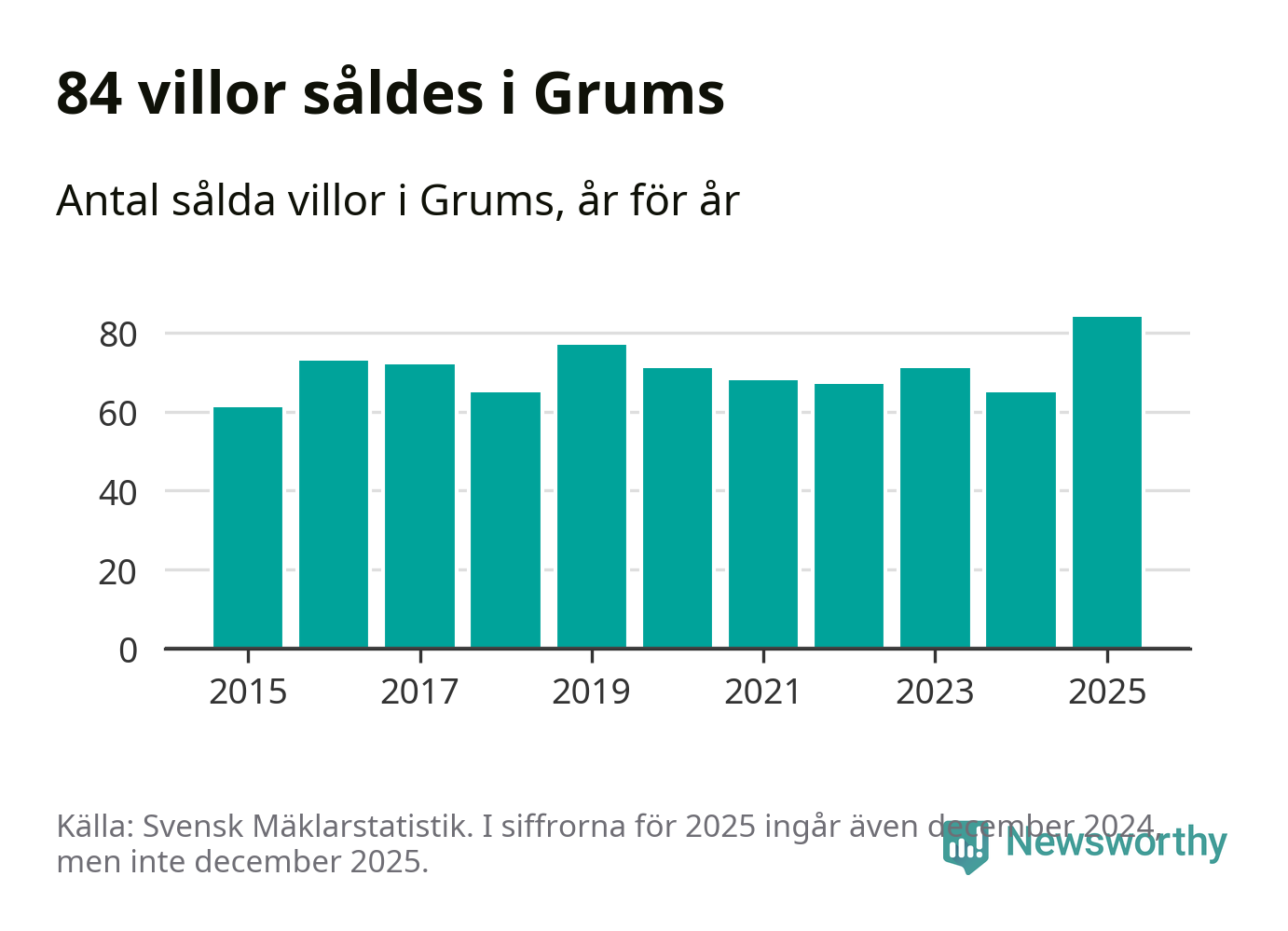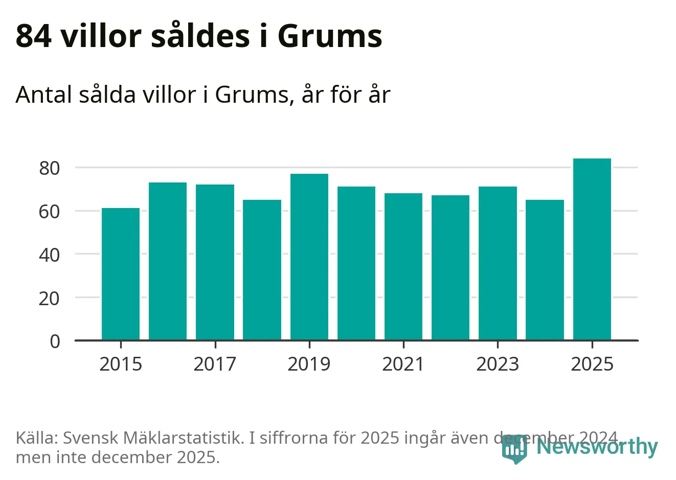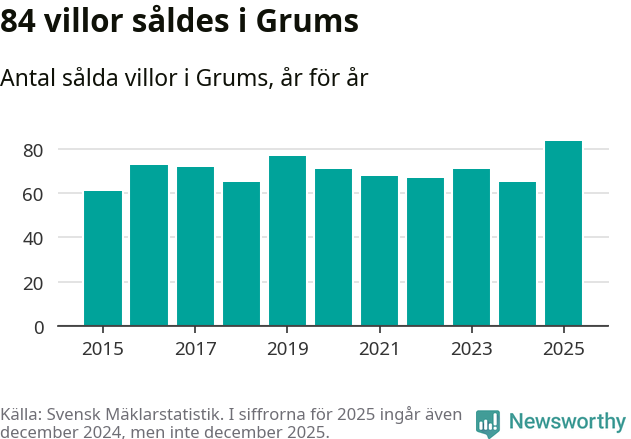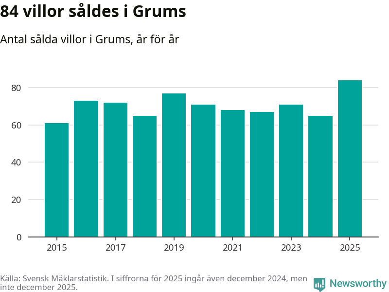 Antalet sålda villor ökade också. Totalt såldes 84 villor, att jämföra med 65 under 2024. Det är fler än något annat år sedan 2015.