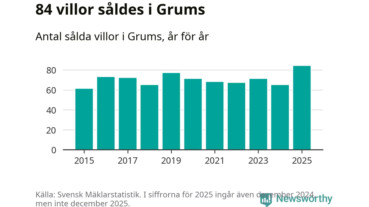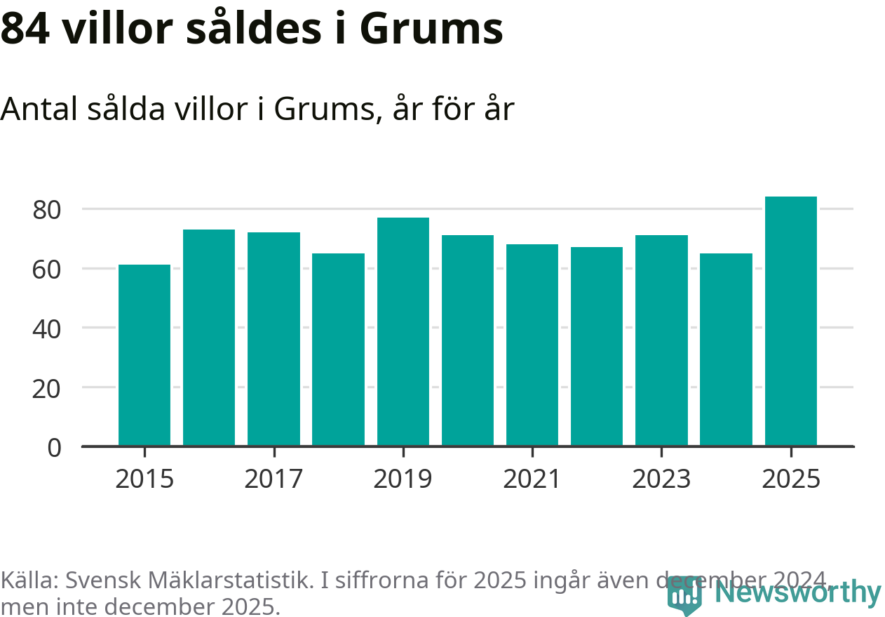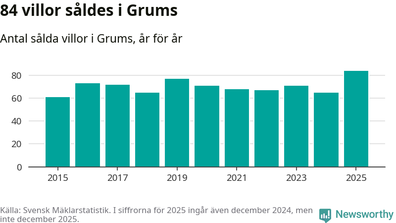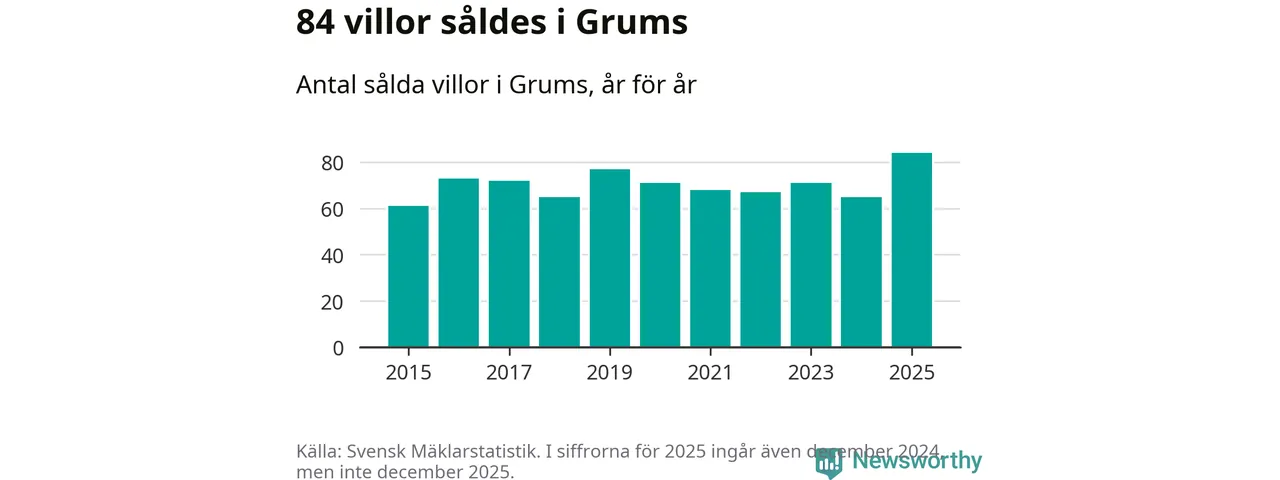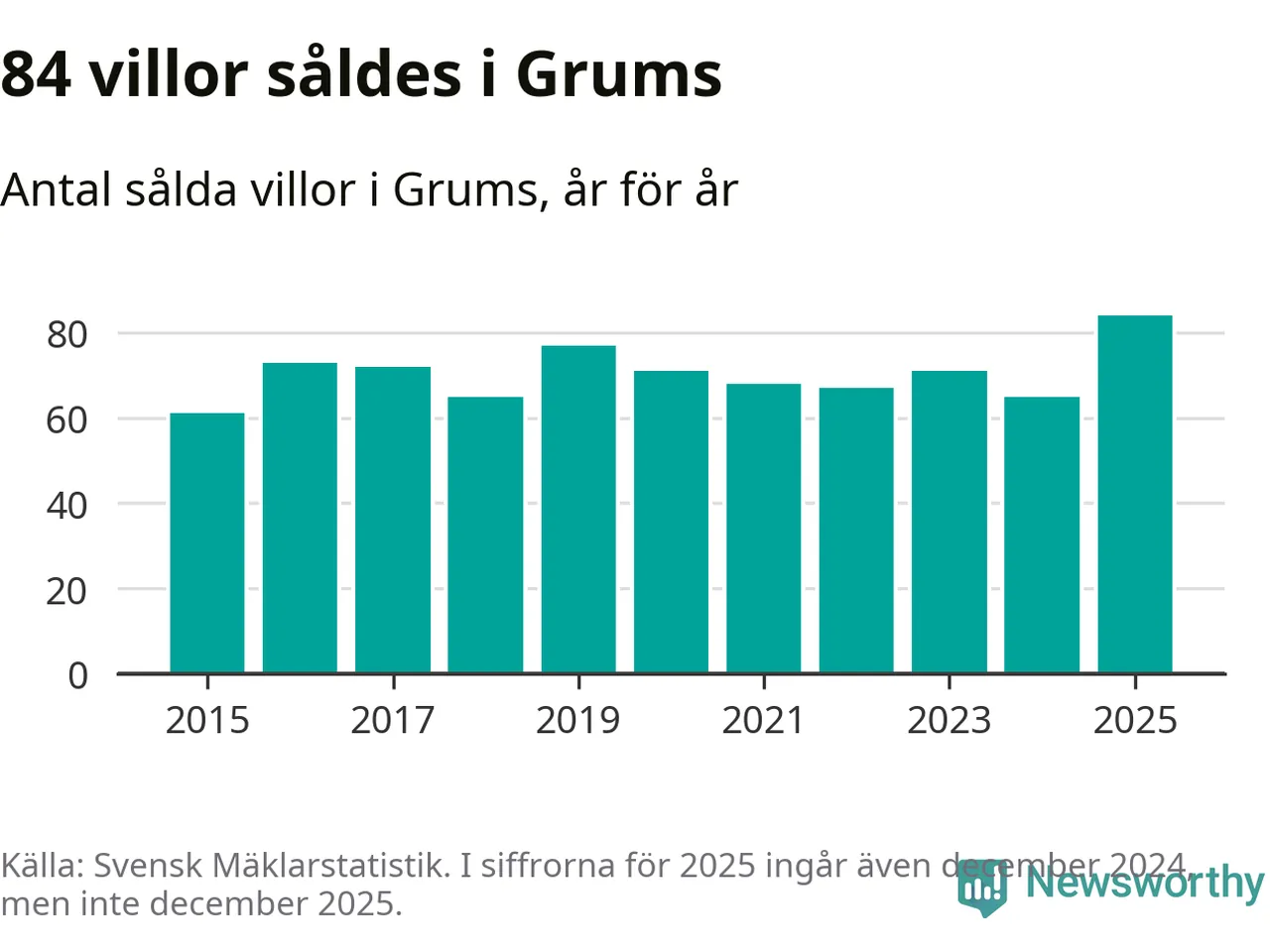 Antalet sålda villor ökade också. Totalt såldes 84 villor, att jämföra med 65 under 2024. Det är fler än något annat år sedan 2015.