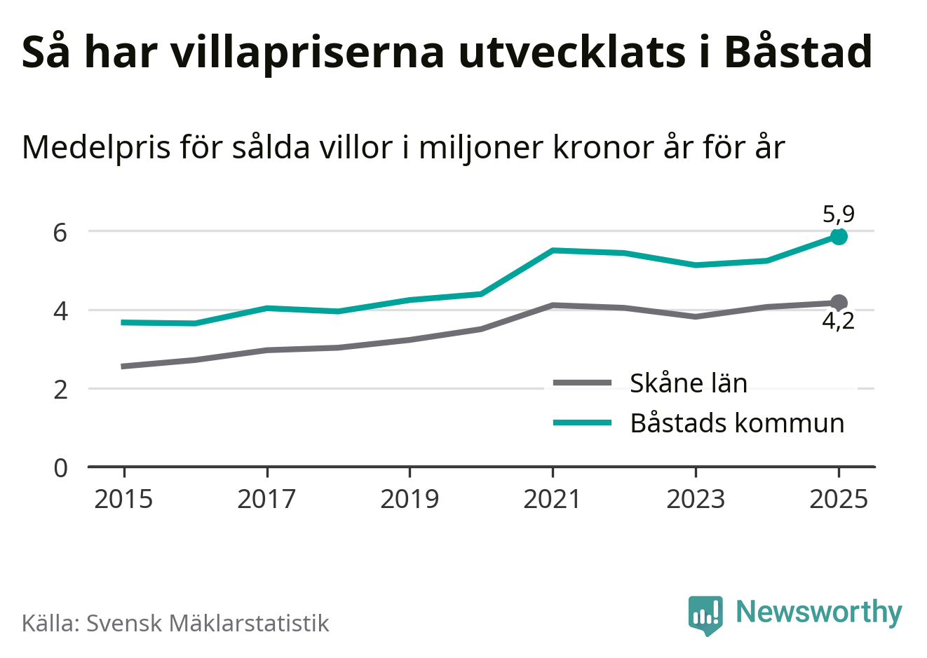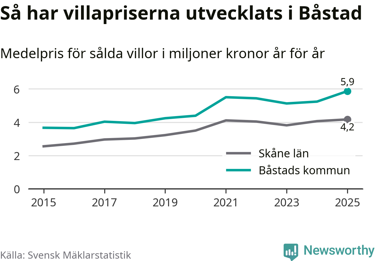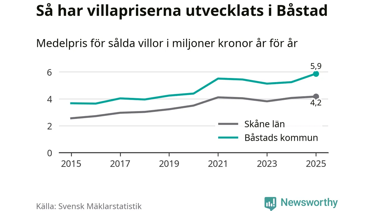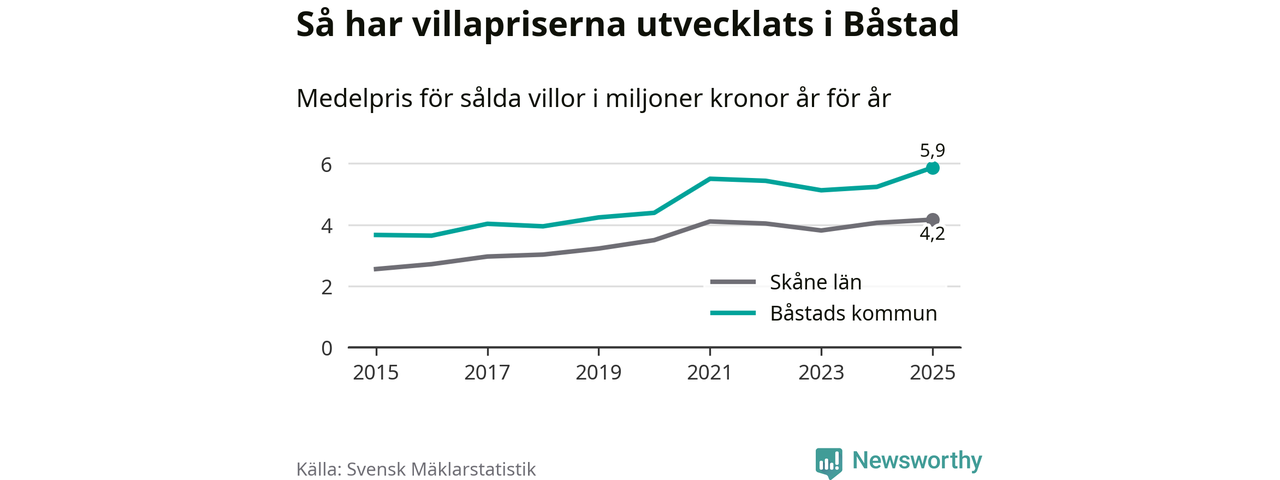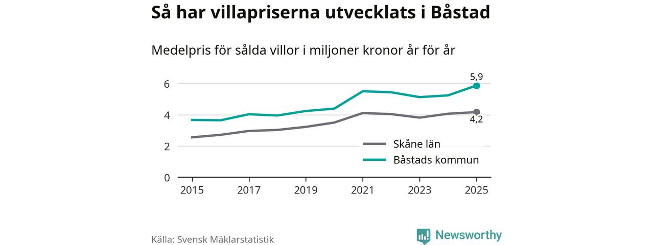 5,9 miljoner kronor är medelpriset för de villor som såldes i Båstads kommun under året, eller 45 213 kronor per kvadratmeter. Det innebär en prisökning med tolv procent på ett år. Det är det högsta årssnittet på åtminstone tio år.