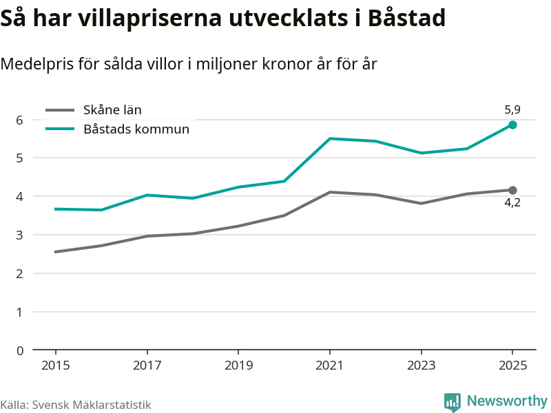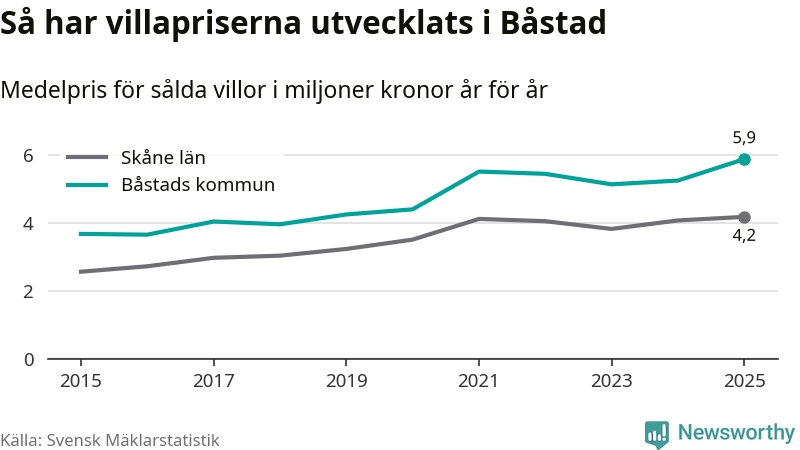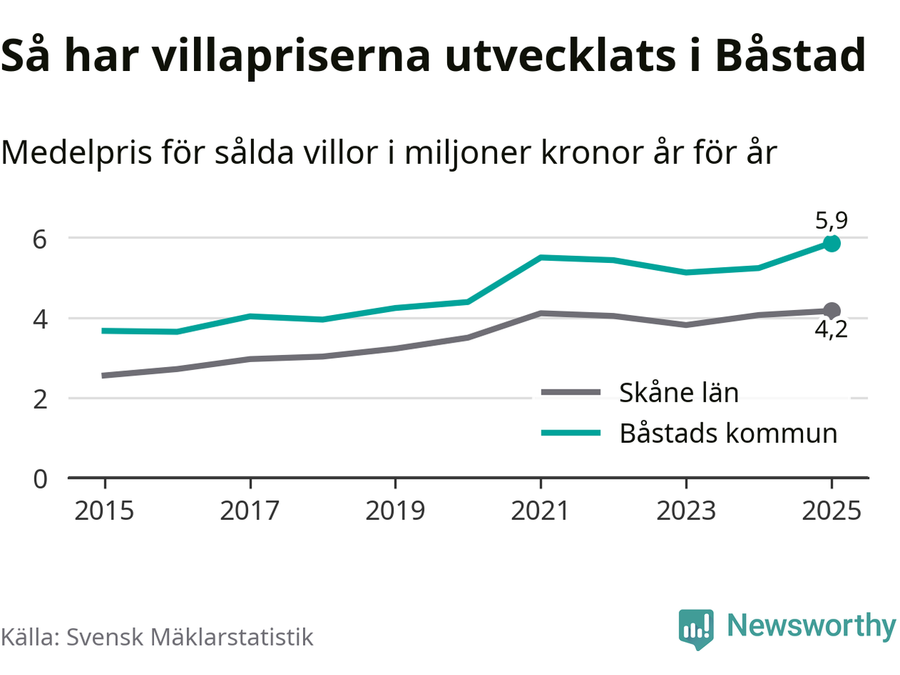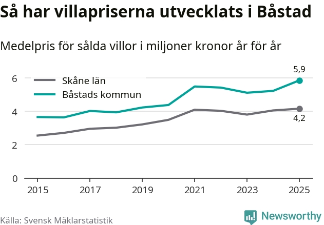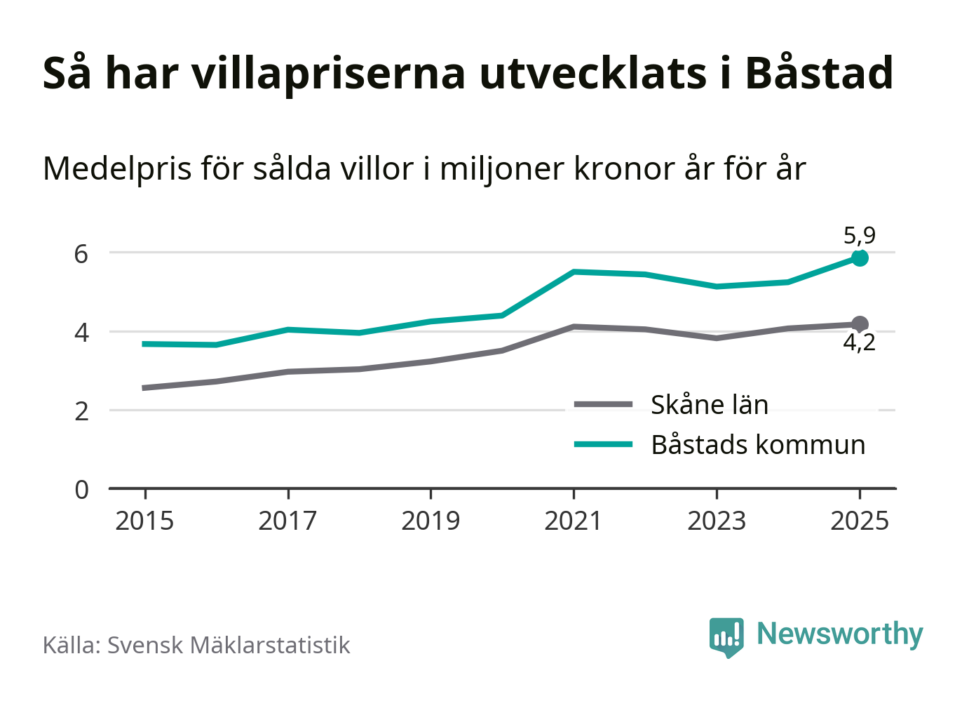 5,9 miljoner kronor är medelpriset för de villor som såldes i Båstads kommun under året, eller 45 213 kronor per kvadratmeter. Det innebär en prisökning med tolv procent på ett år. Det är det högsta årssnittet på åtminstone tio år.