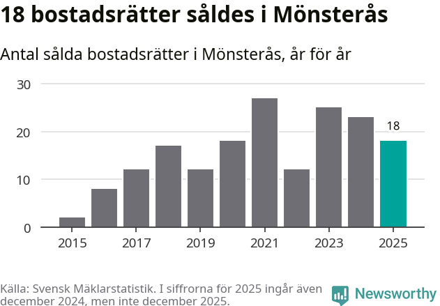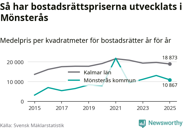 När det gäller bostadsrätter i Mönsterås kommun såldes 18 under året. Snittet per kvadratmeter landade på omkring 10 900 kronor. Det är en minskning jämfört med förra året.