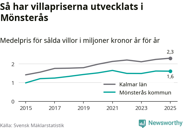 1,6 miljoner kronor är medelpriset för de villor som såldes i Mönsterås kommun under året, eller 14 878 kronor per kvadratmeter. Det innebär att priserna har legat i stort sett stilla sedan förra året.