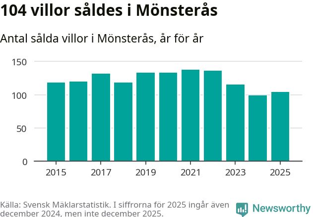 Däremot ökade antalet sålda villor. Totalt såldes 104 villor, att jämföra med 99 under 2024.