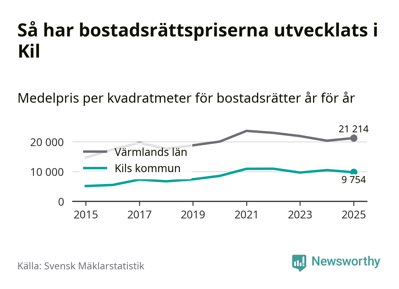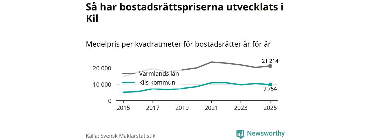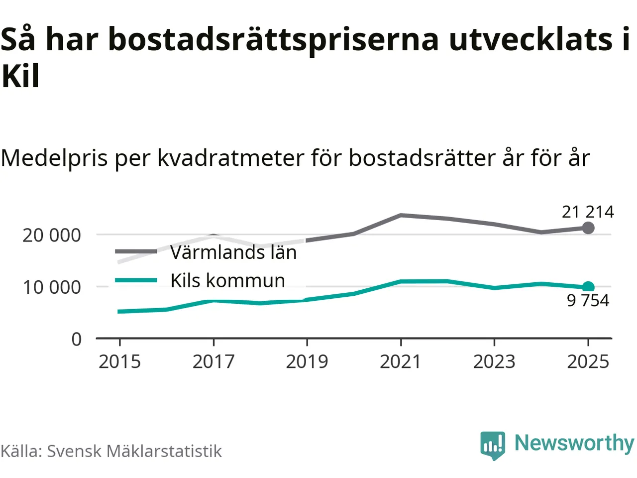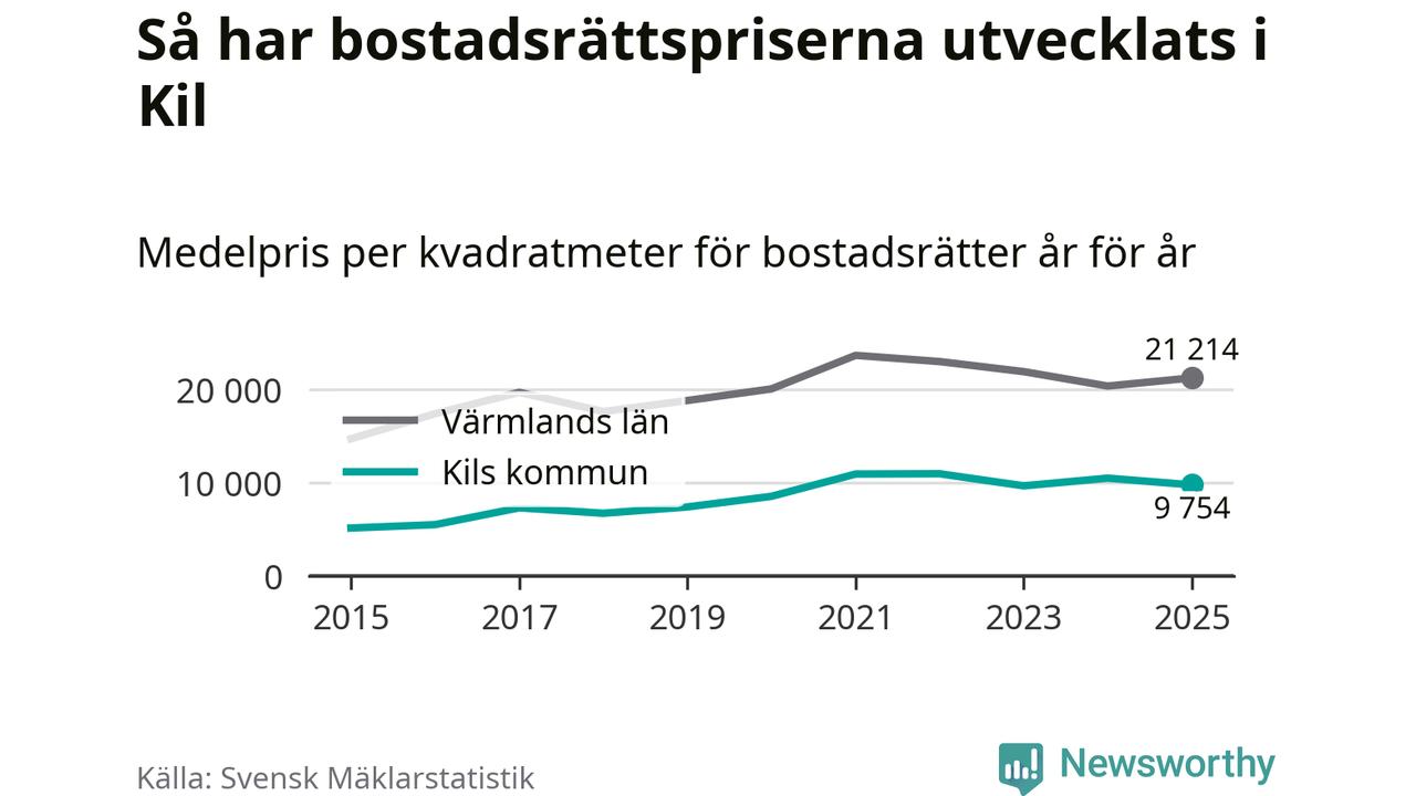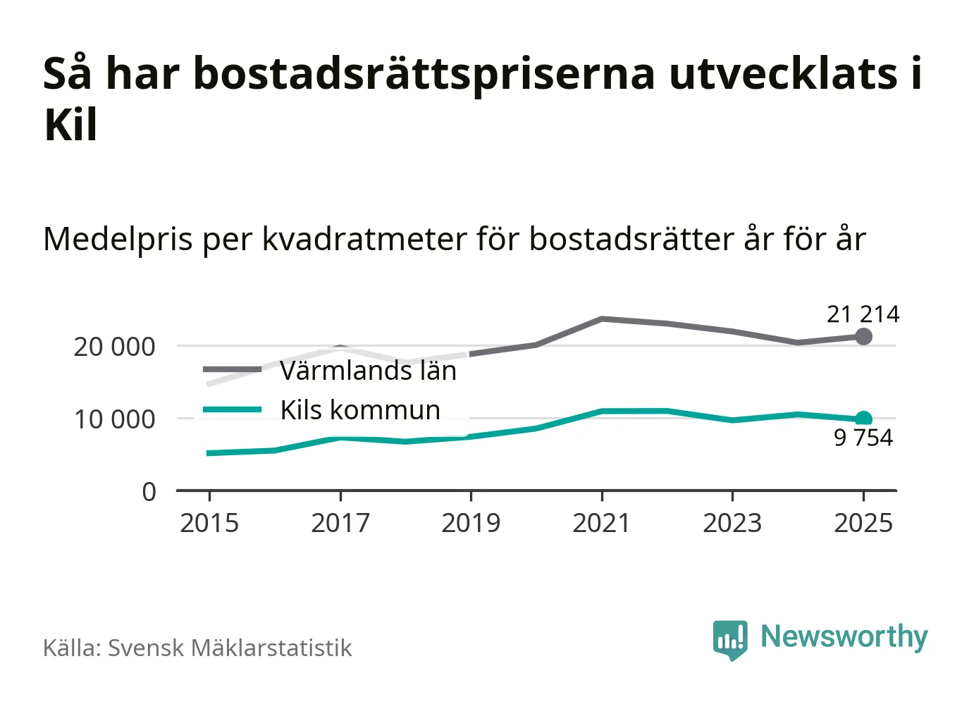 Det såldes totalt 47 bostadsrätter i Kils kommun under året. Genomsnittspriset per kvadratmeter landade på 9 754 kronor. Det är en minskning med sju procent i kommunen på ett år.