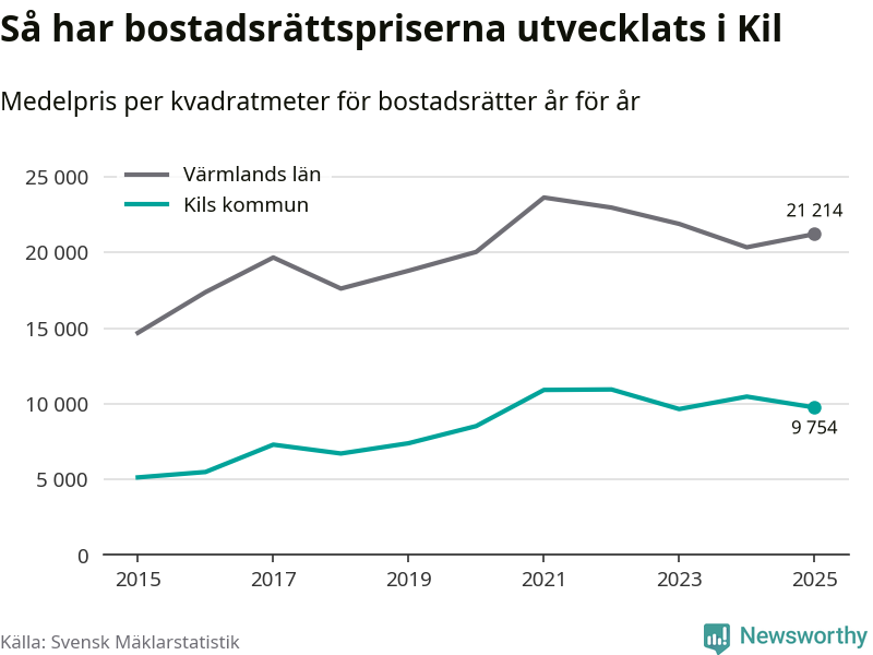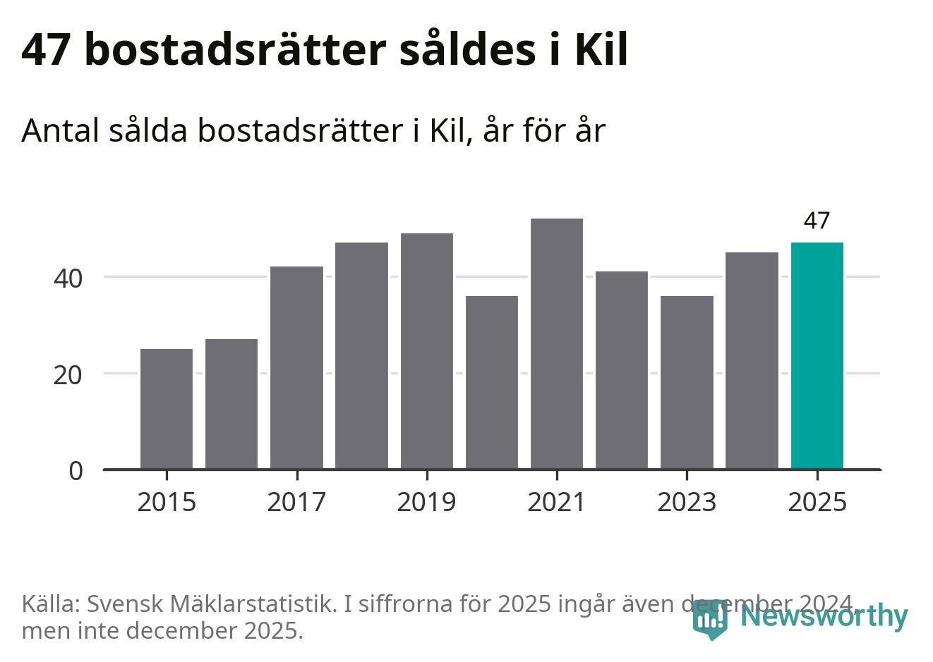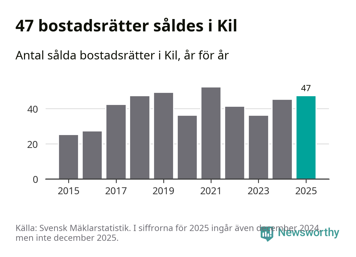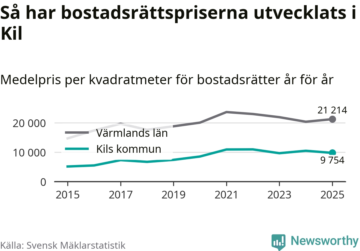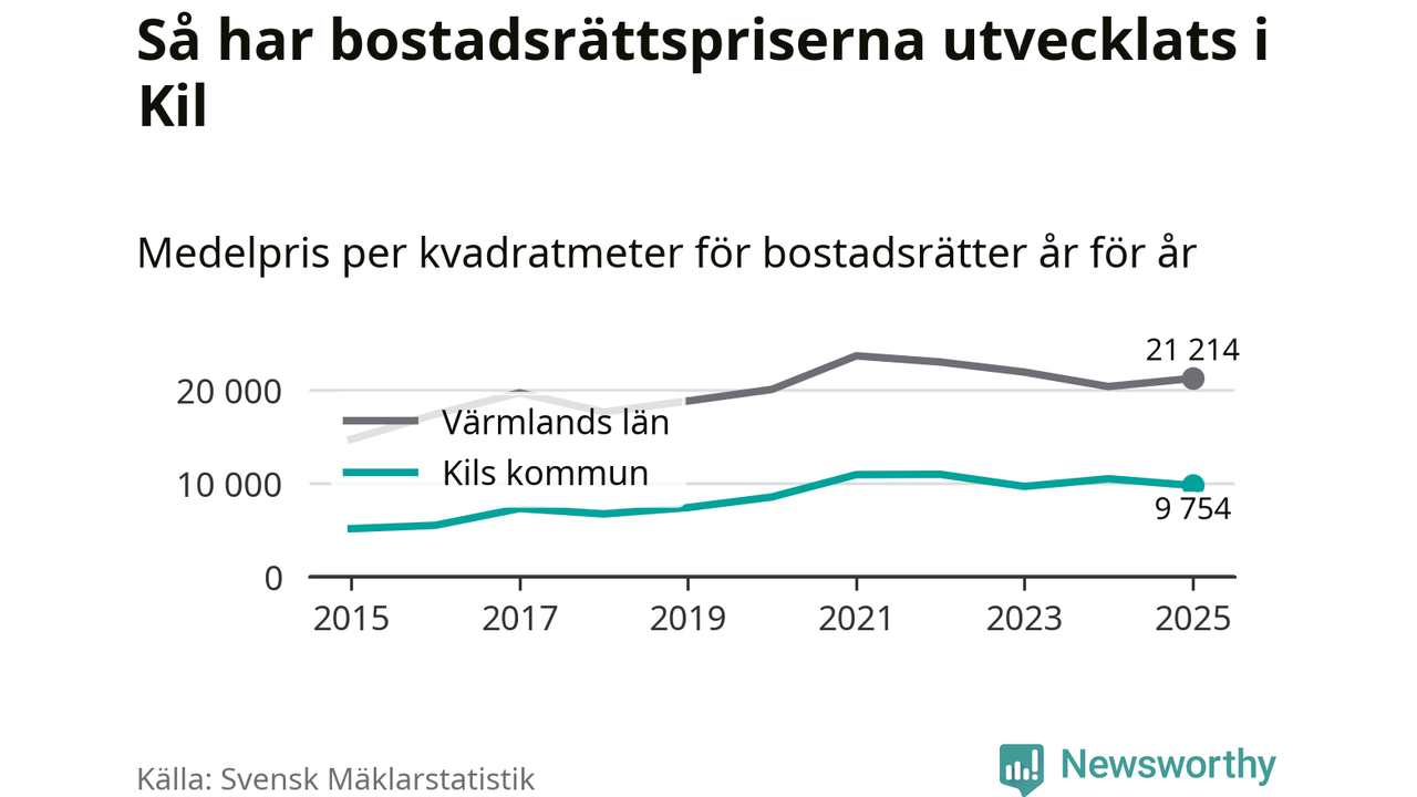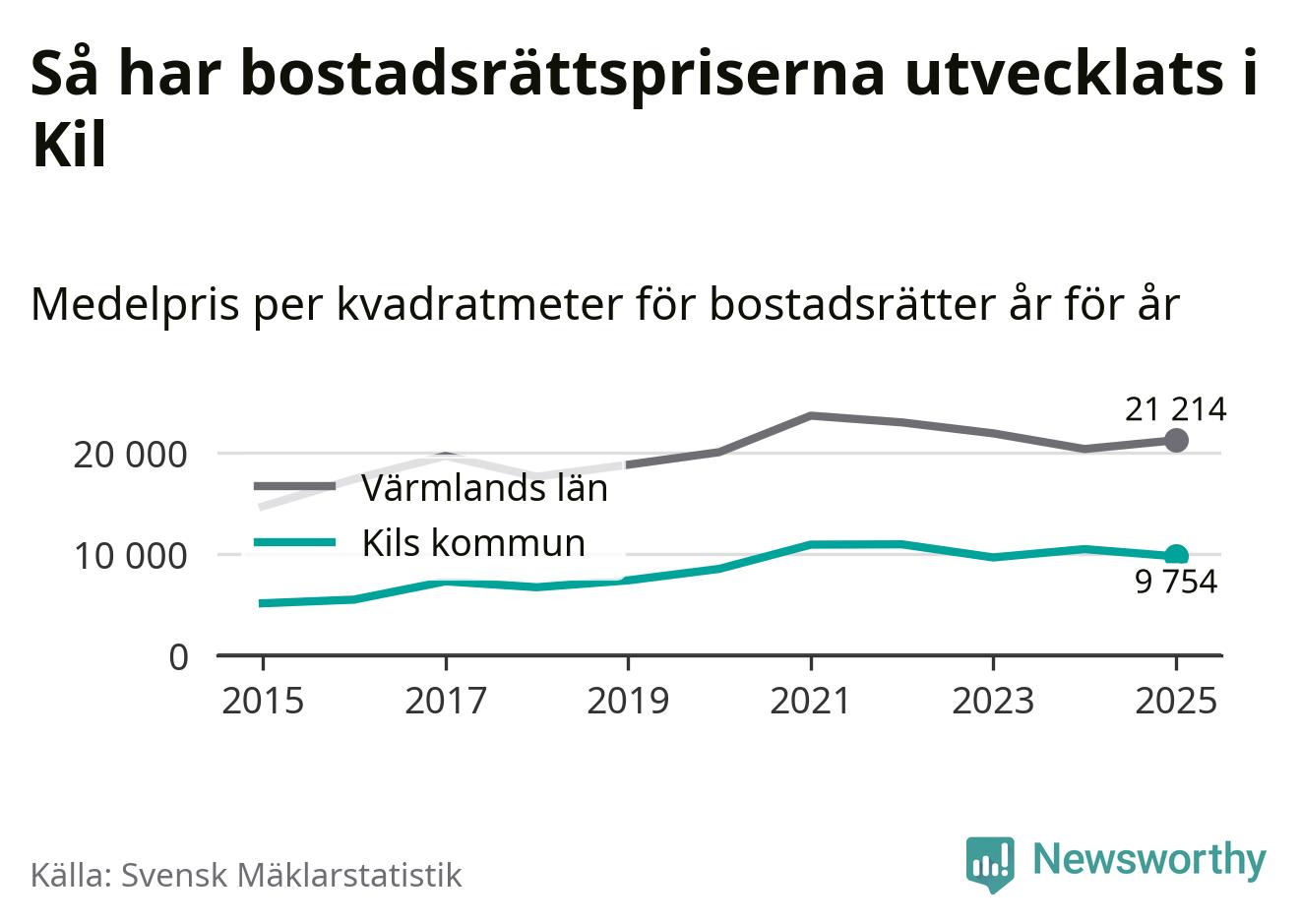 Det såldes totalt 47 bostadsrätter i Kils kommun under året. Genomsnittspriset per kvadratmeter landade på 9 754 kronor. Det är en minskning med sju procent i kommunen på ett år.
