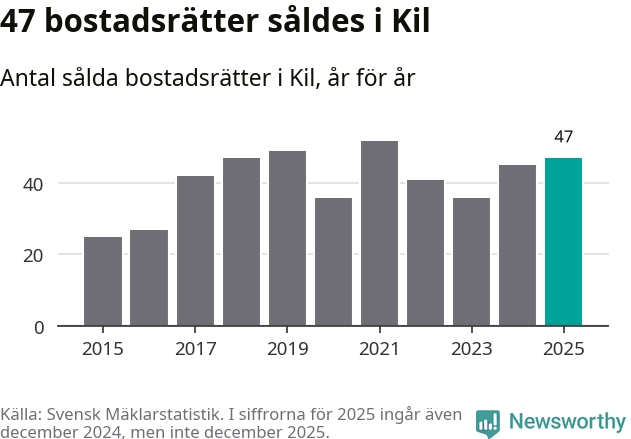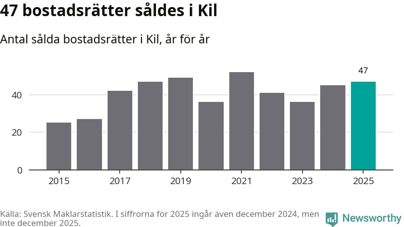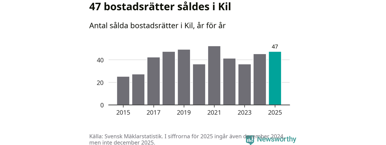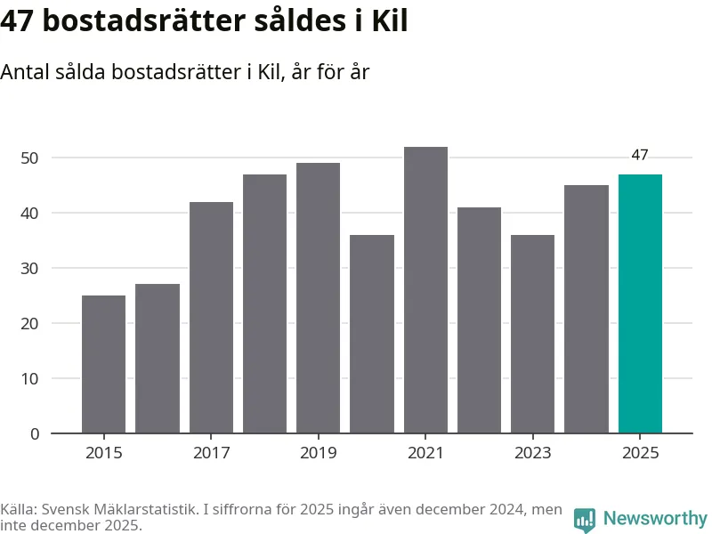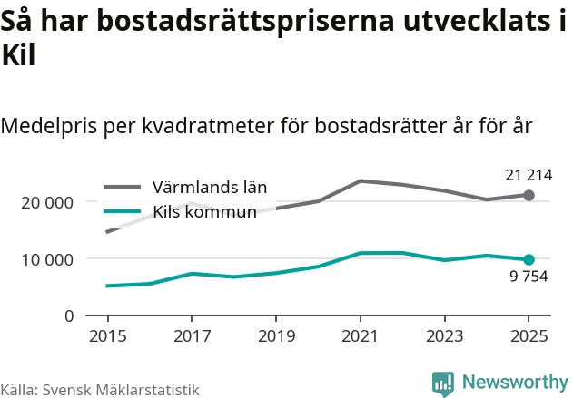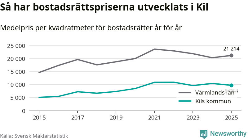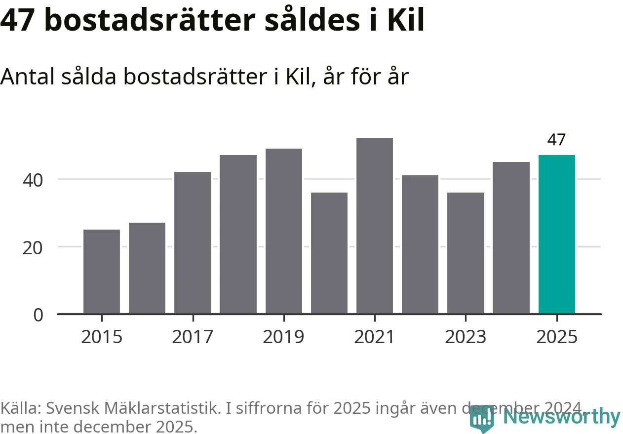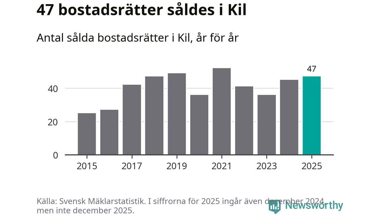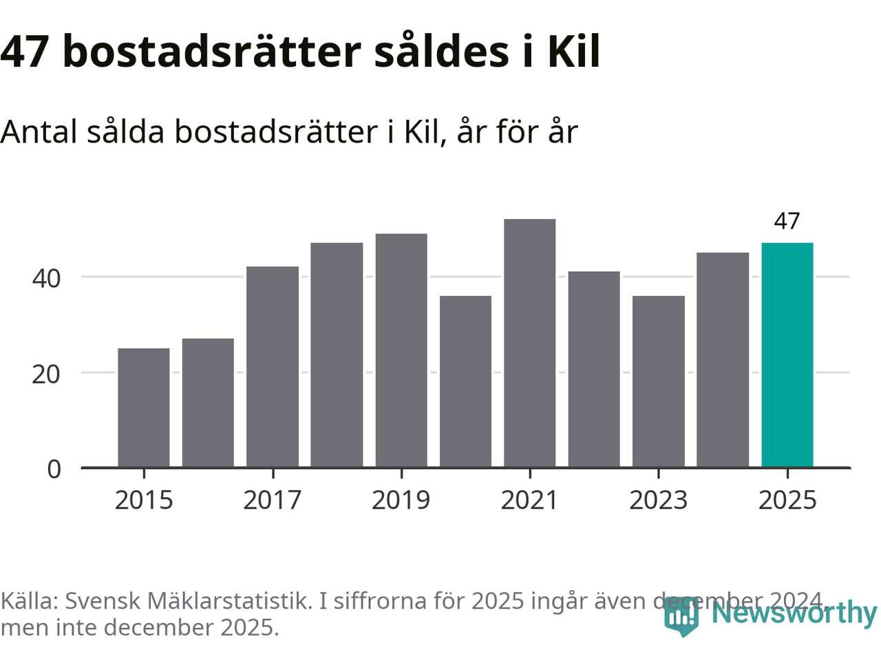 Det såldes totalt 47 bostadsrätter i Kils kommun under året. Genomsnittspriset per kvadratmeter landade på 9 754 kronor. Det är en minskning med sju procent i kommunen på ett år.