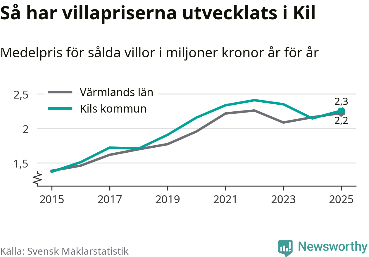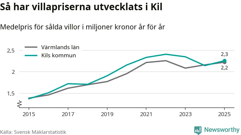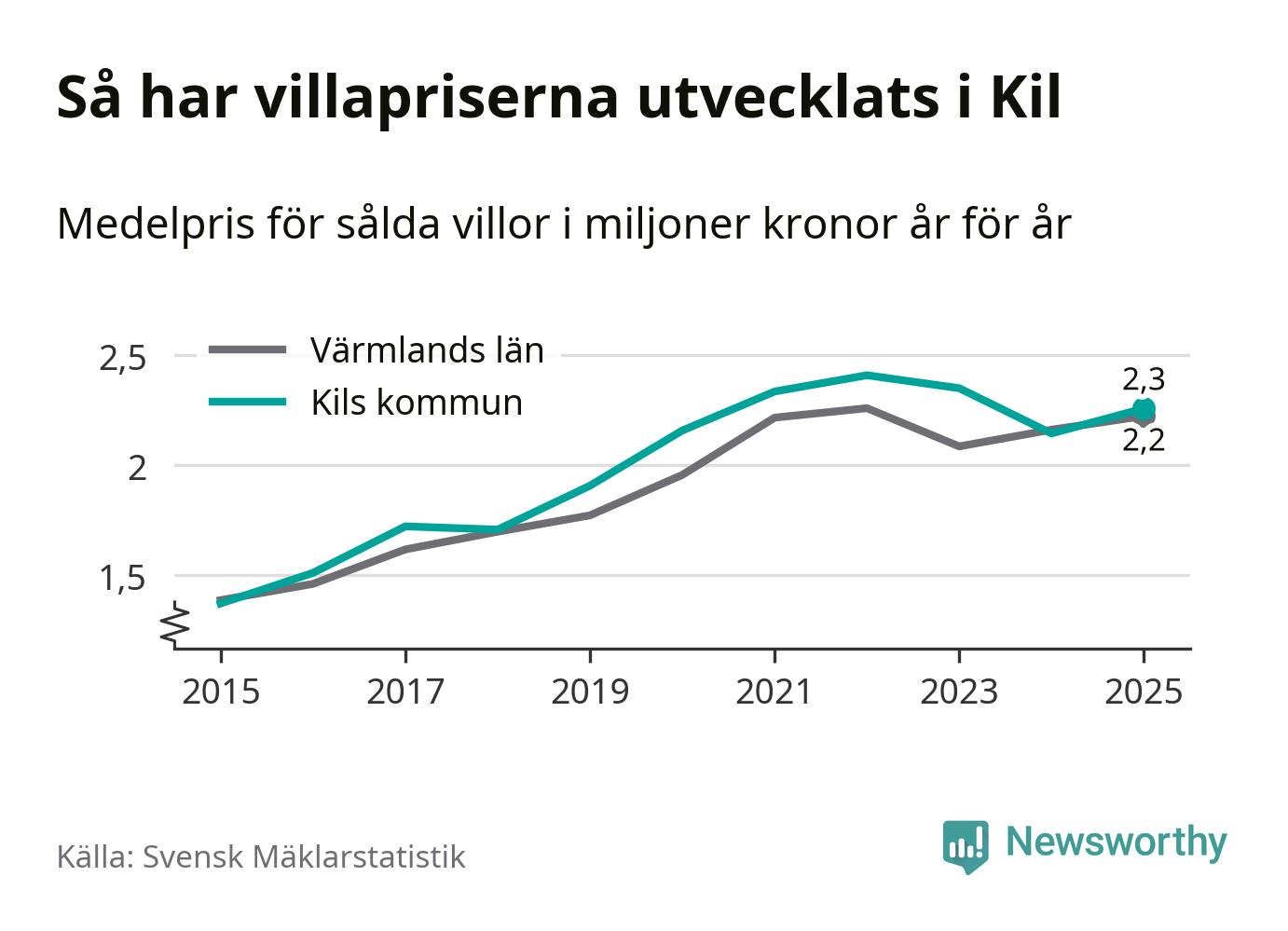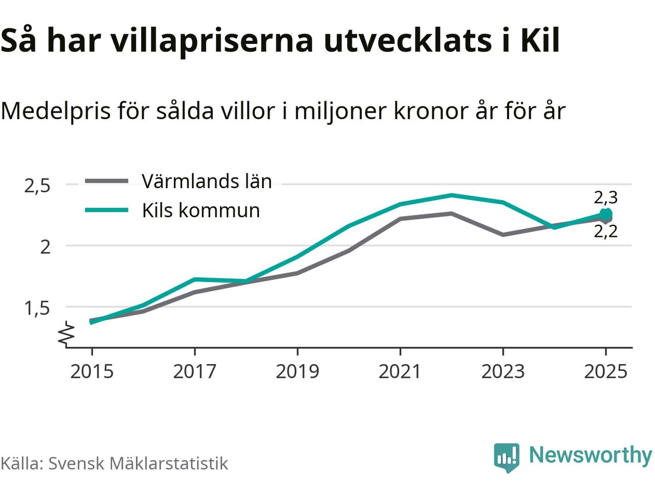 2,3 miljoner kronor är medelpriset för de villor som såldes i Kils kommun under året, eller 18 509 kronor per kvadratmeter. Det innebär en prisökning med fem procent på ett år.