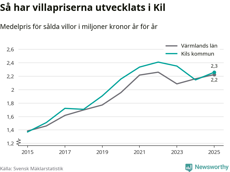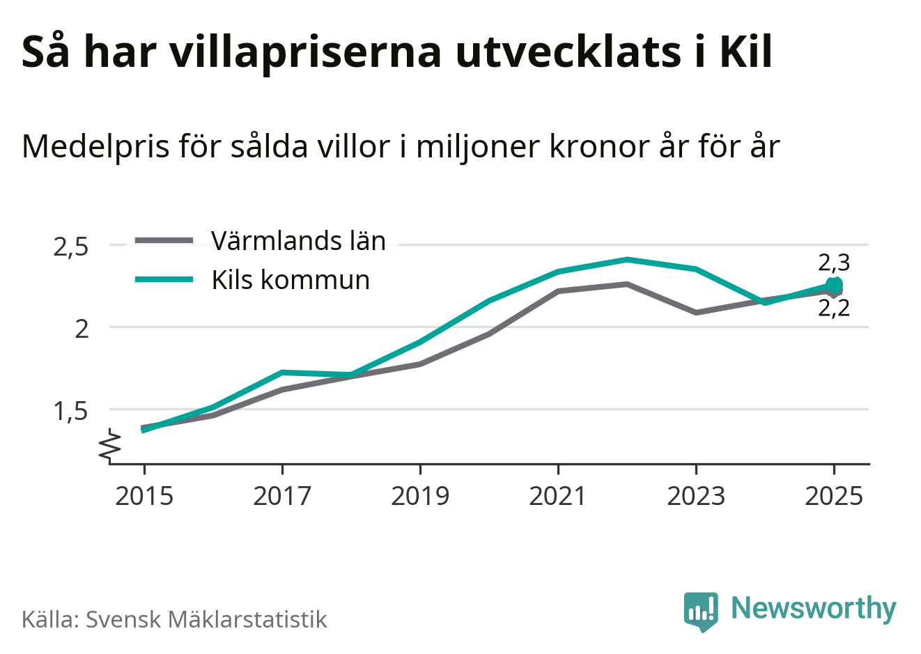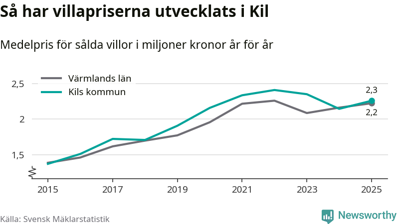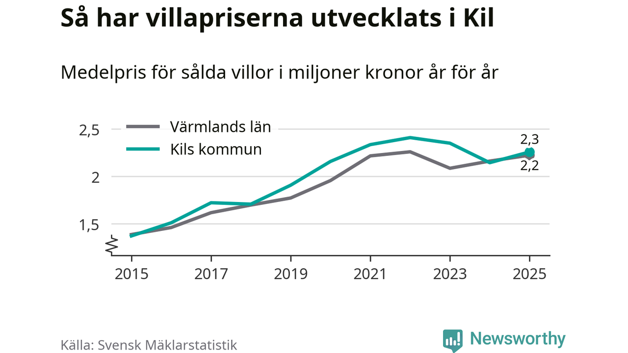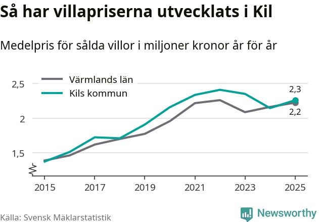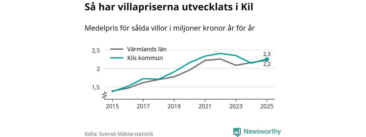 2,3 miljoner kronor är medelpriset för de villor som såldes i Kils kommun under året, eller 18 509 kronor per kvadratmeter. Det innebär en prisökning med fem procent på ett år.