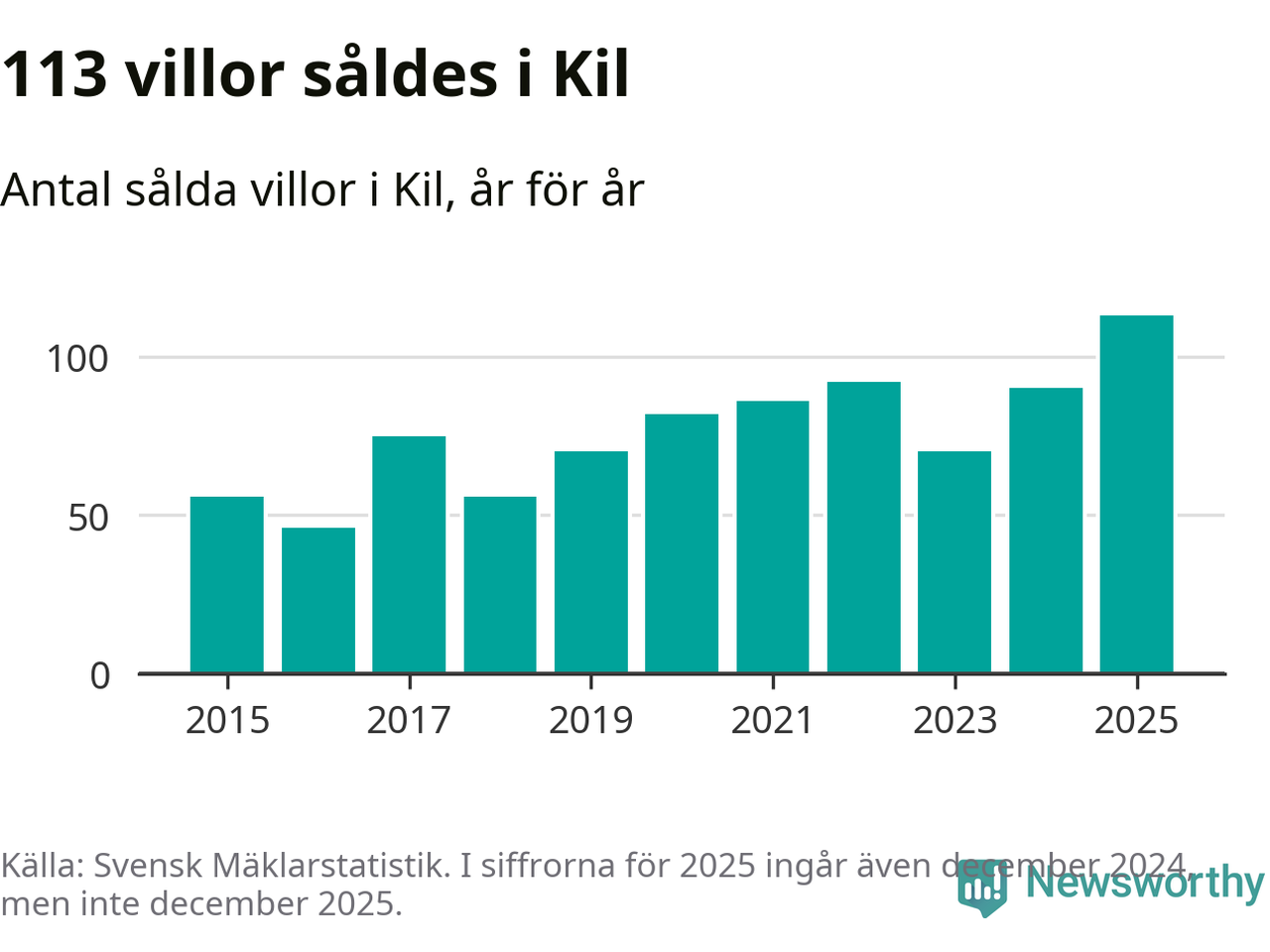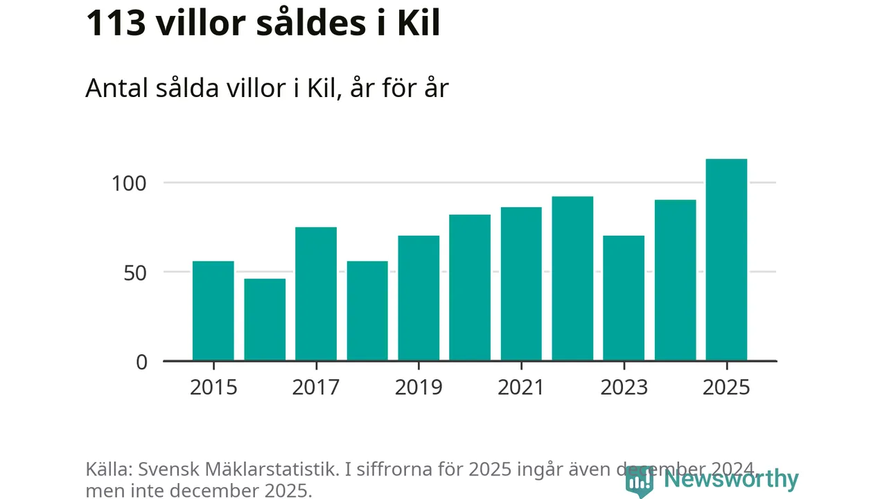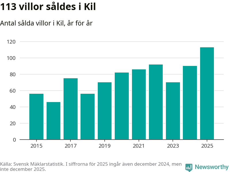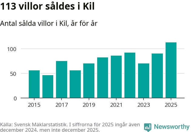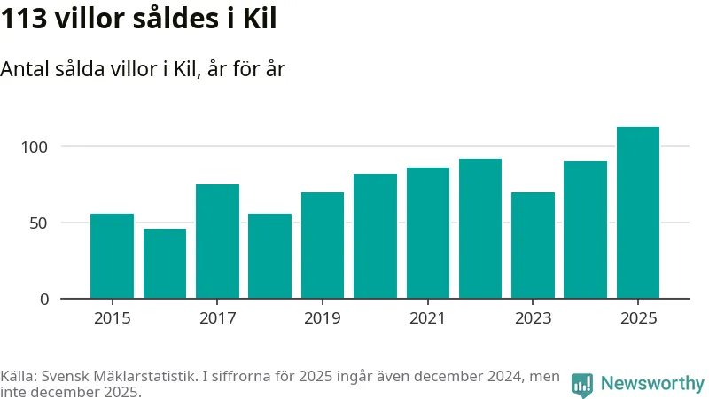 Antalet sålda villor ökade också. Totalt såldes 113 villor, att jämföra med 90 under 2024. Det är fler än något annat år sedan 2015.