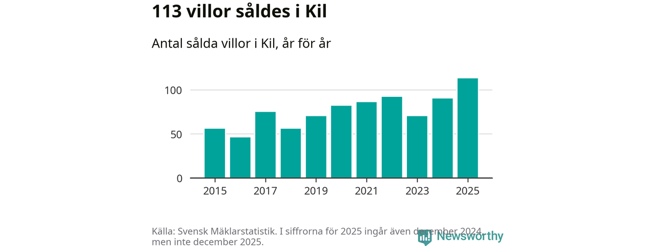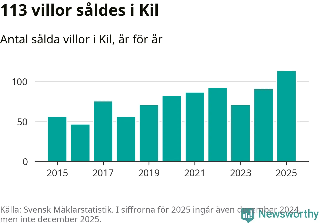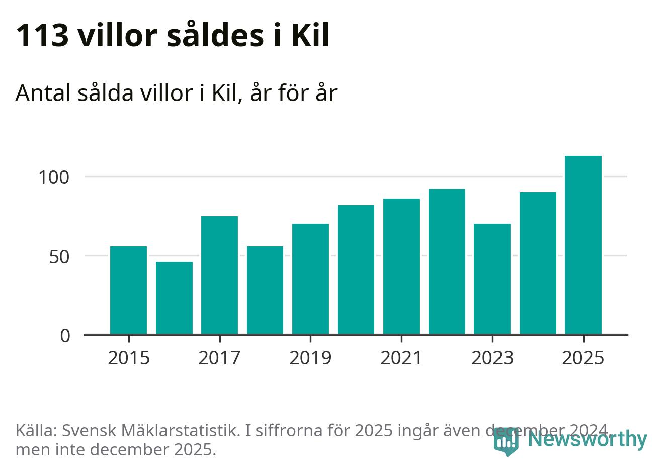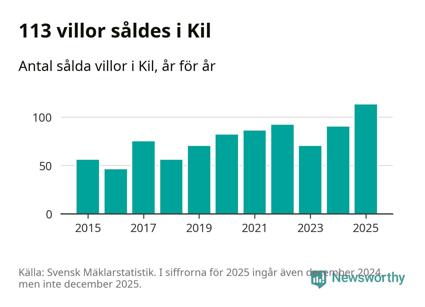 Antalet sålda villor ökade också. Totalt såldes 113 villor, att jämföra med 90 under 2024. Det är fler än något annat år sedan 2015.
