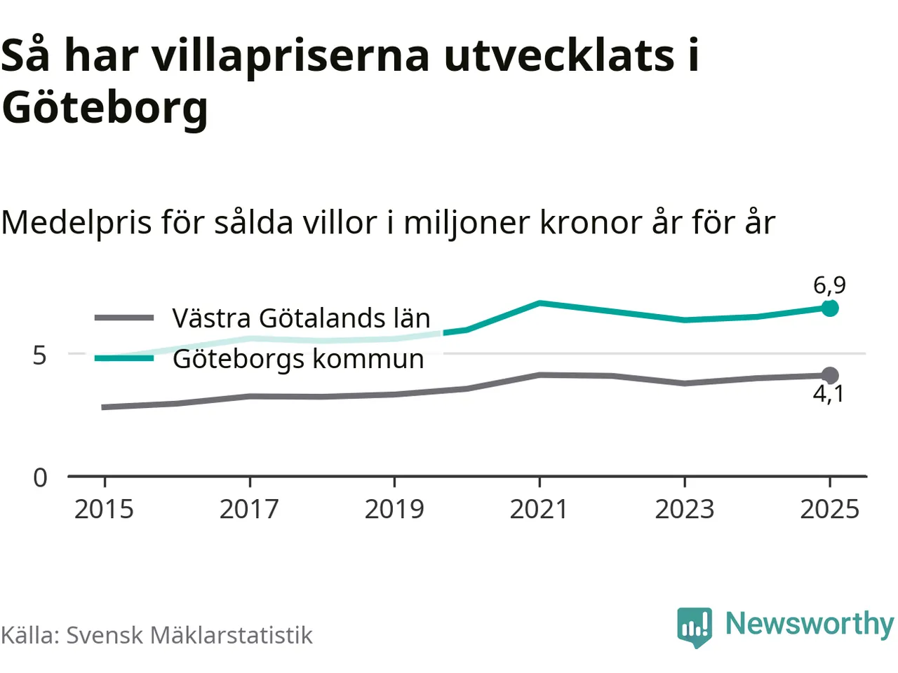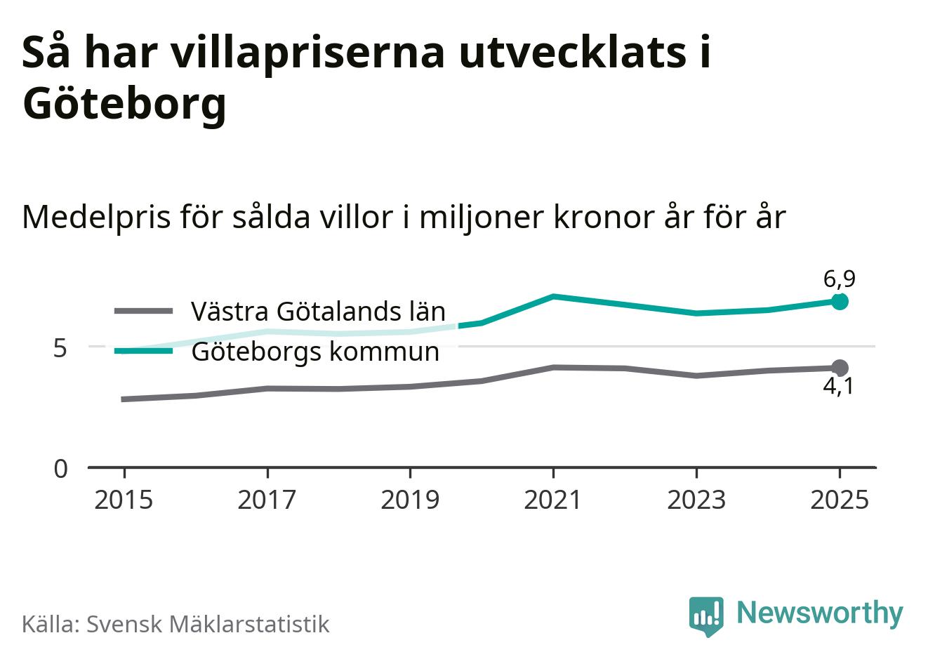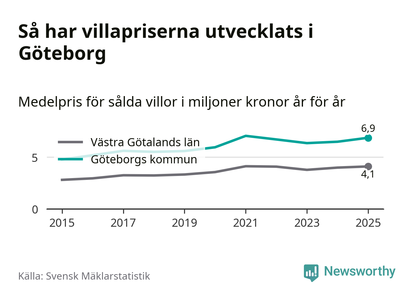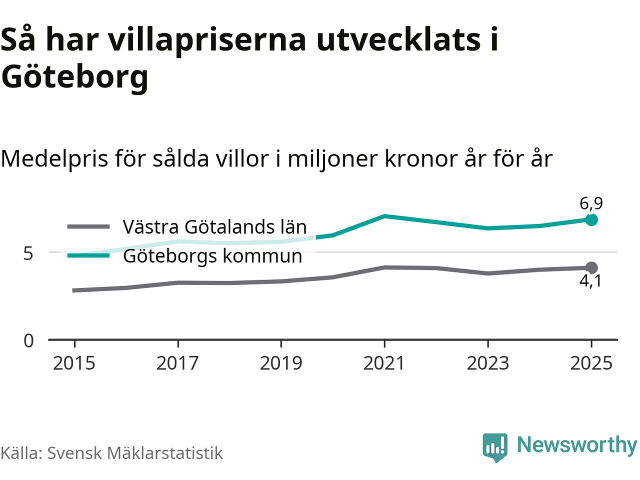 6,9 miljoner kronor är medelpriset för de villor som såldes i Göteborgs kommun under året, eller 50 425 kronor per kvadratmeter. Det innebär en prisökning med sex procent på ett år och är andra året i rad som priserna ökar i kommunen.
