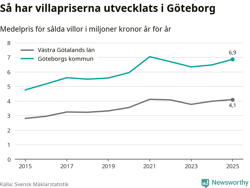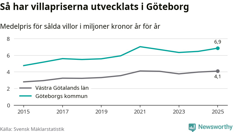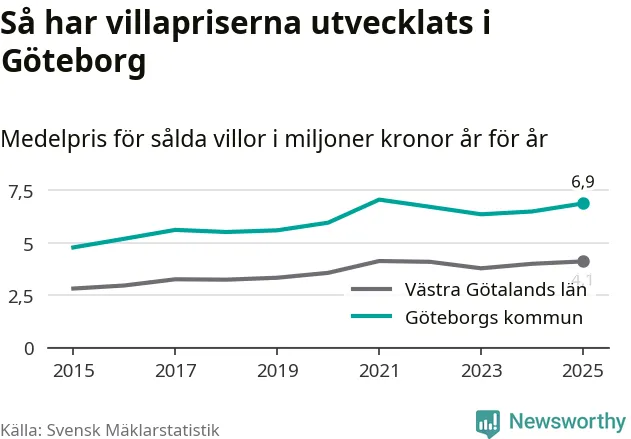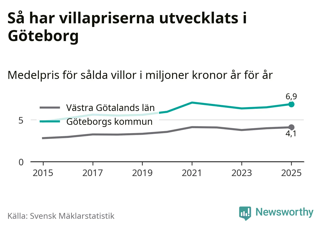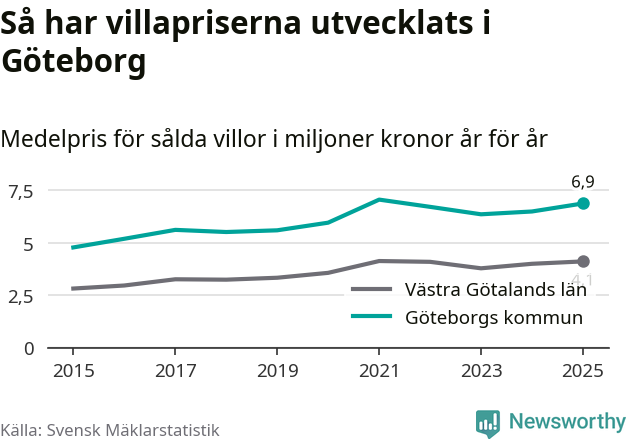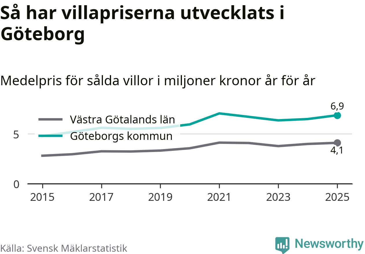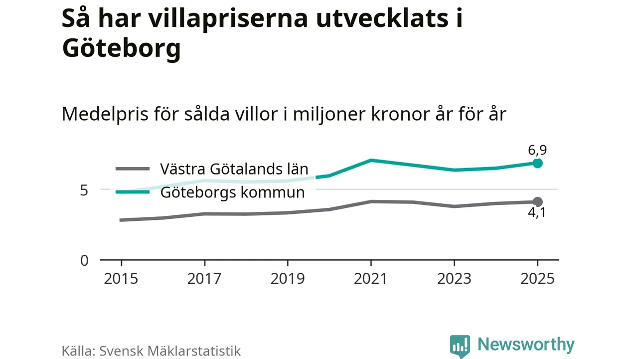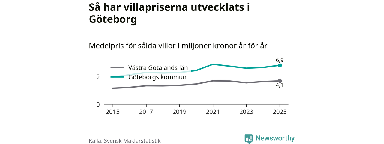 6,9 miljoner kronor är medelpriset för de villor som såldes i Göteborgs kommun under året, eller 50 425 kronor per kvadratmeter. Det innebär en prisökning med sex procent på ett år och är andra året i rad som priserna ökar i kommunen.