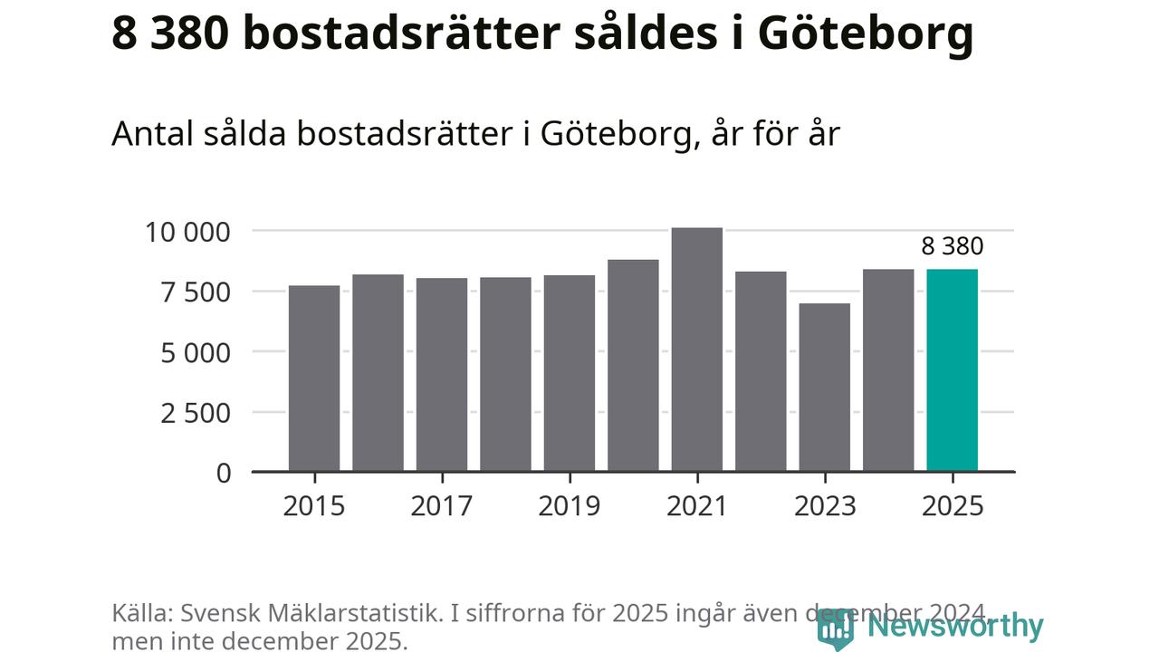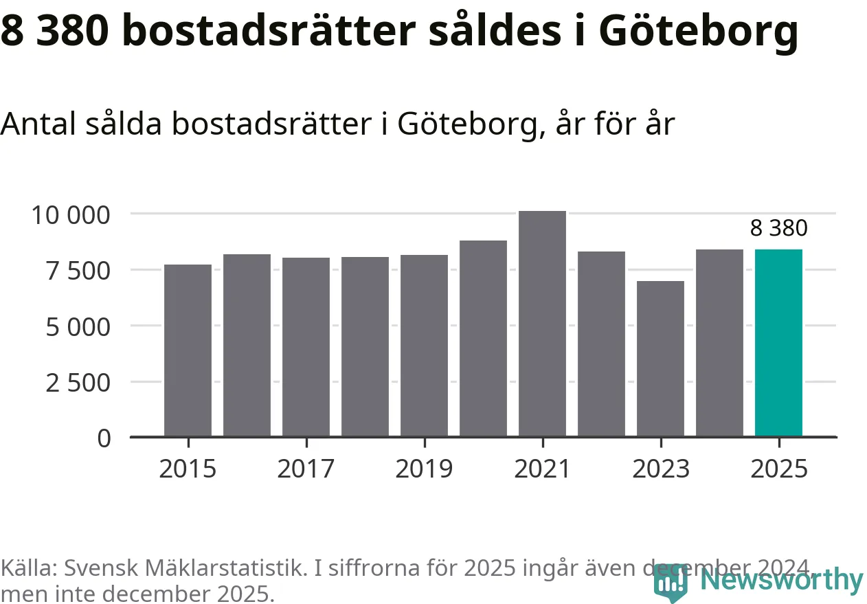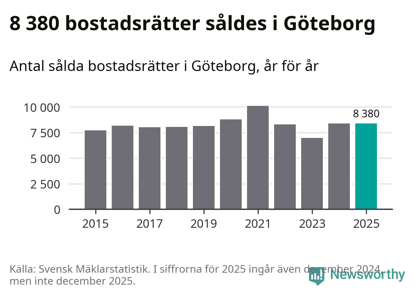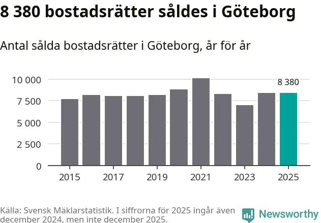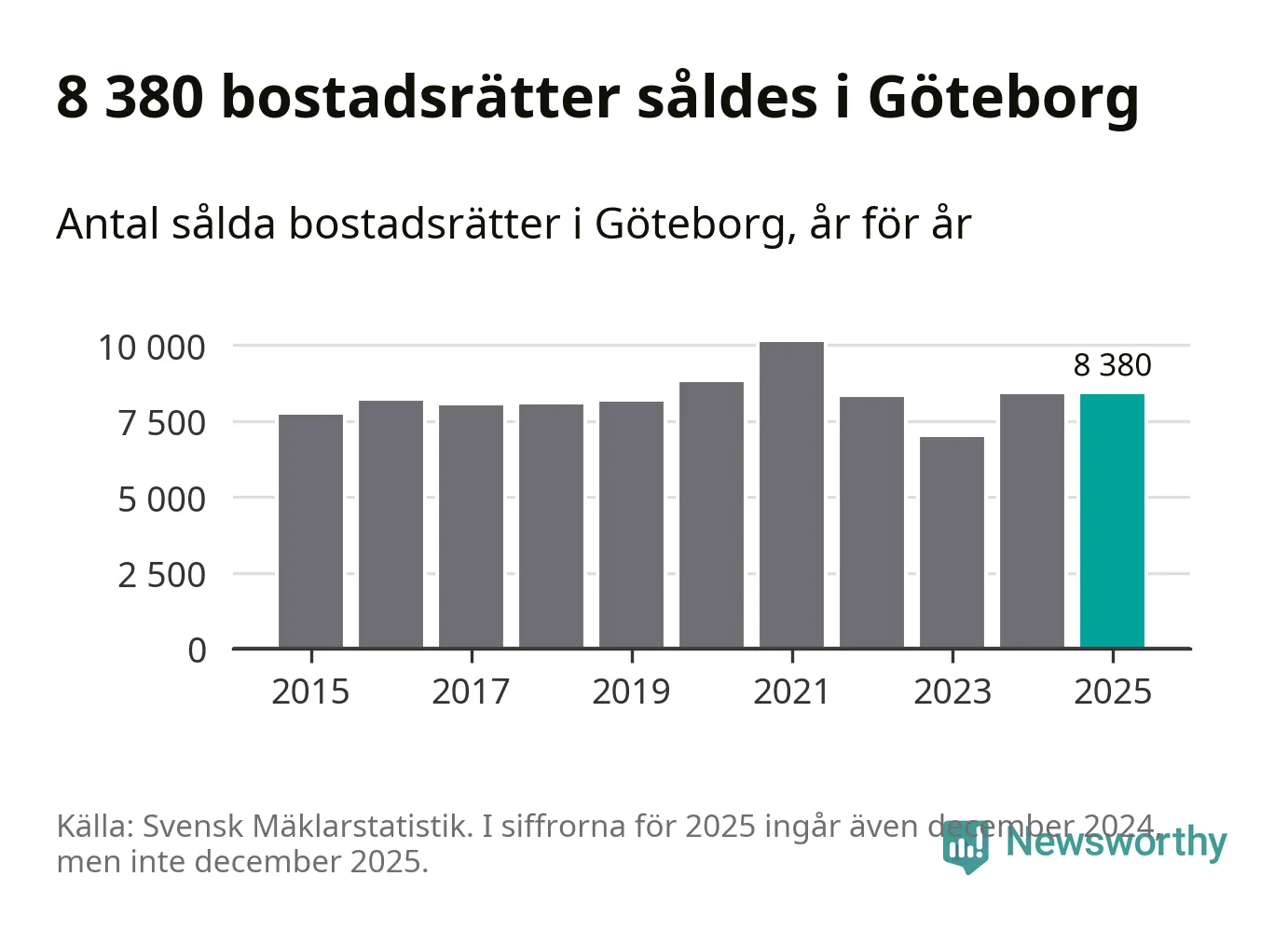 Det såldes totalt 8 380 bostadsrätter i Göteborgs kommun under året. Genomsnittspriset per kvadratmeter landade på 50 449 kronor, vilket är ungefär samma nivå som förra året.