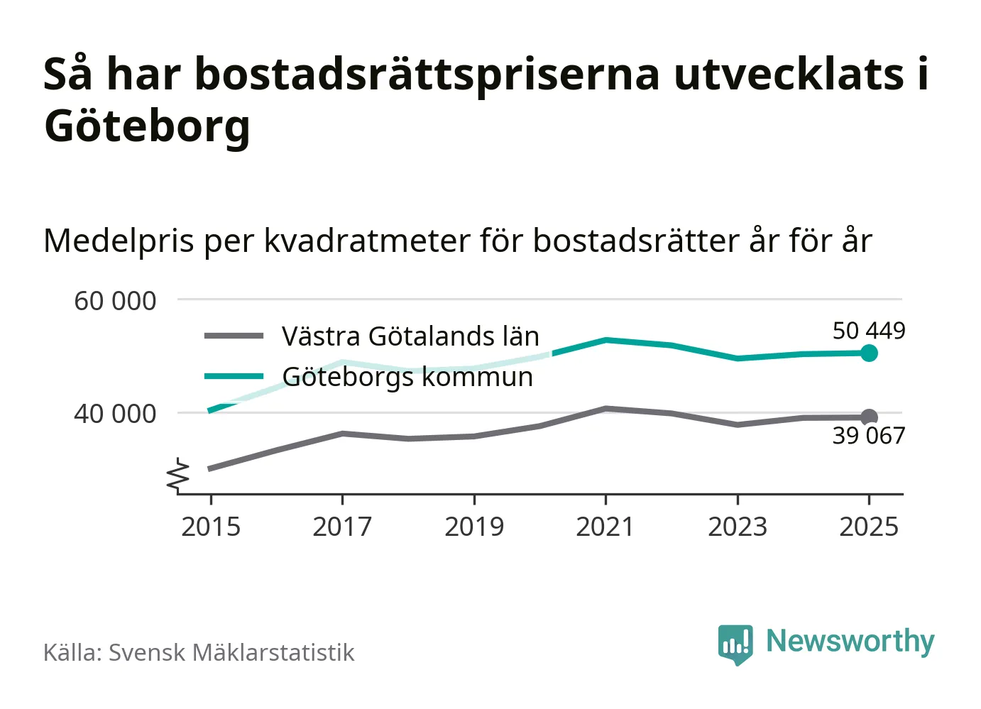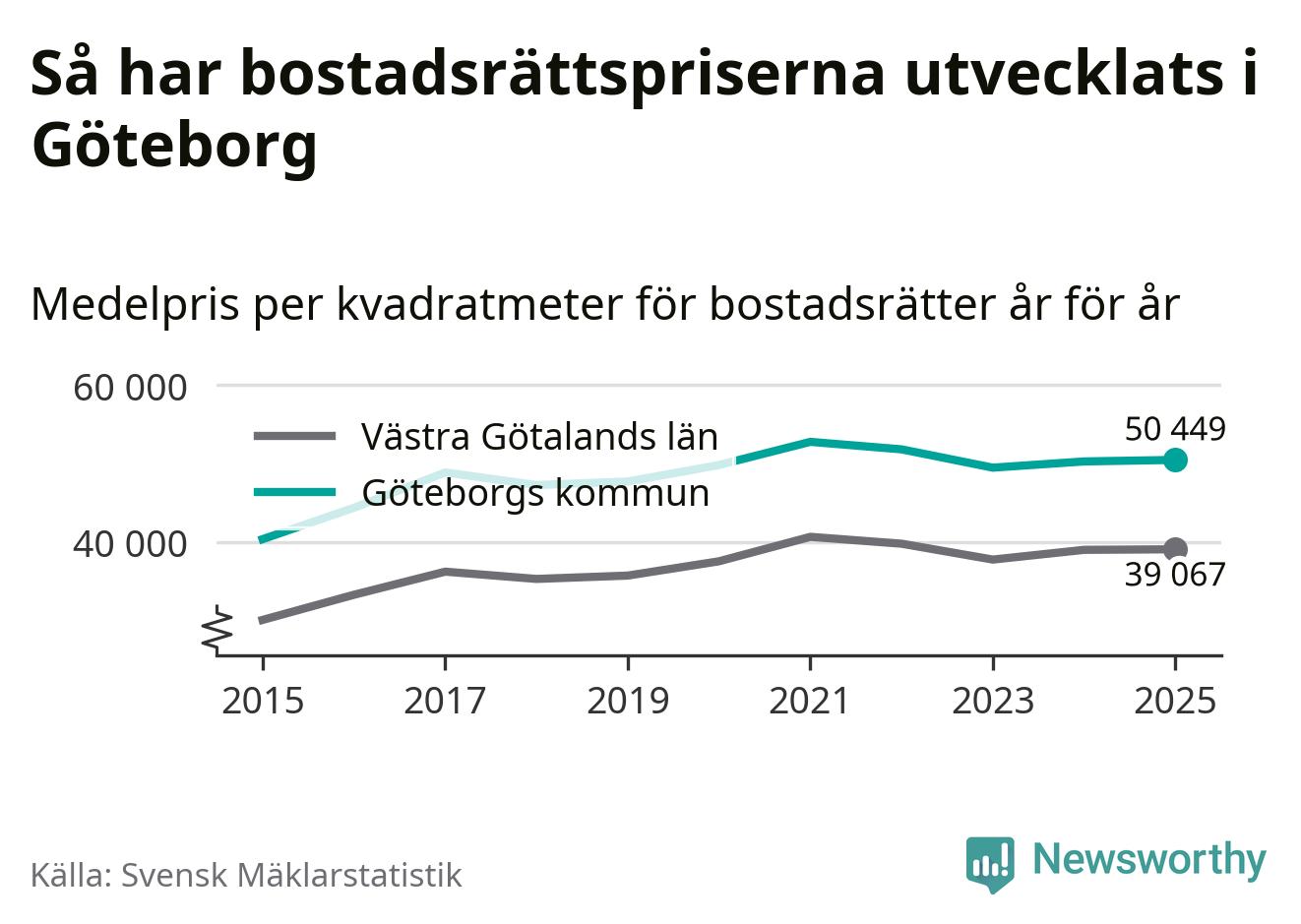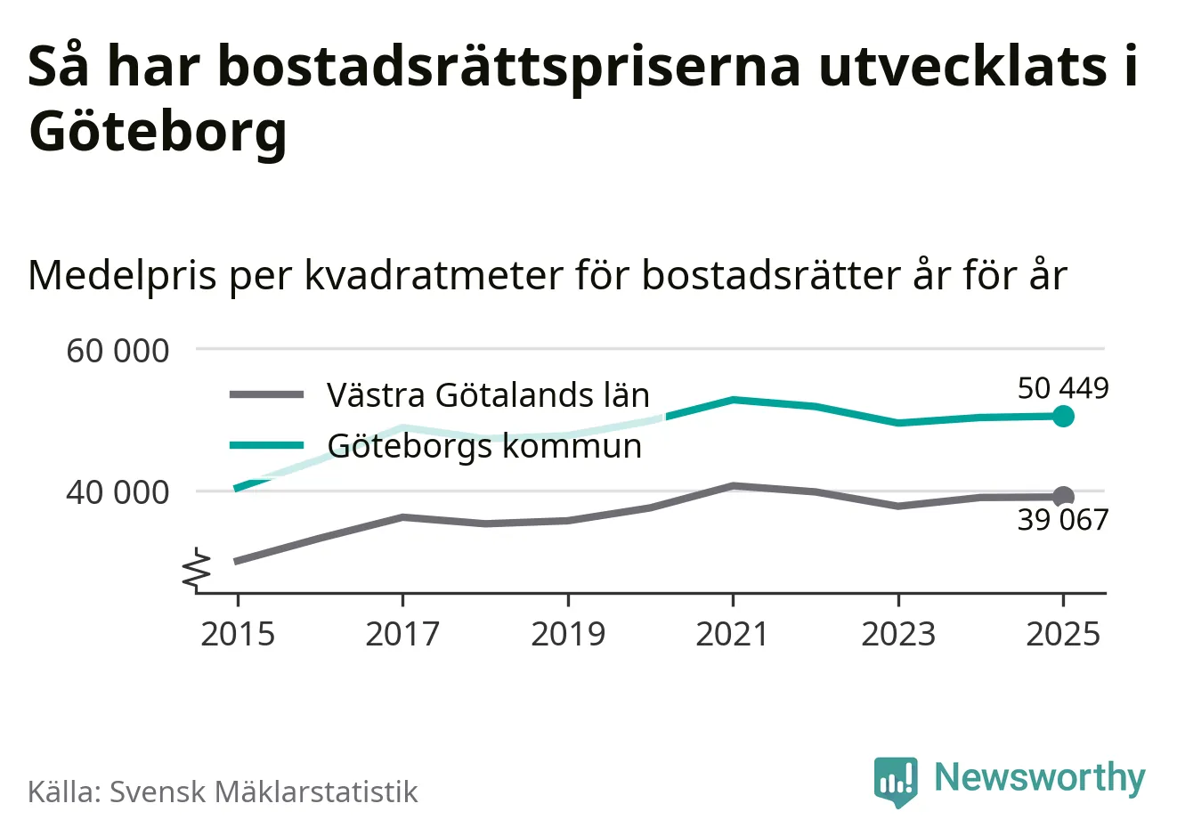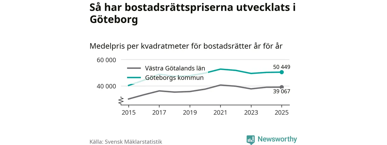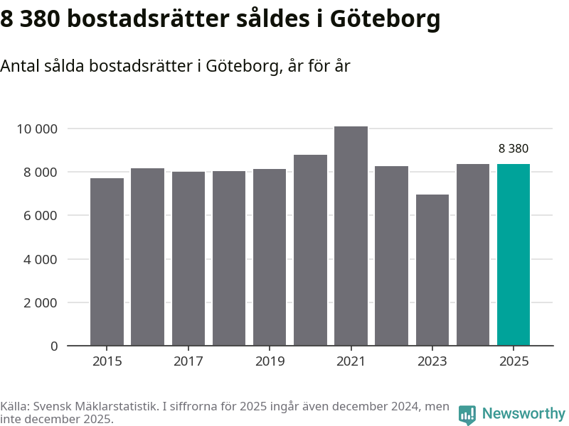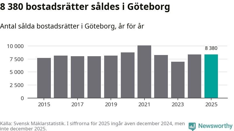 Det såldes totalt 8 380 bostadsrätter i Göteborgs kommun under året. Genomsnittspriset per kvadratmeter landade på 50 449 kronor, vilket är ungefär samma nivå som förra året.