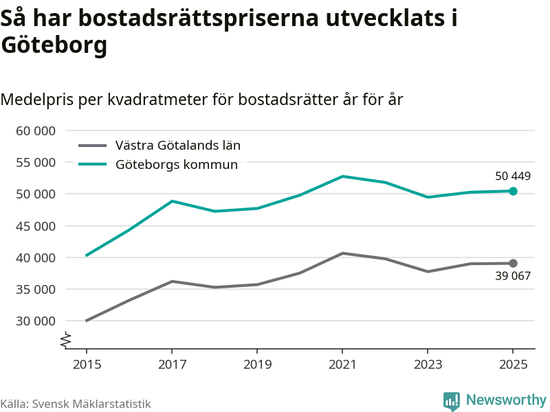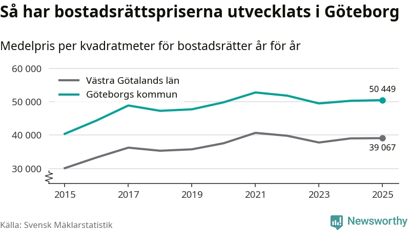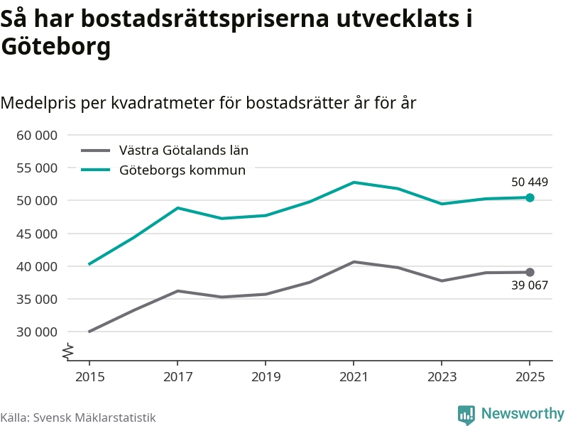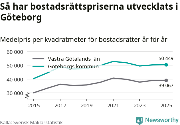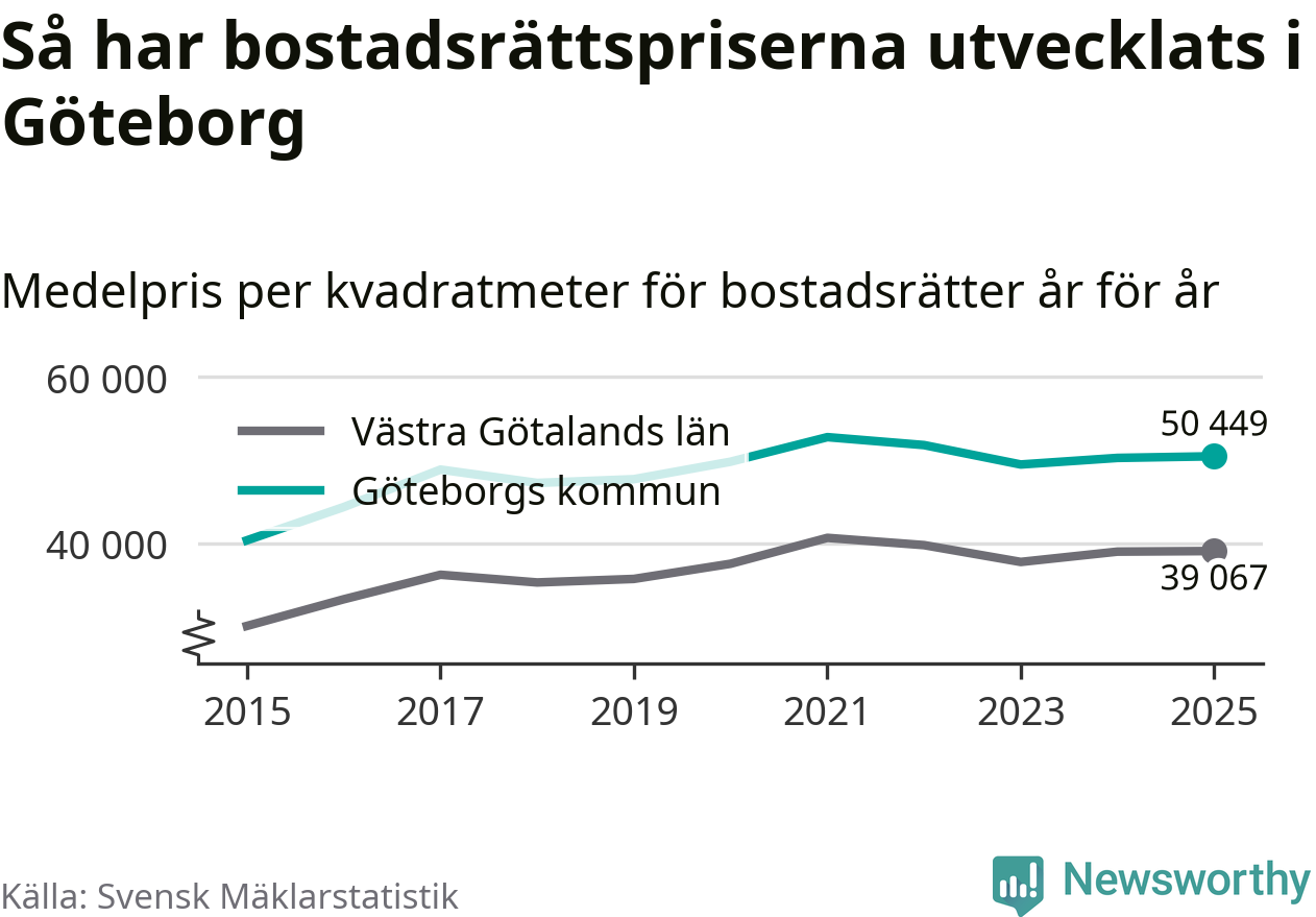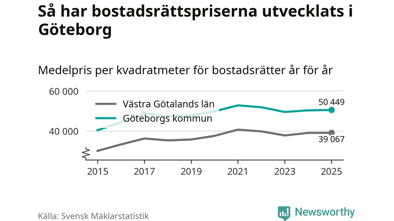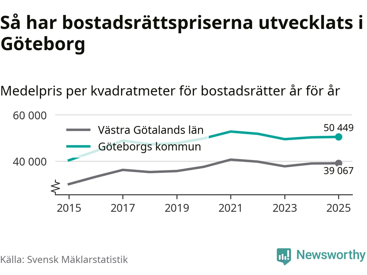 Det såldes totalt 8 380 bostadsrätter i Göteborgs kommun under året. Genomsnittspriset per kvadratmeter landade på 50 449 kronor, vilket är ungefär samma nivå som förra året.