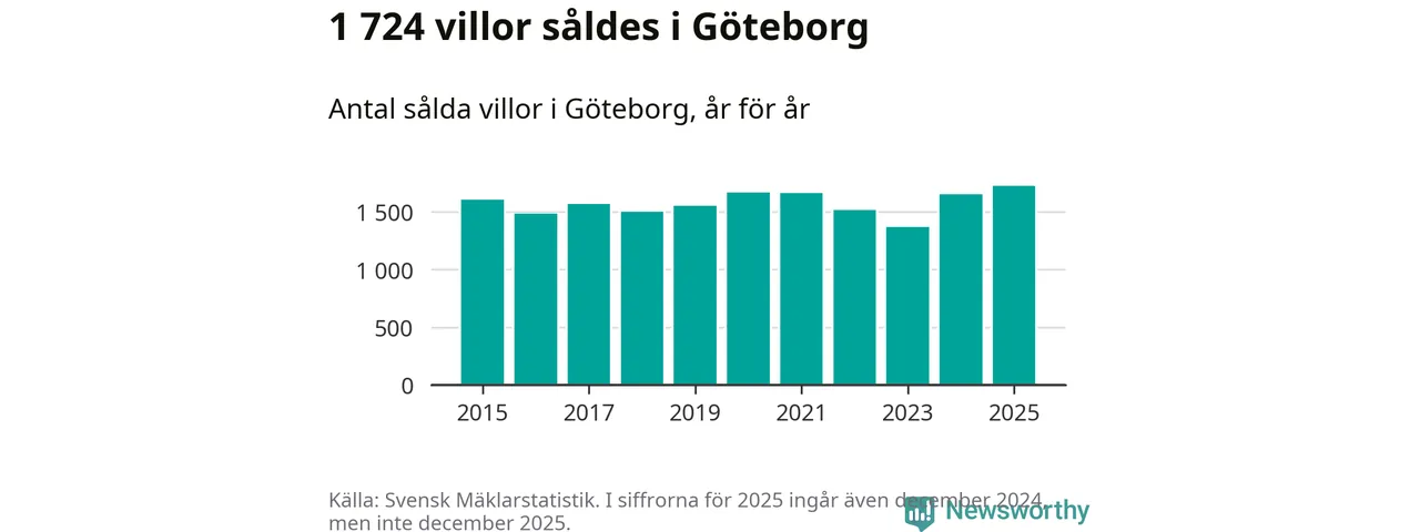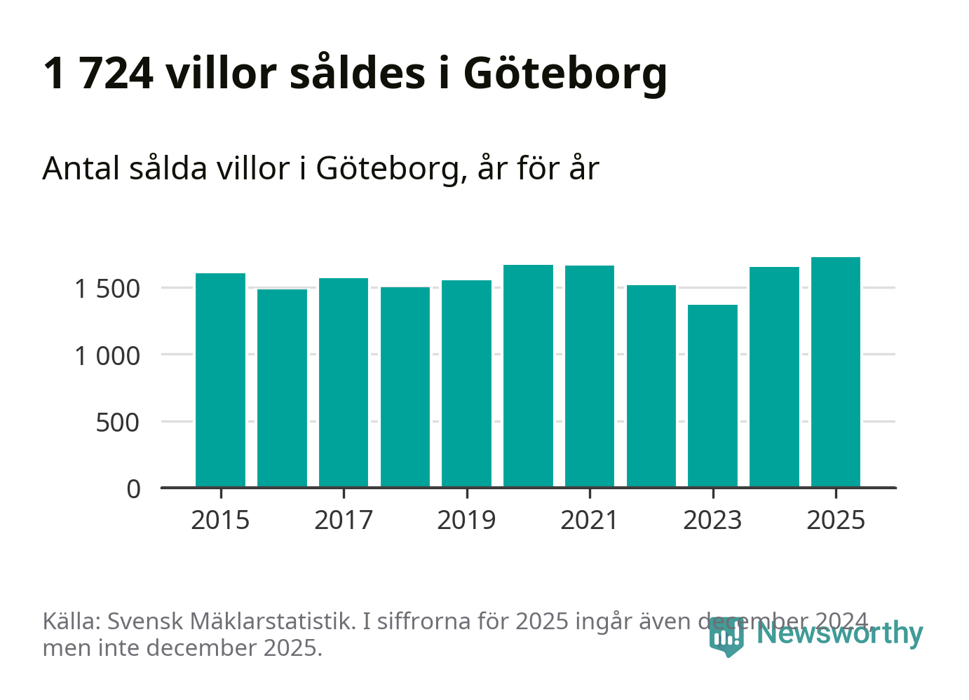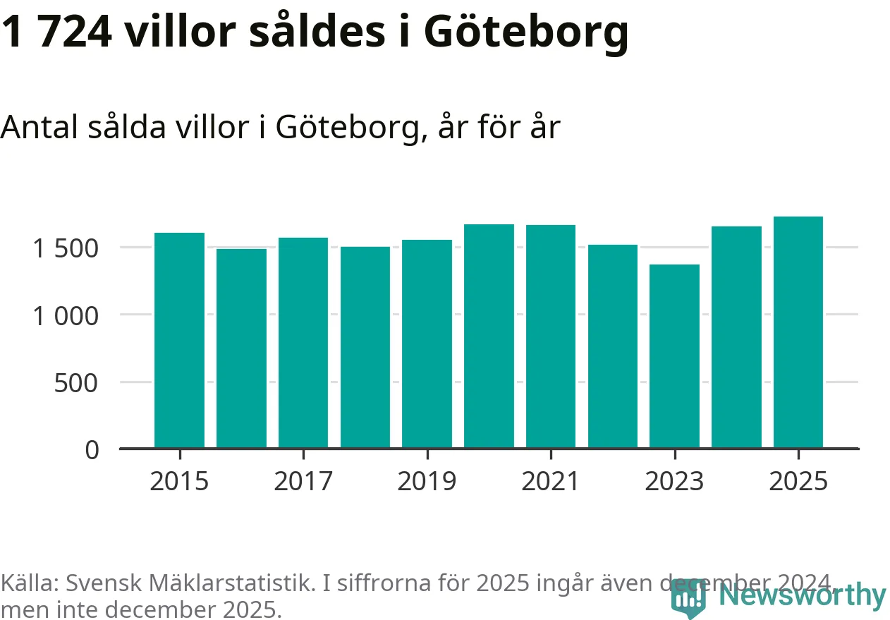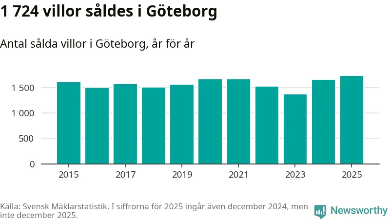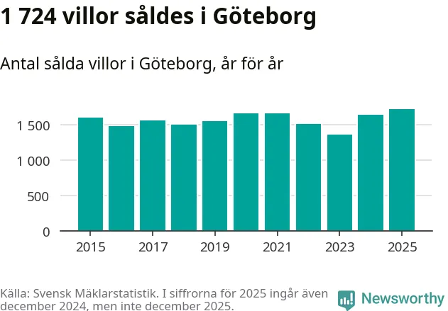 Antalet sålda villor ökade också. Totalt såldes 1 724 villor, att jämföra med 1 648 under 2024. Det är fler än något annat år sedan 2015.