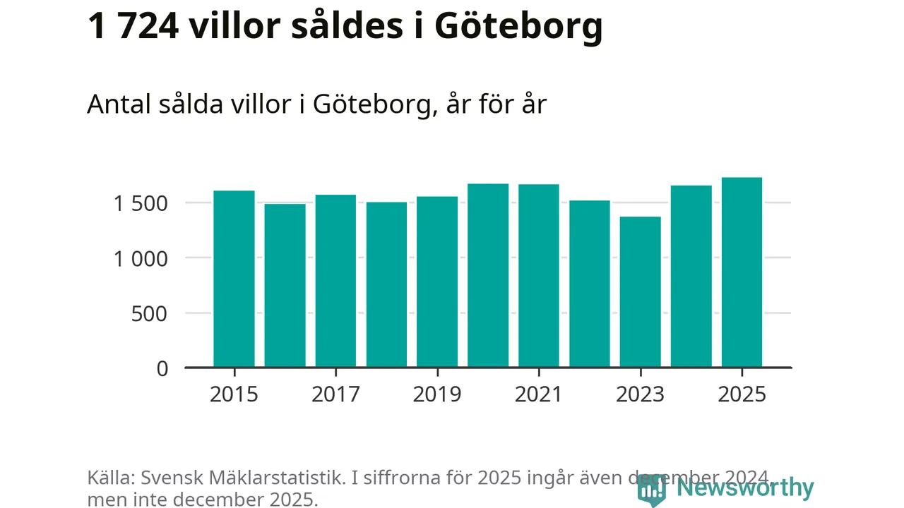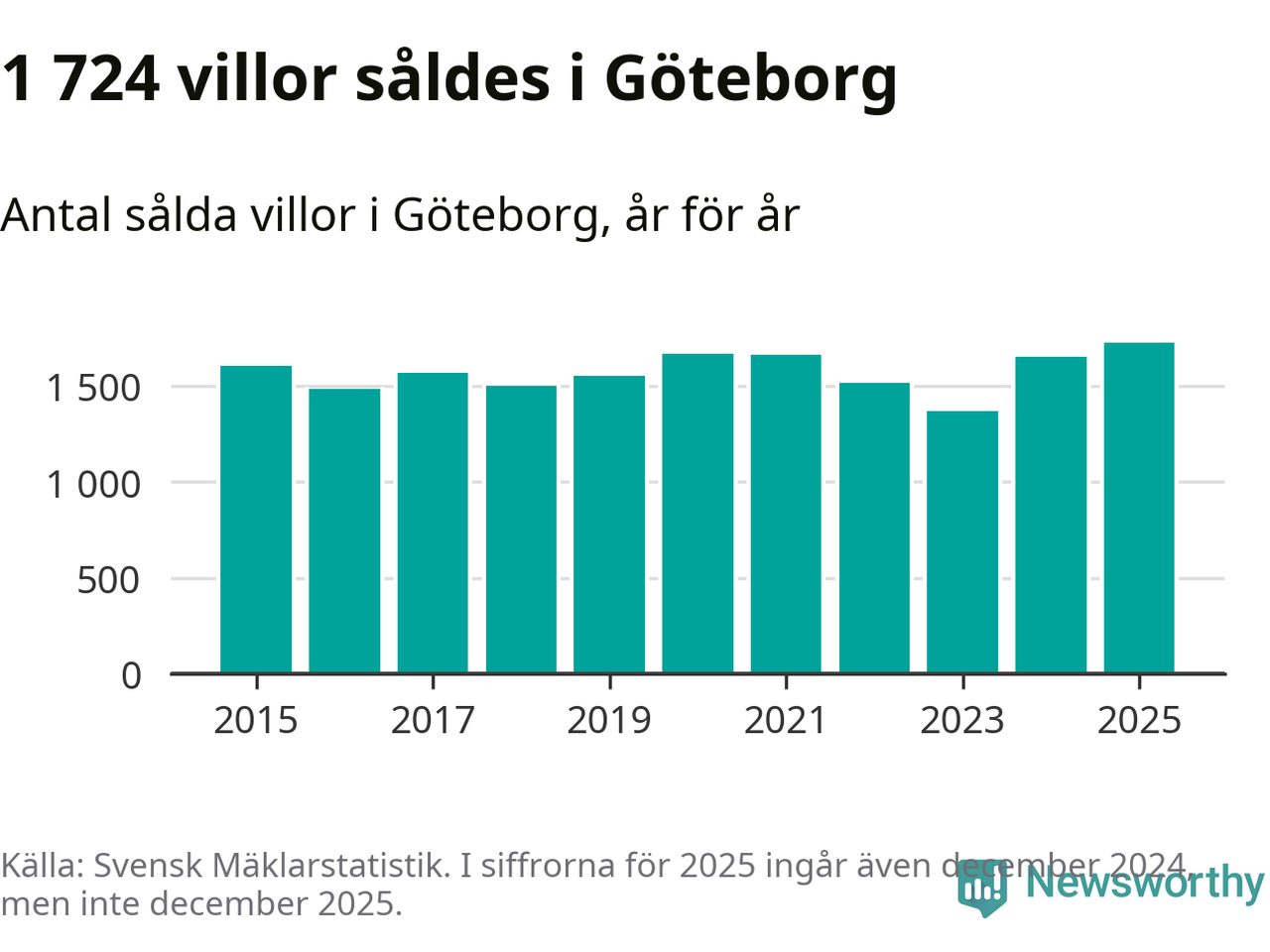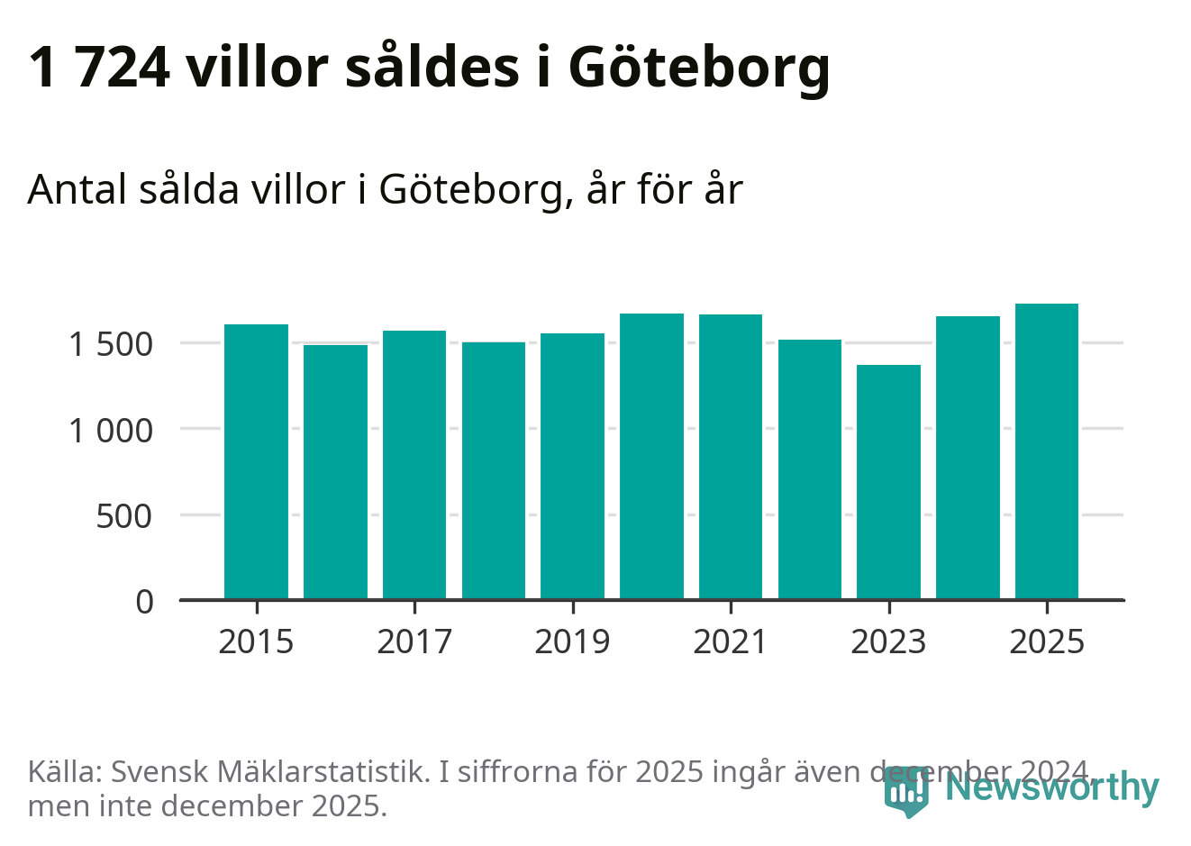Antalet sålda villor ökade också. Totalt såldes 1 724 villor, att jämföra med 1 648 under 2024. Det är fler än något annat år sedan 2015.