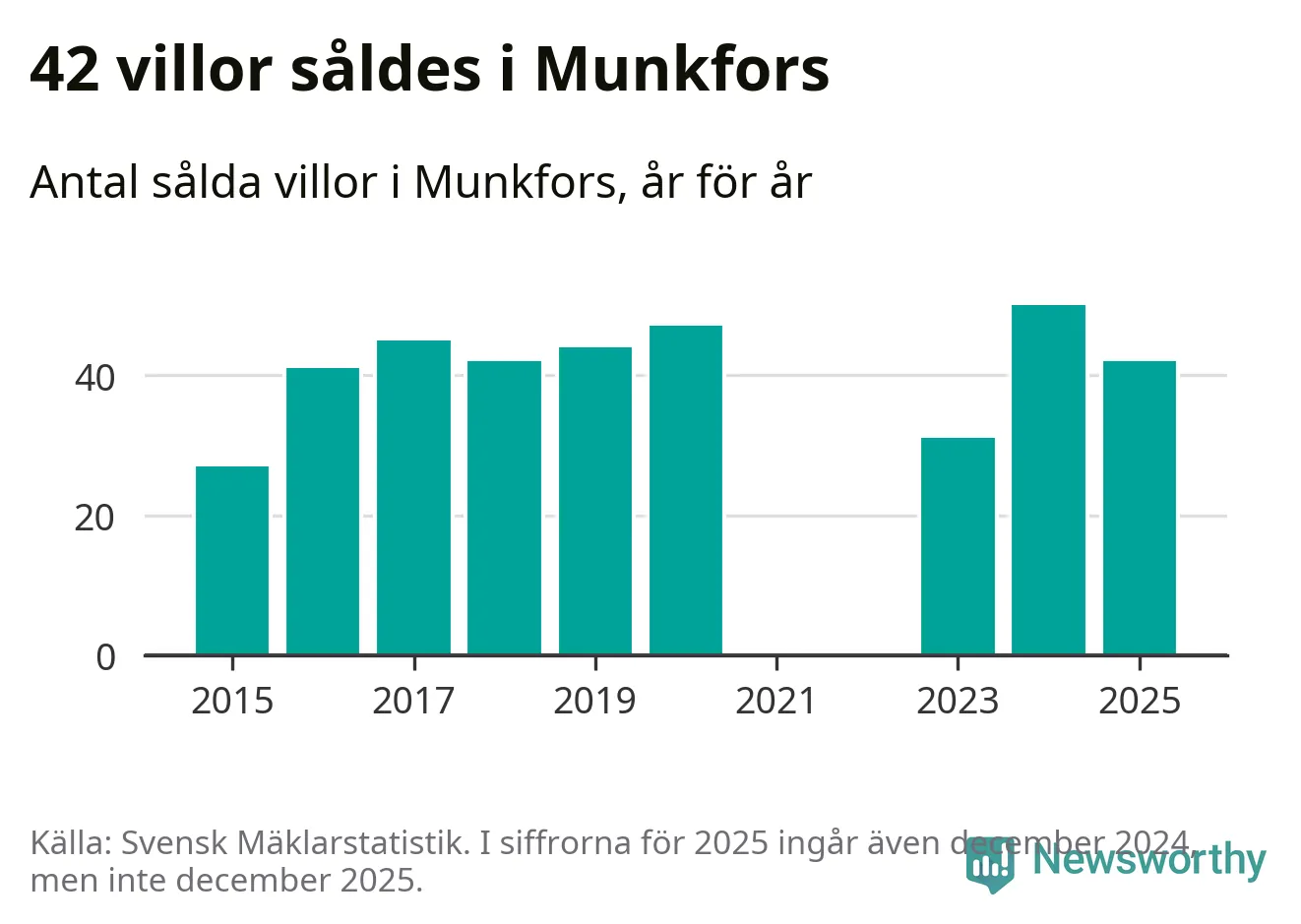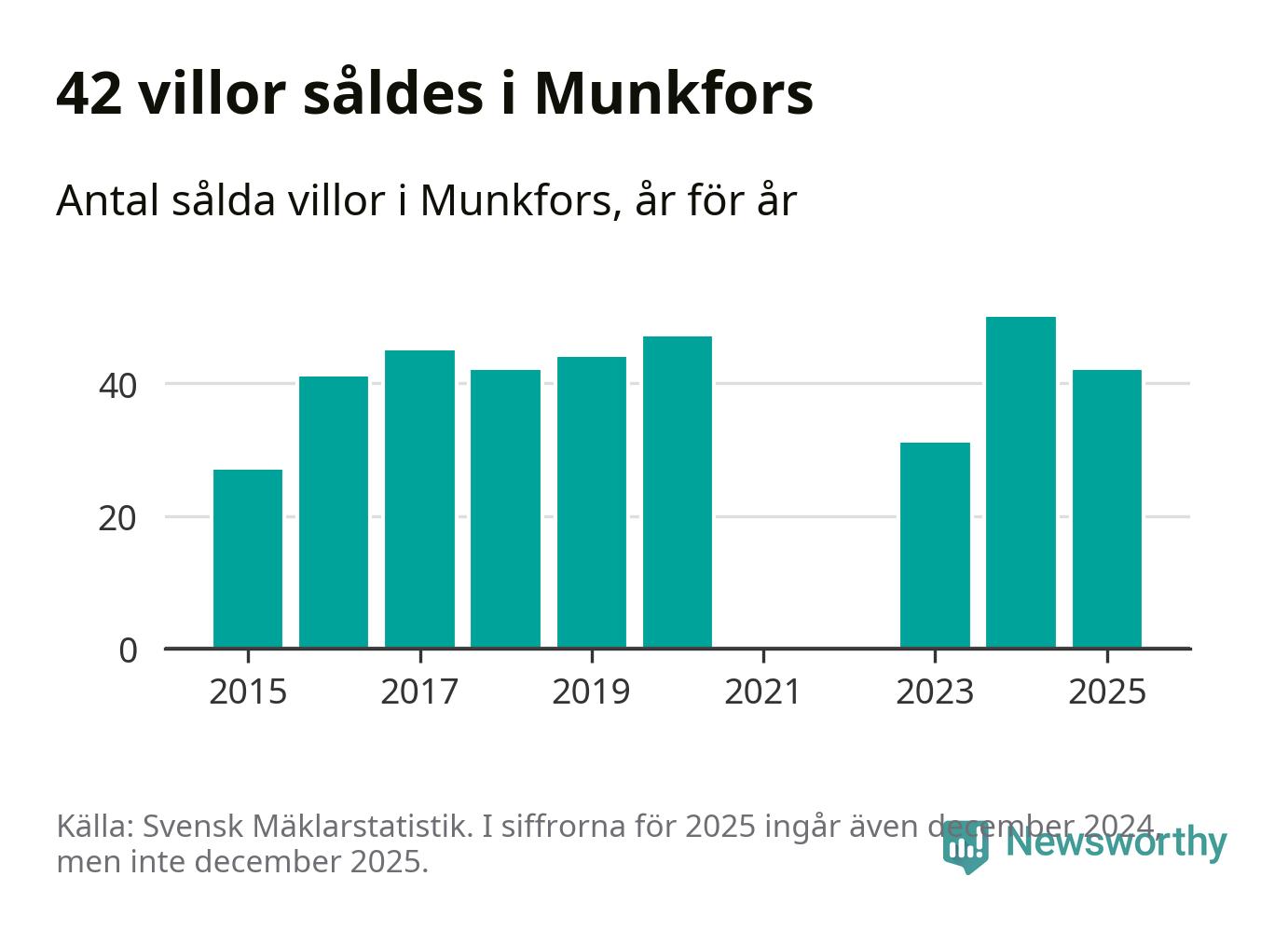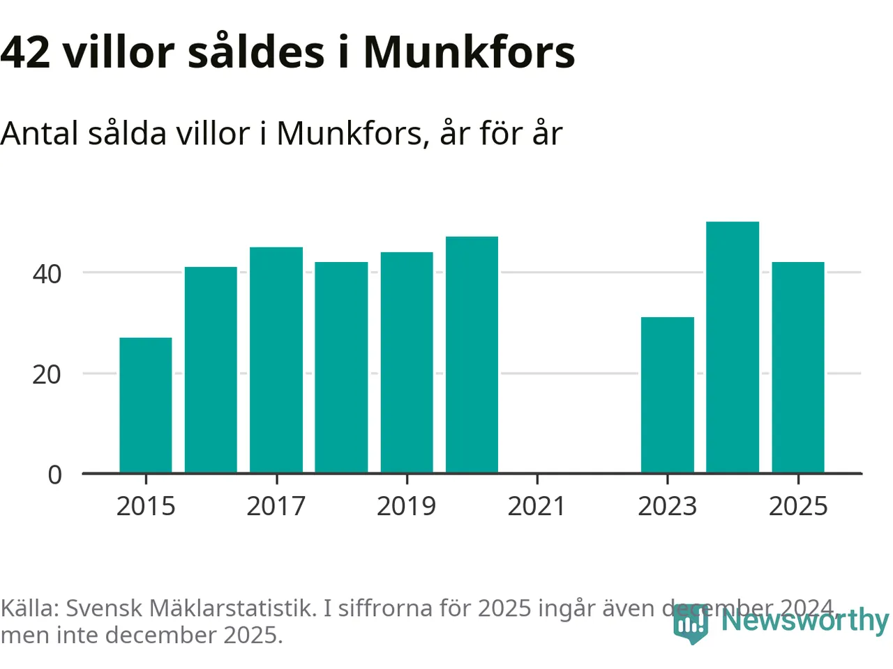 Däremot minskade antalet sålda villor. Totalt såldes 42 villor, att jämföra med 50 under 2024.