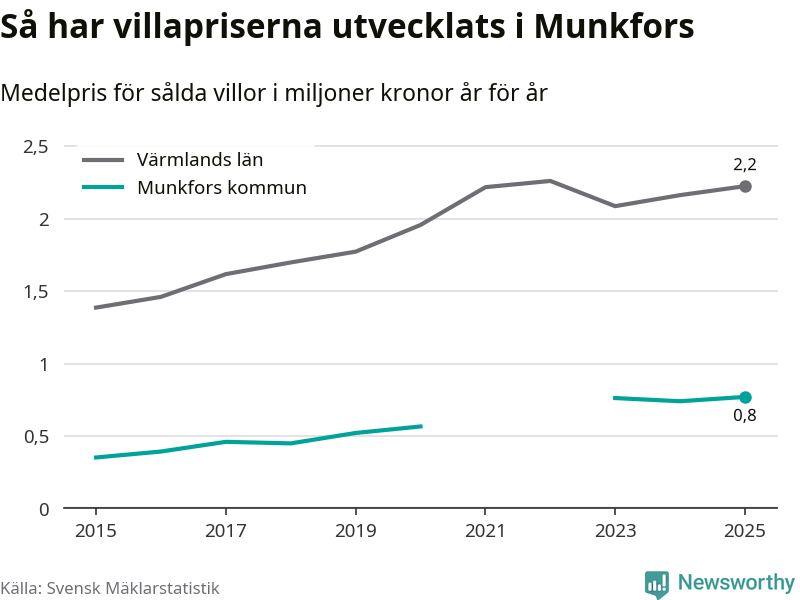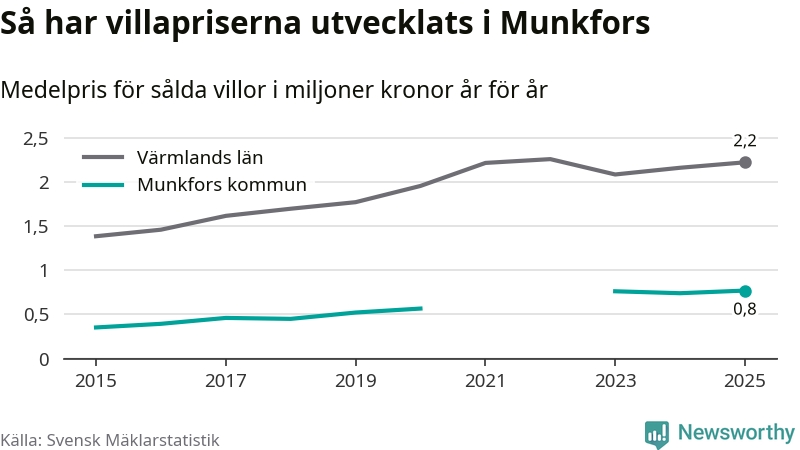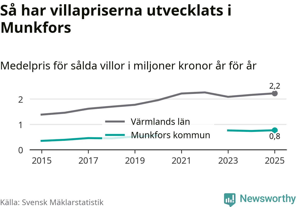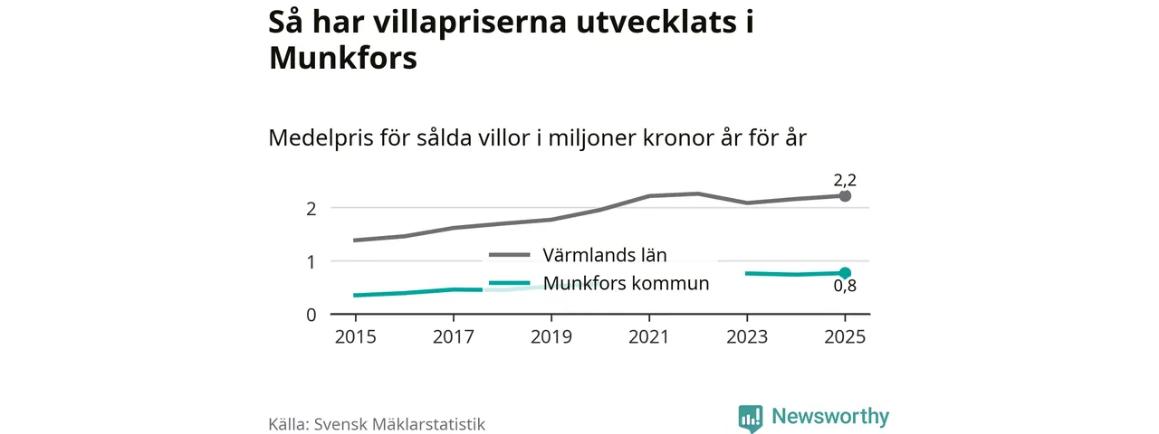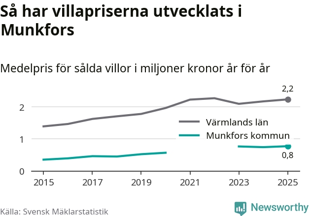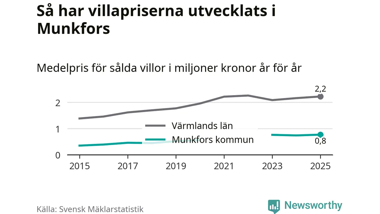 770 000 kronor är medelpriset för de villor som såldes i Munkfors kommun under året, eller 7 117 kronor per kvadratmeter. Det innebär en prisökning med fyra procent på ett år. Det är det högsta årssnittet på åtminstone tio år. Bryter man upp siffrorna per kvartal har dock ännu högre villapriser noterats i Munkfors sommaren 2023.