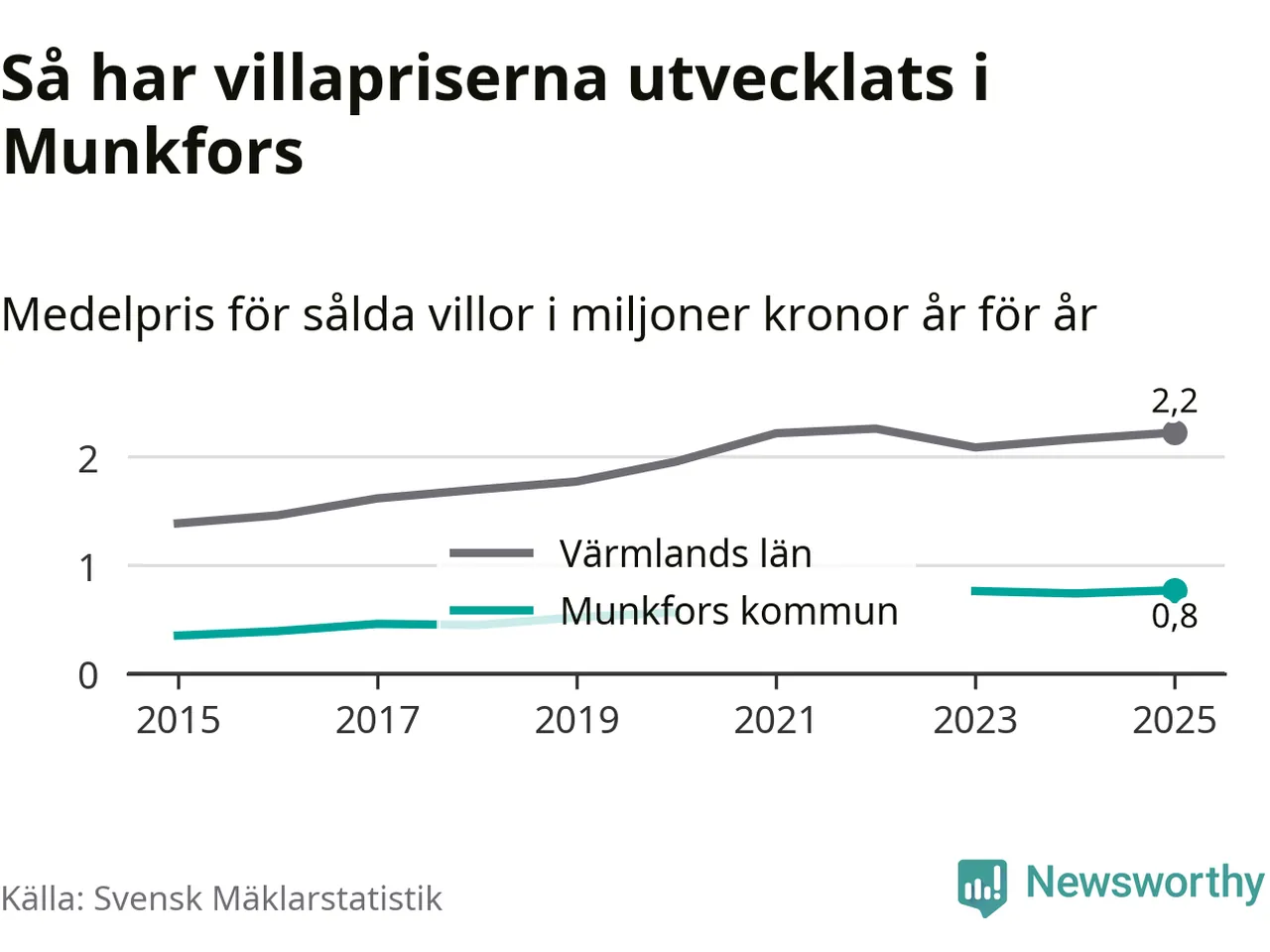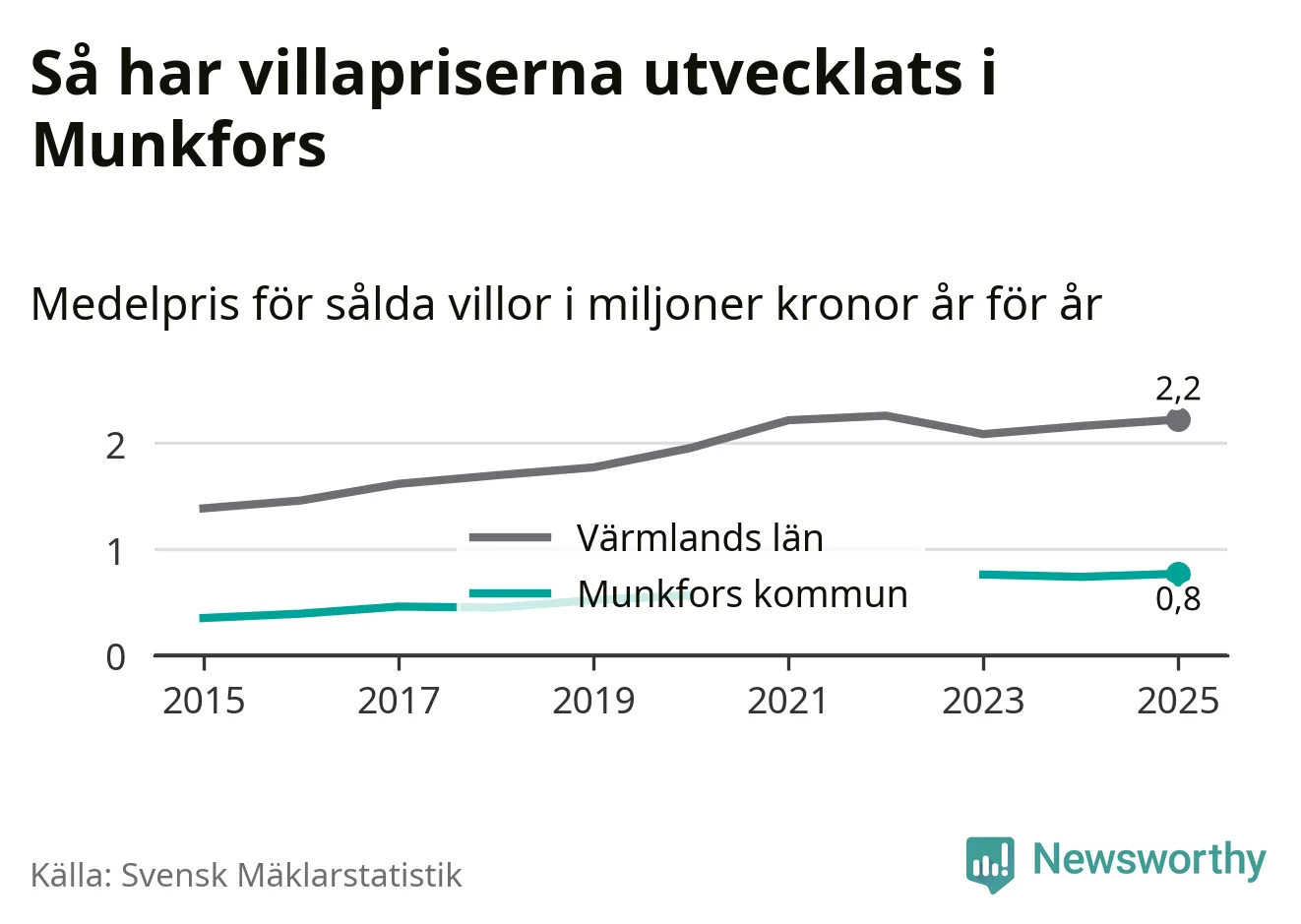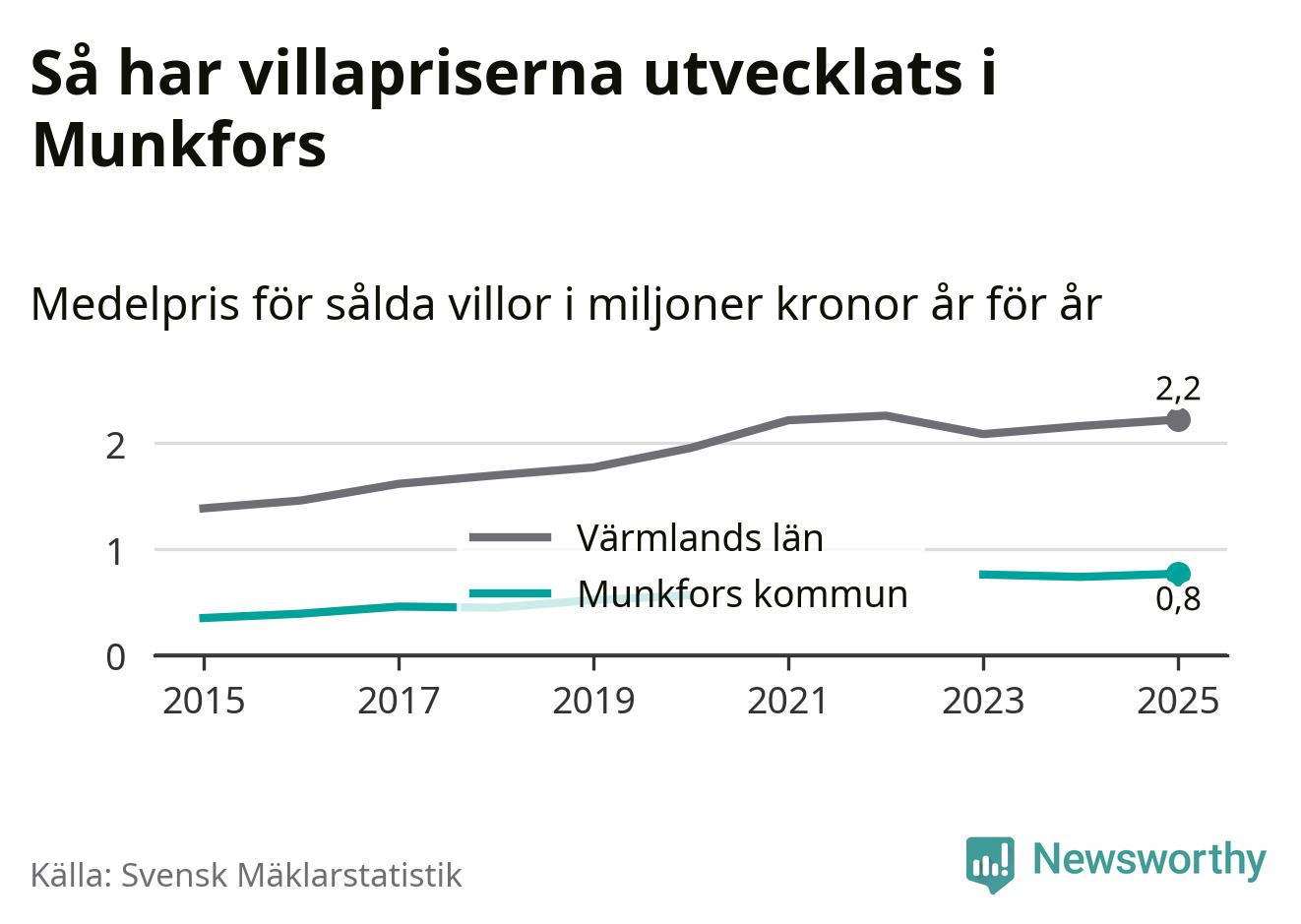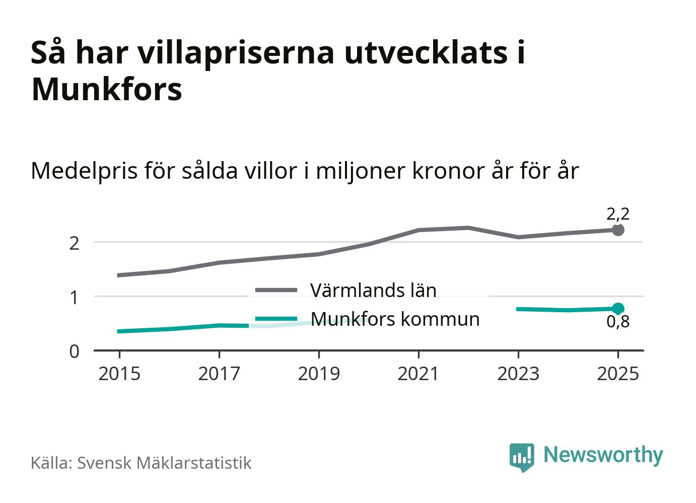 770 000 kronor är medelpriset för de villor som såldes i Munkfors kommun under året, eller 7 117 kronor per kvadratmeter. Det innebär en prisökning med fyra procent på ett år. Det är det högsta årssnittet på åtminstone tio år. Bryter man upp siffrorna per kvartal har dock ännu högre villapriser noterats i Munkfors sommaren 2023.