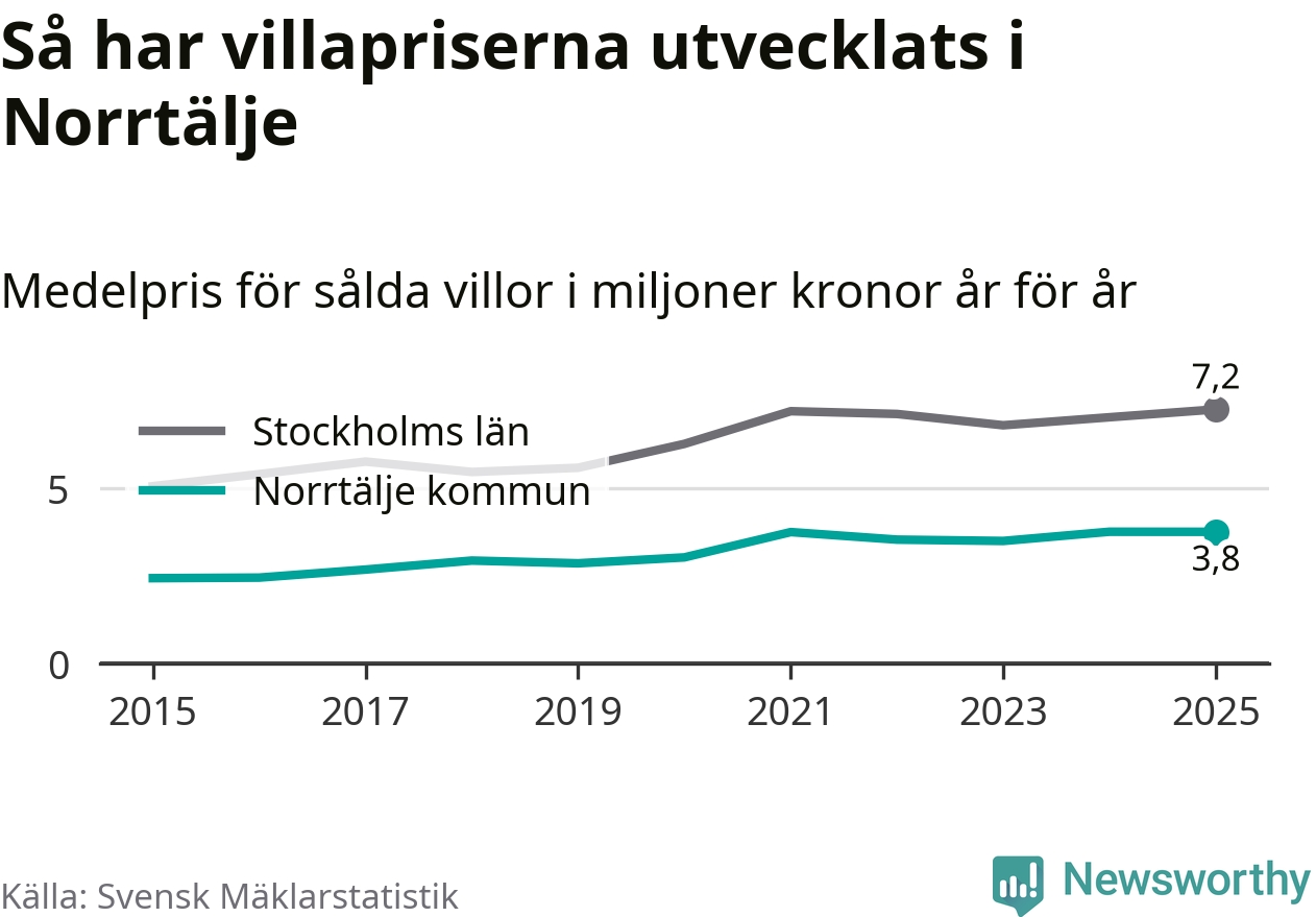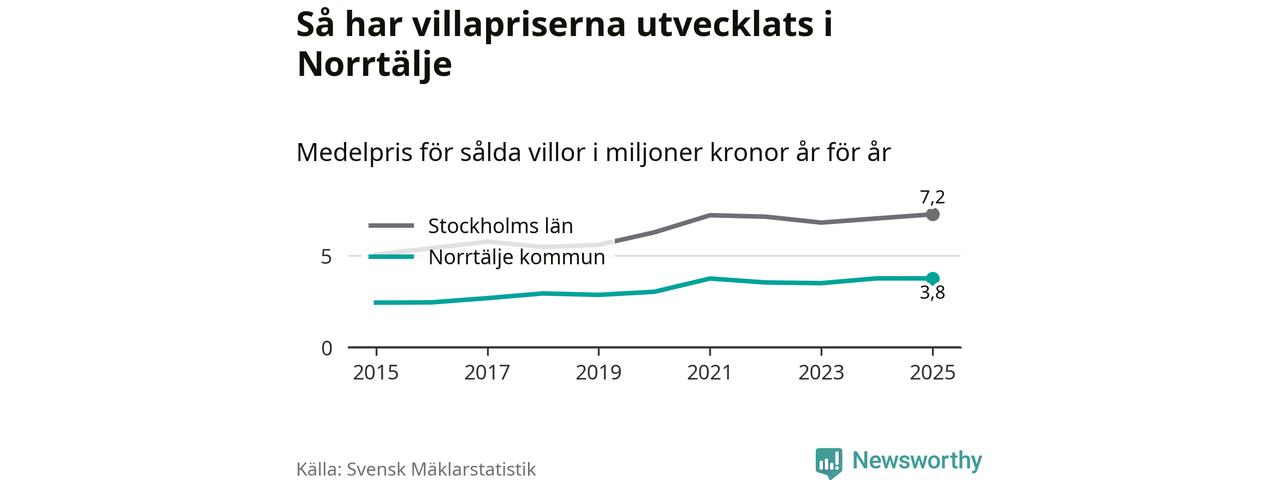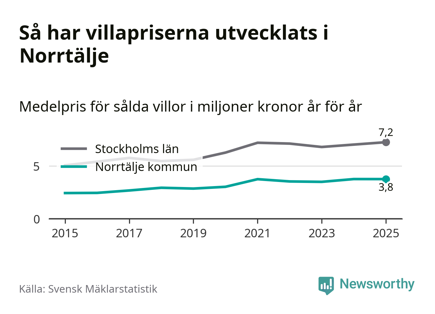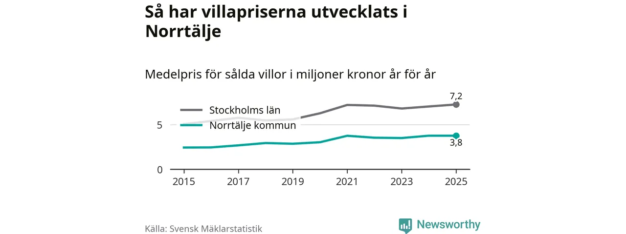 3,8 miljoner kronor är medelpriset för de villor som såldes i Norrtälje kommun under året, eller 38 141 kronor per kvadratmeter. Det innebär att priserna har legat i stort sett stilla sedan förra året.