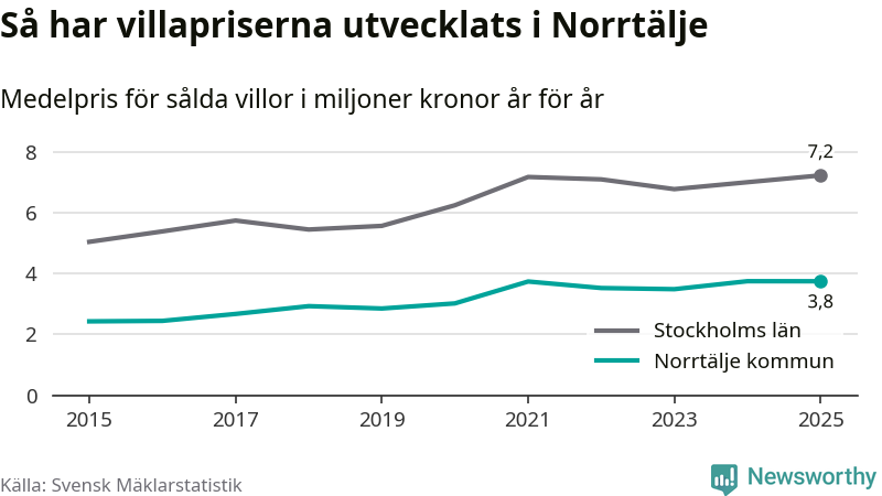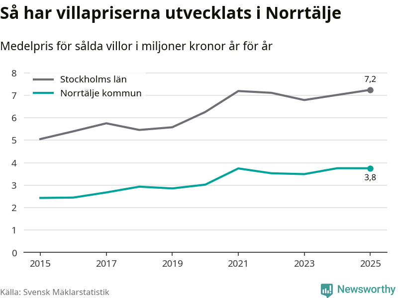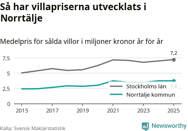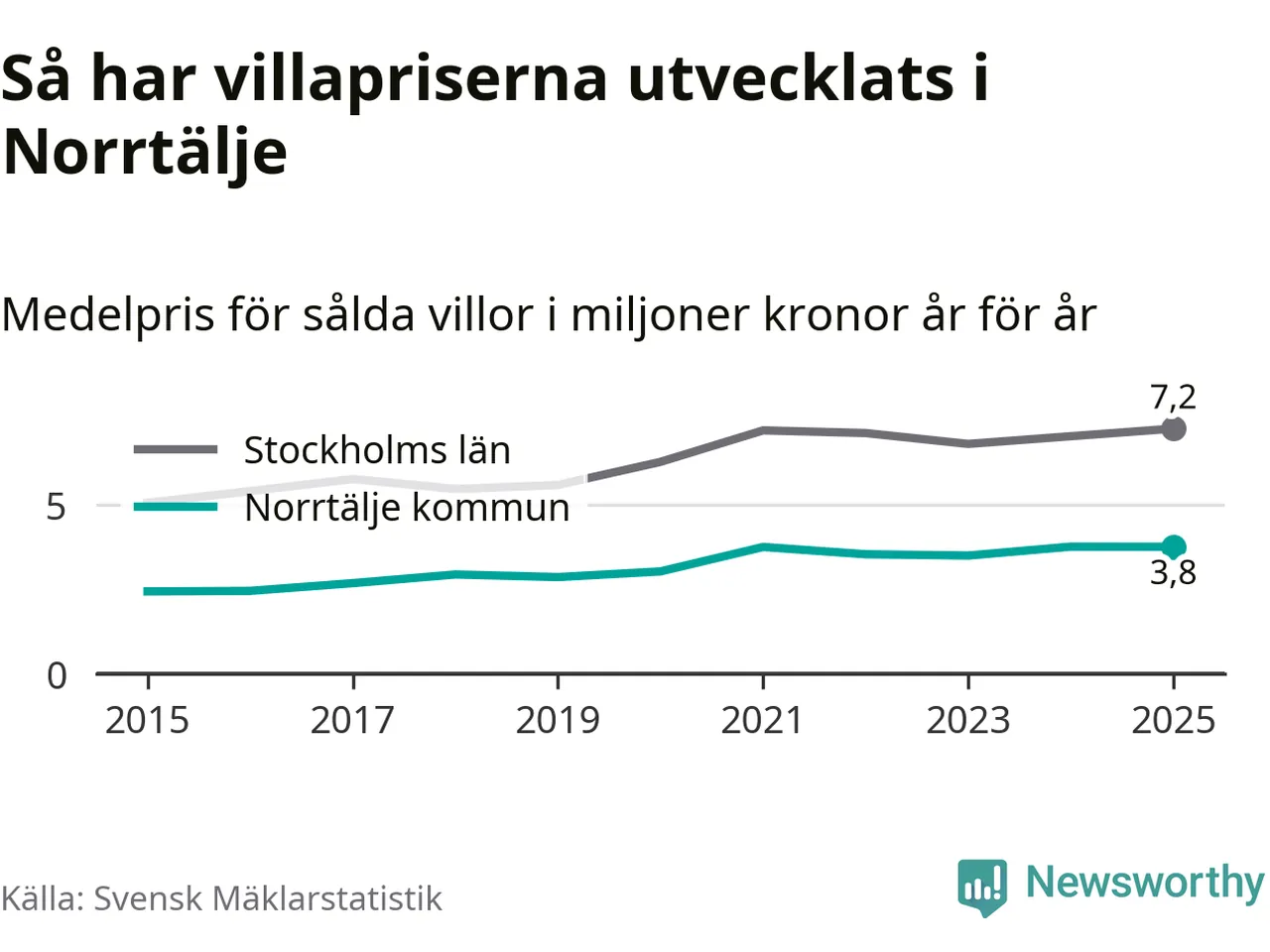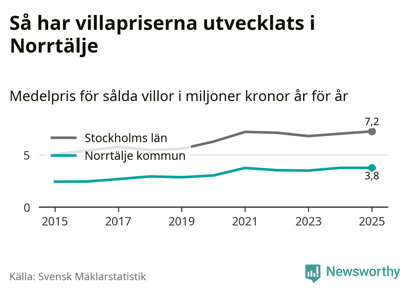3,8 miljoner kronor är medelpriset för de villor som såldes i Norrtälje kommun under året, eller 38 141 kronor per kvadratmeter. Det innebär att priserna har legat i stort sett stilla sedan förra året.