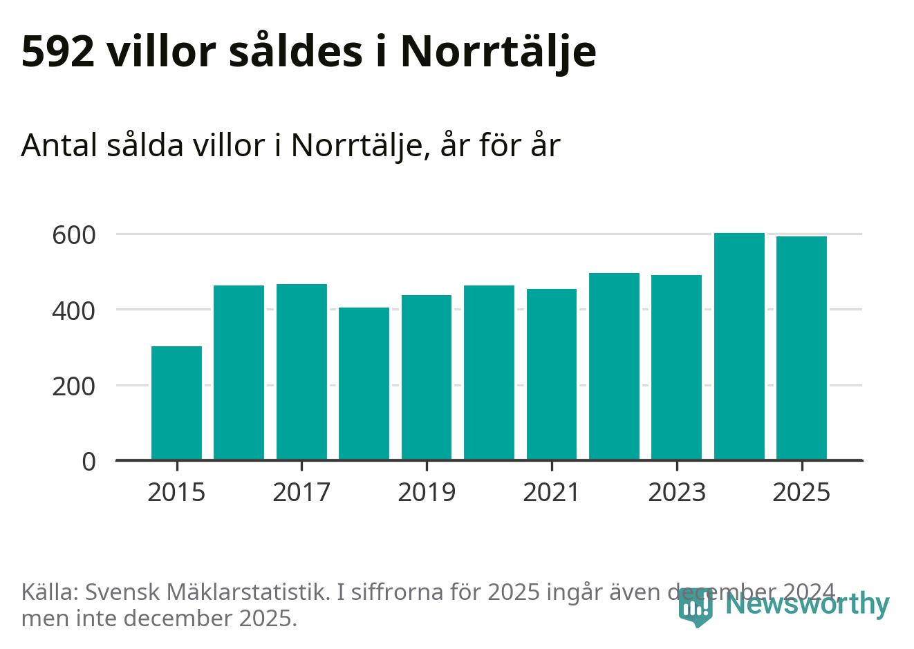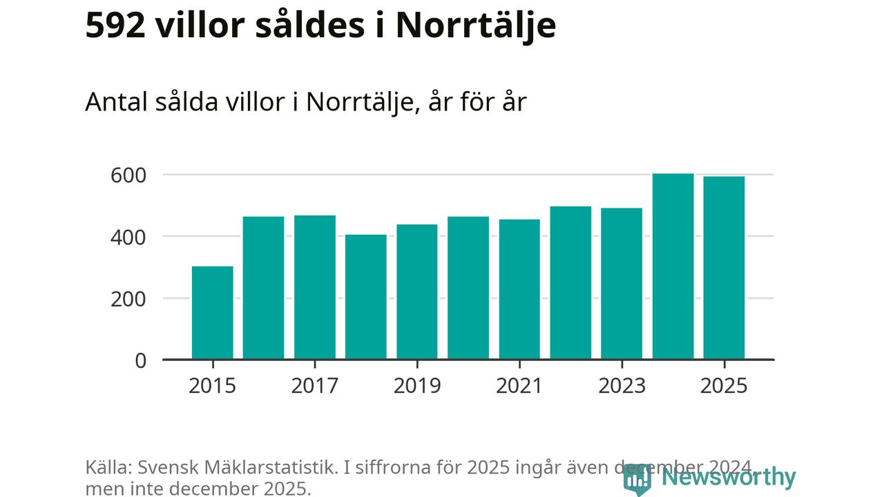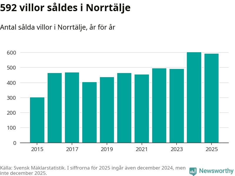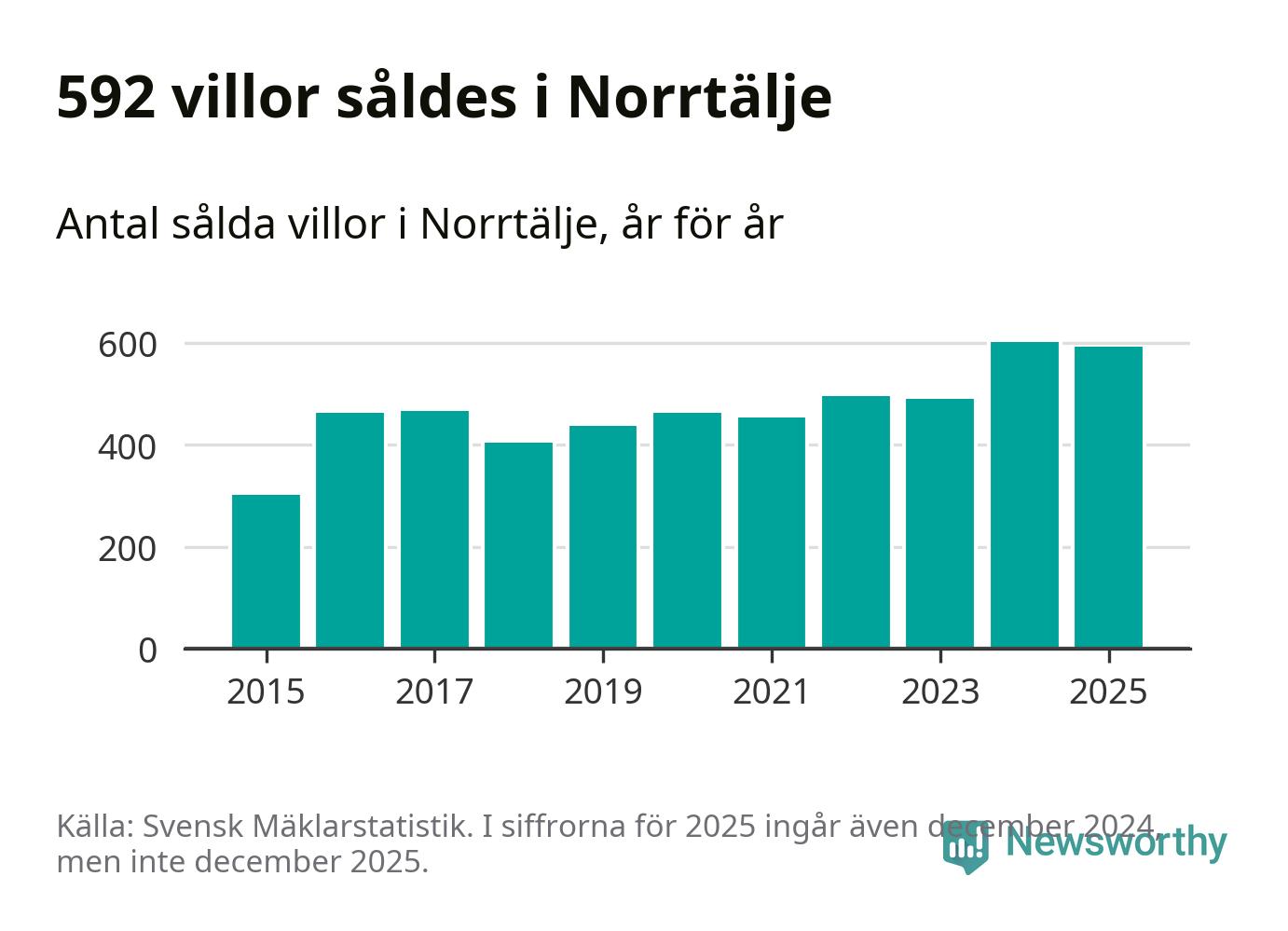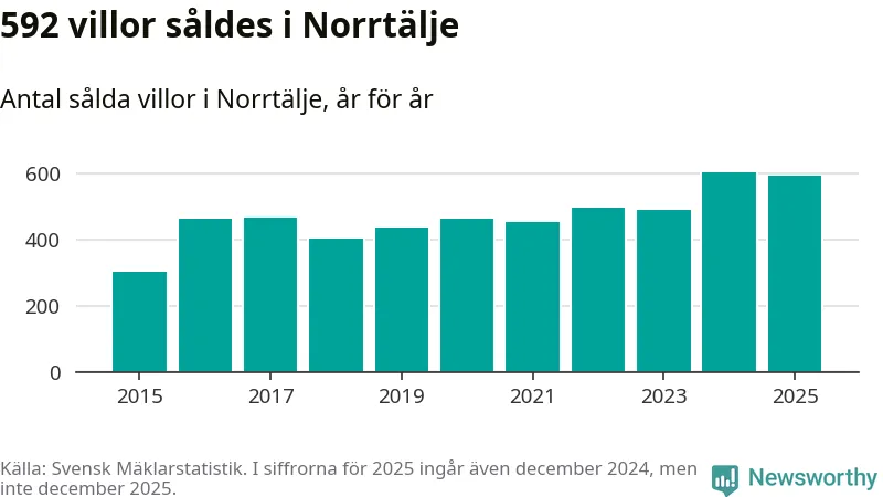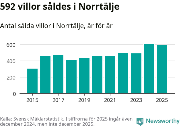 Däremot minskade antalet sålda villor. Totalt såldes 592 villor, att jämföra med 602 under 2024.
