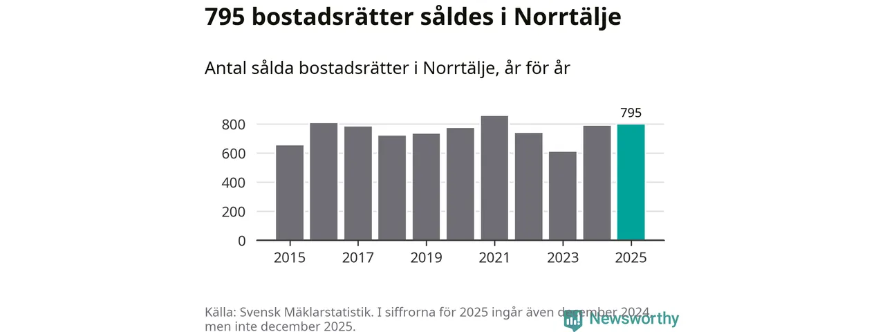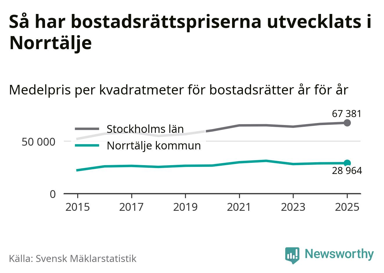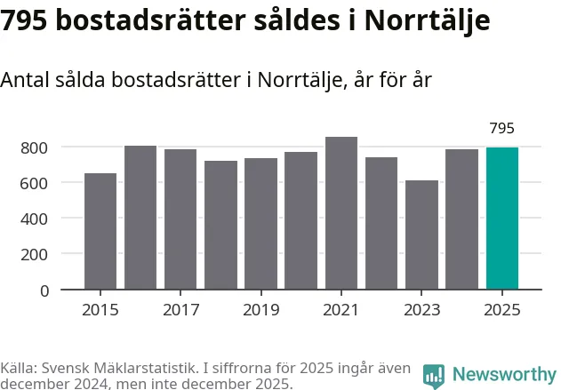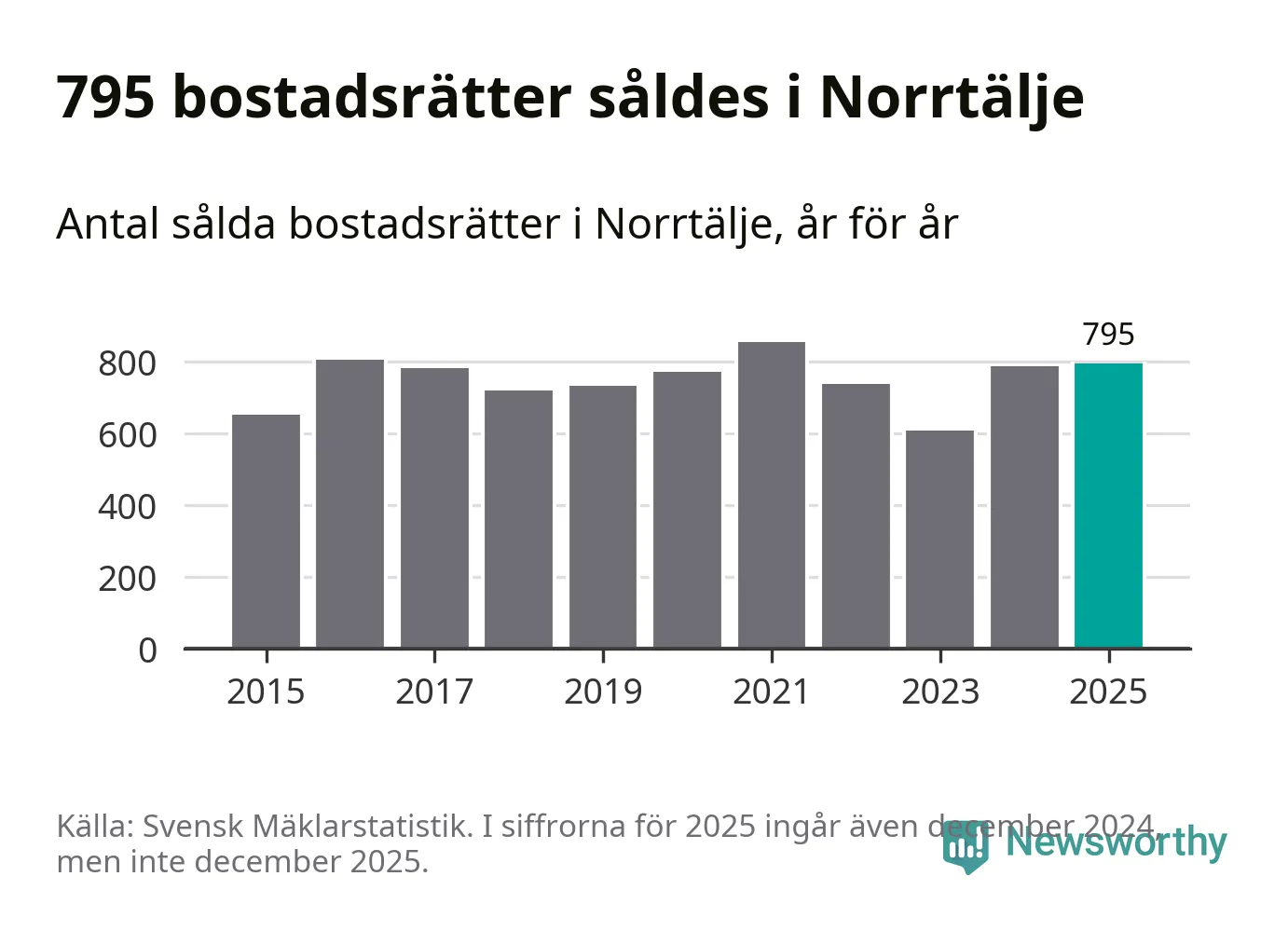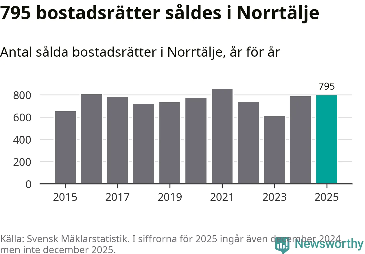 Det såldes totalt 795 bostadsrätter i Norrtälje kommun under året. Genomsnittspriset per kvadratmeter landade på 28 964 kronor, vilket är ungefär samma nivå som förra året.