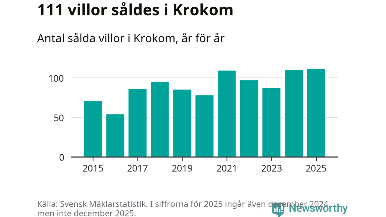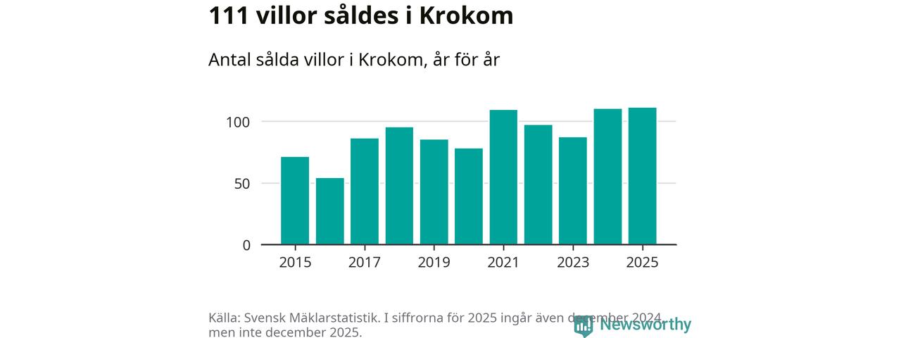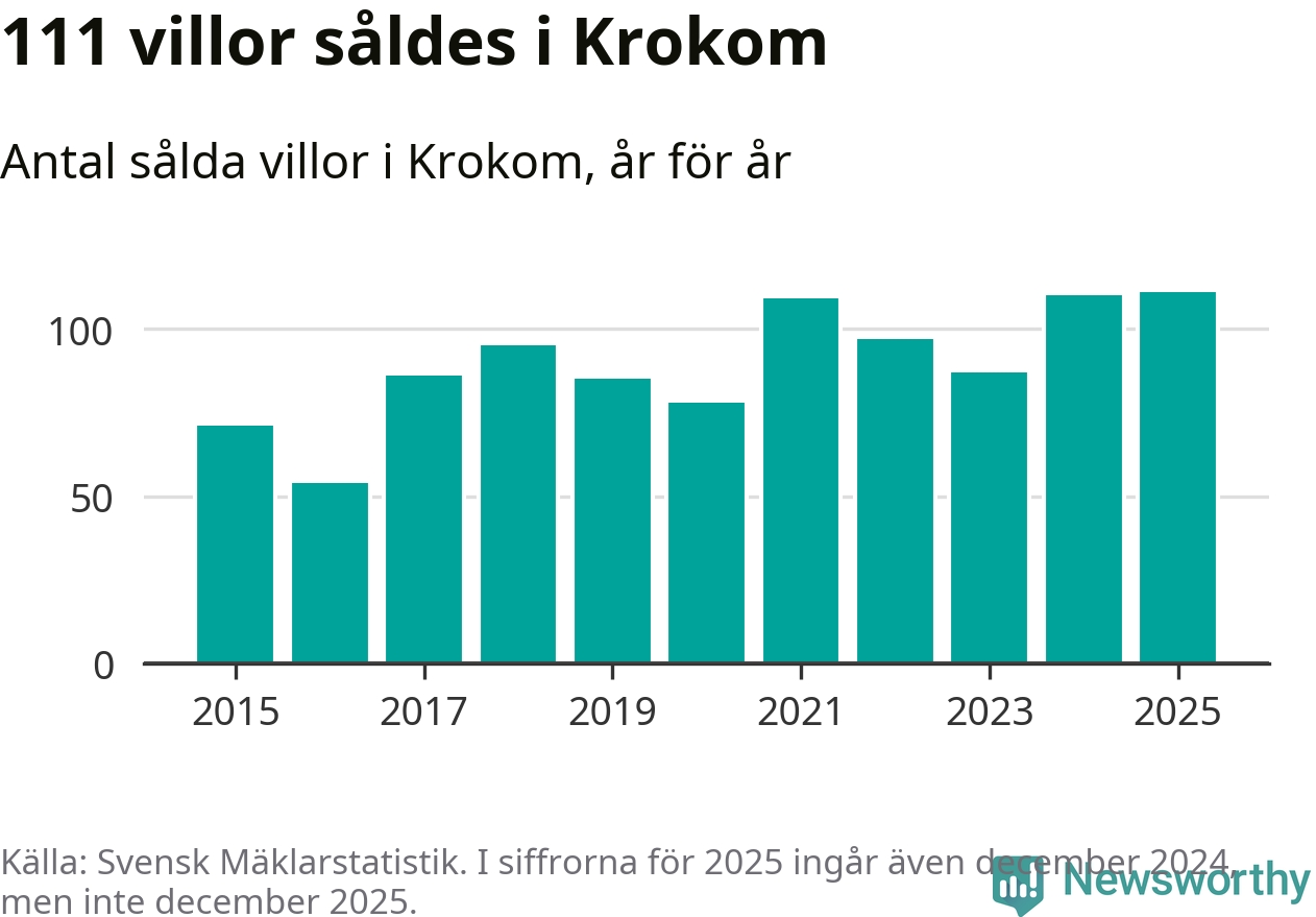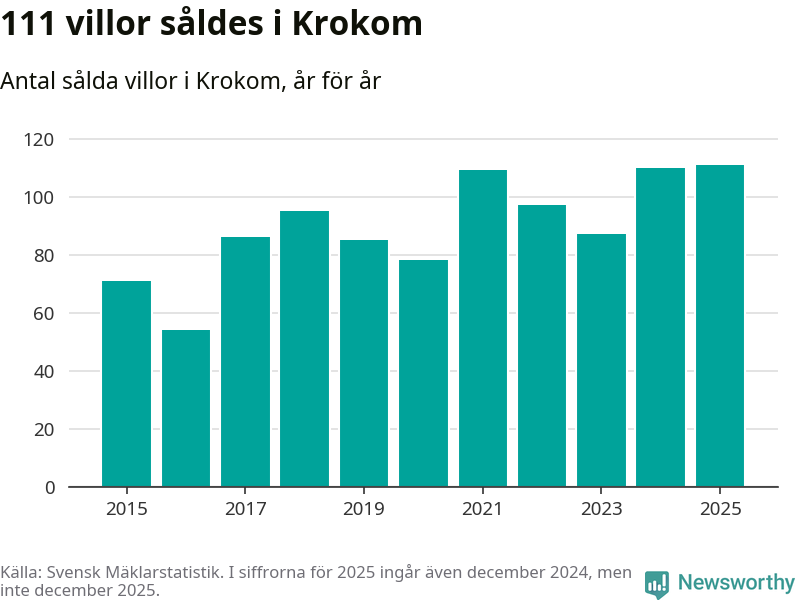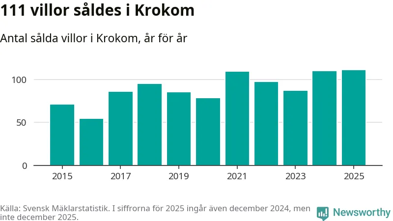 Antalet sålda villor ökade också något. Totalt såldes 111 villor, att jämföra med 110 under 2024. Det är fler än något annat år sedan 2015.
