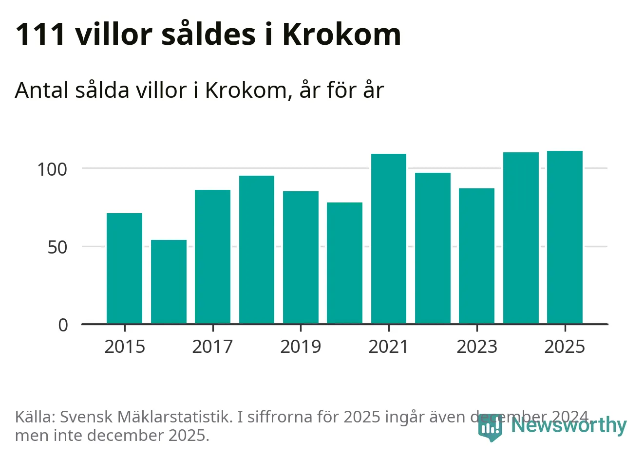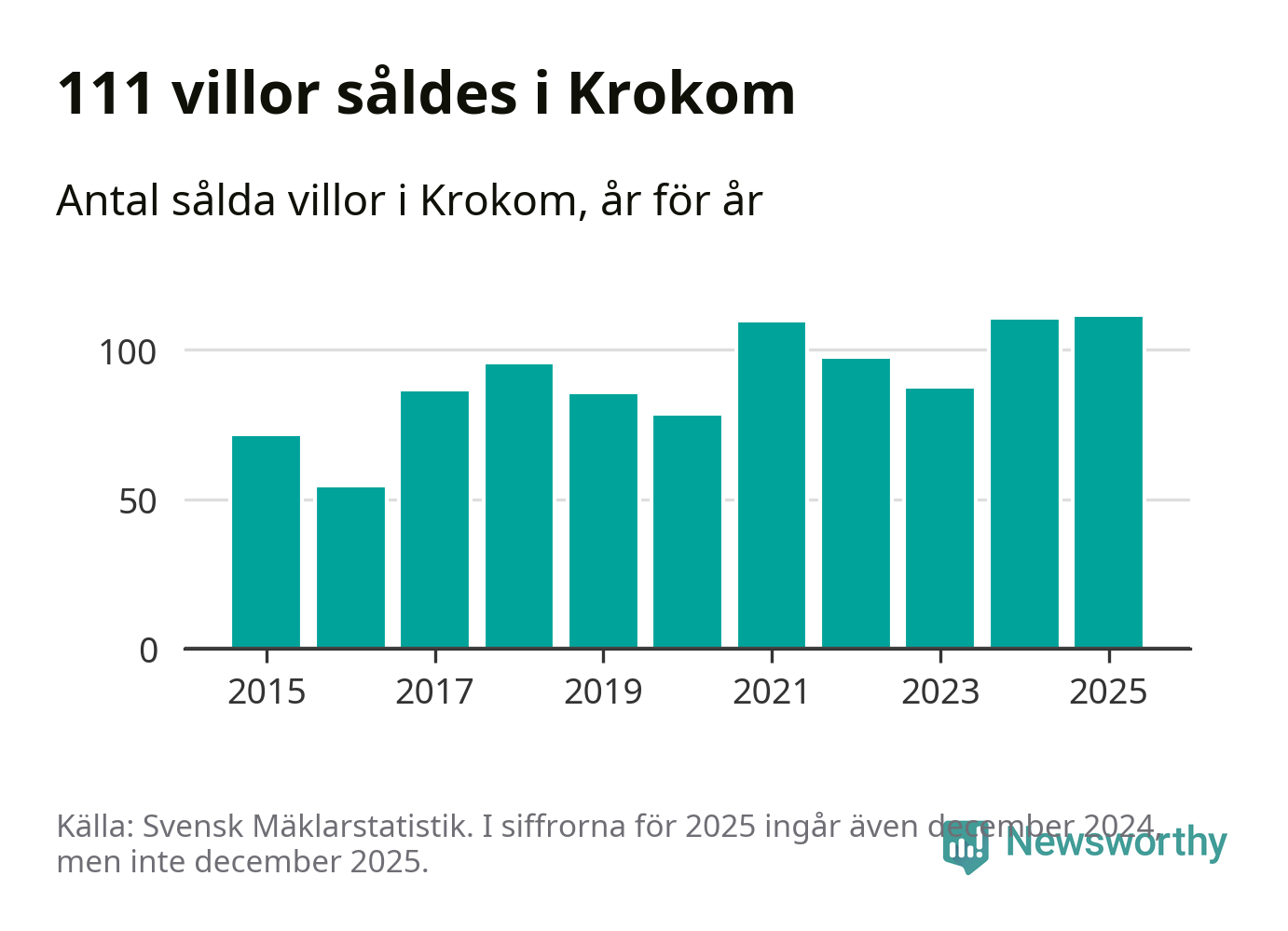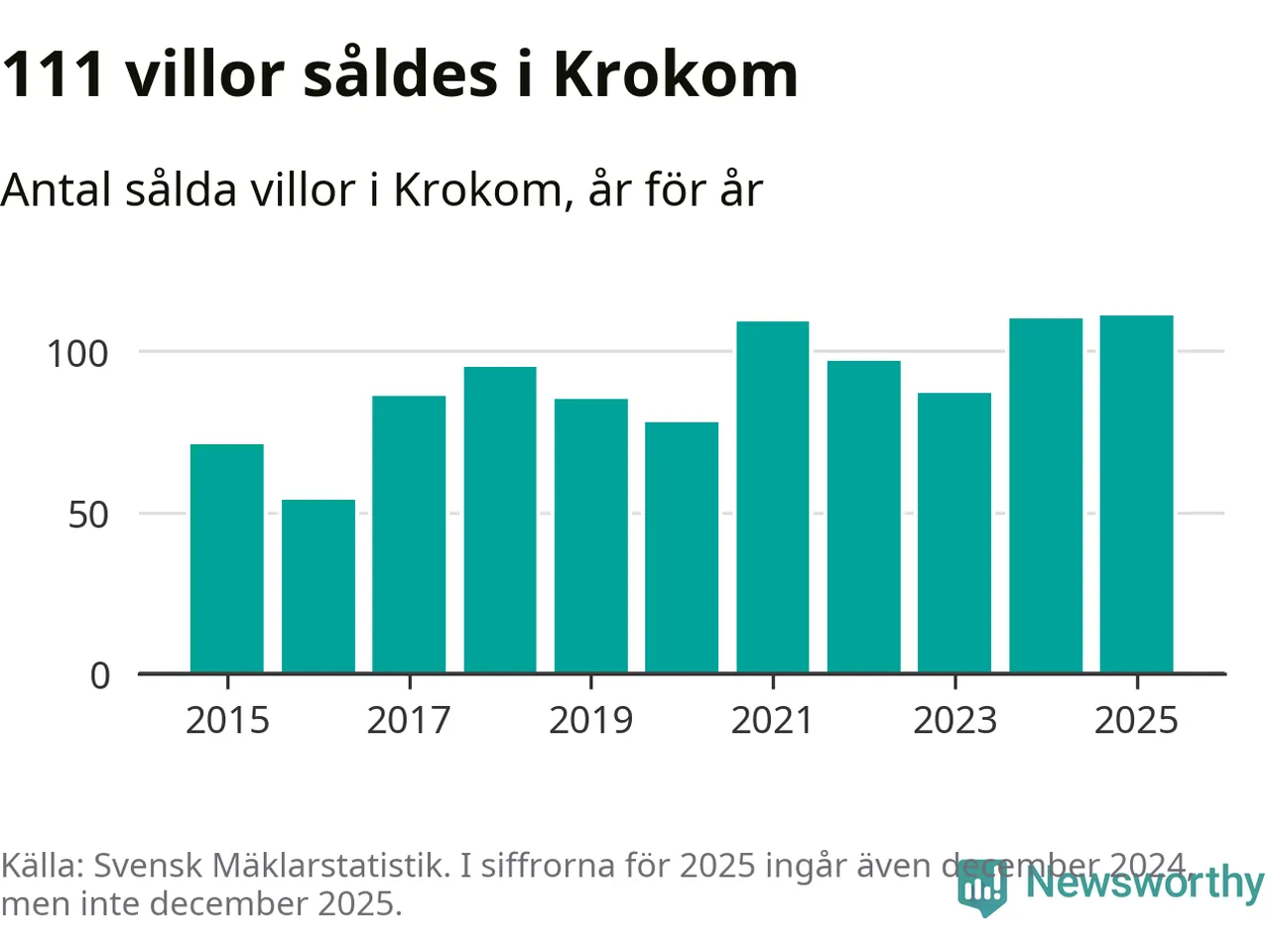 Antalet sålda villor ökade också något. Totalt såldes 111 villor, att jämföra med 110 under 2024. Det är fler än något annat år sedan 2015.