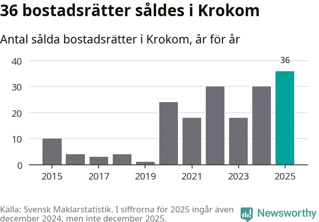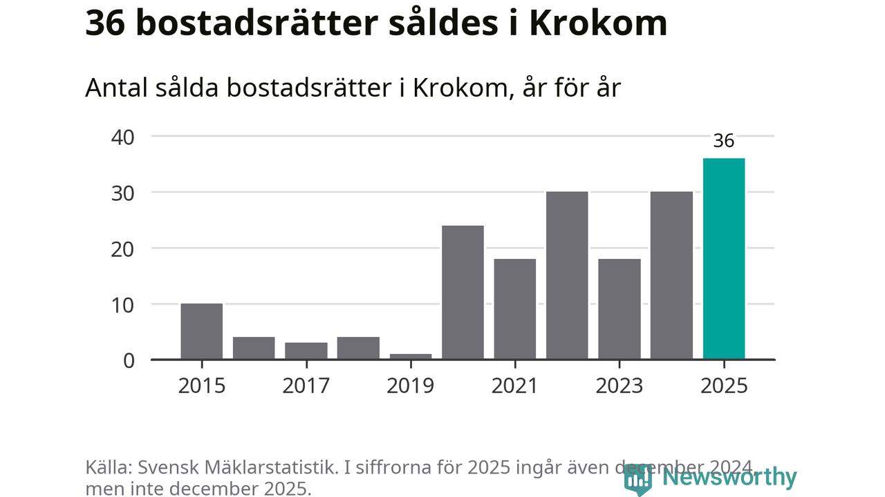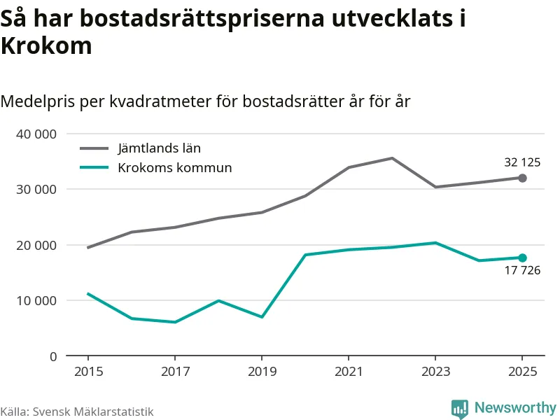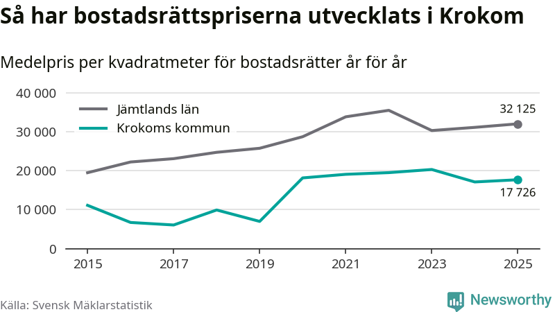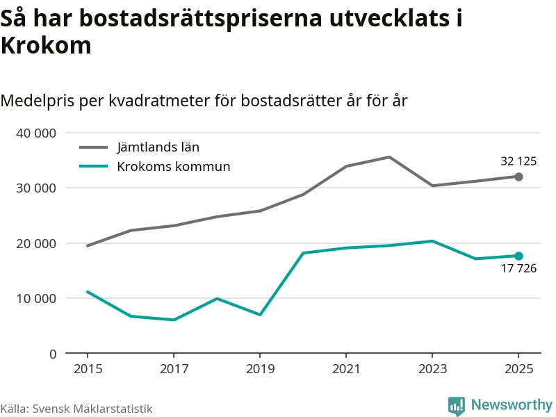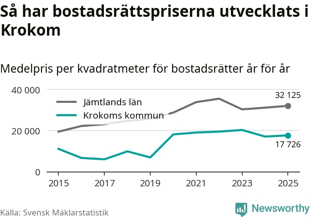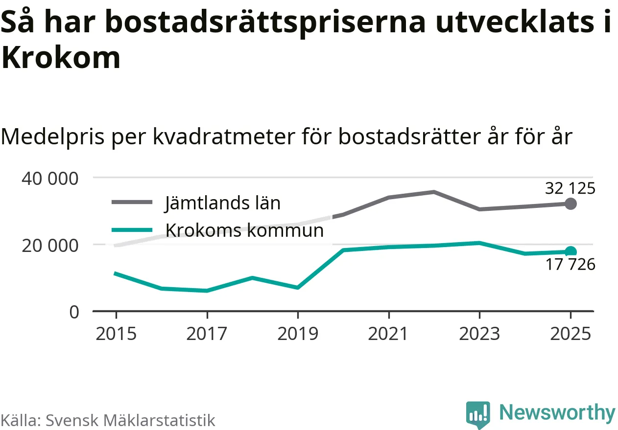 Det såldes totalt 36 bostadsrätter i Krokoms kommun under året. Det är fler än något annat år sedan 2015. Genomsnittspriset per kvadratmeter landade på 17 726 kronor. Det är en ökning med tre procent i kommunen på ett år.
