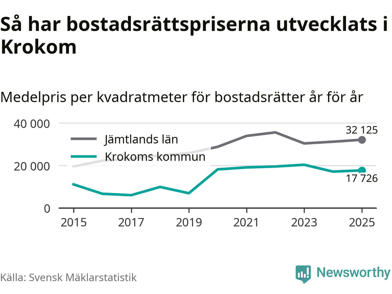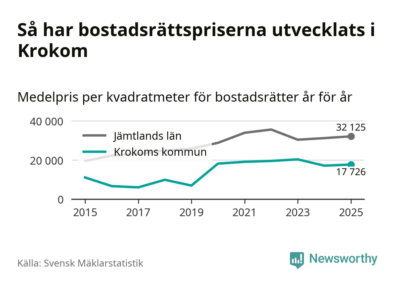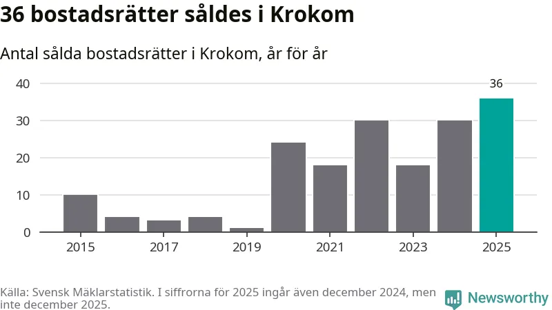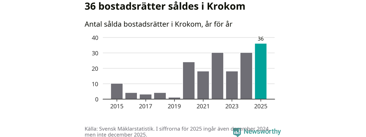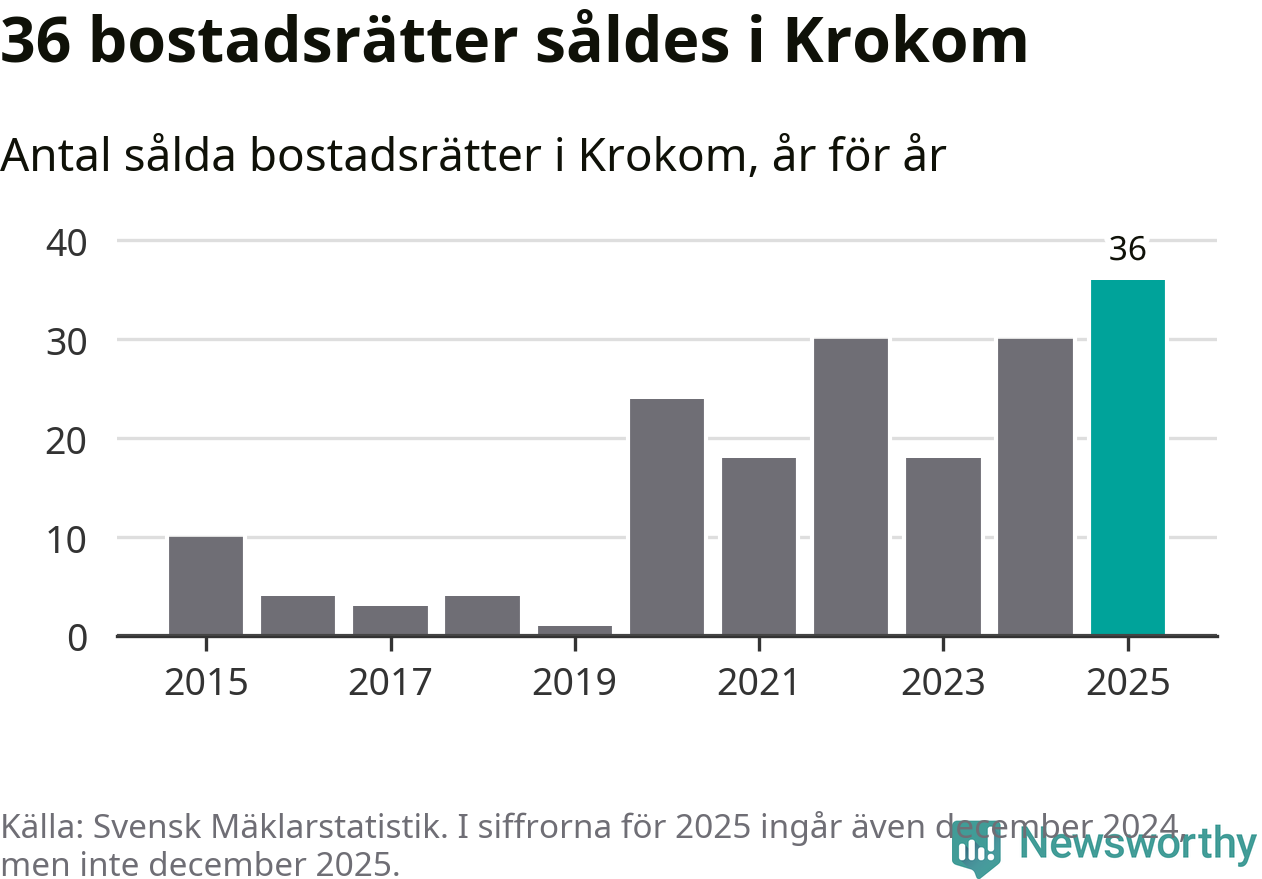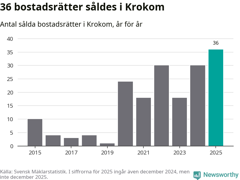 Det såldes totalt 36 bostadsrätter i Krokoms kommun under året. Det är fler än något annat år sedan 2015. Genomsnittspriset per kvadratmeter landade på 17 726 kronor. Det är en ökning med tre procent i kommunen på ett år.