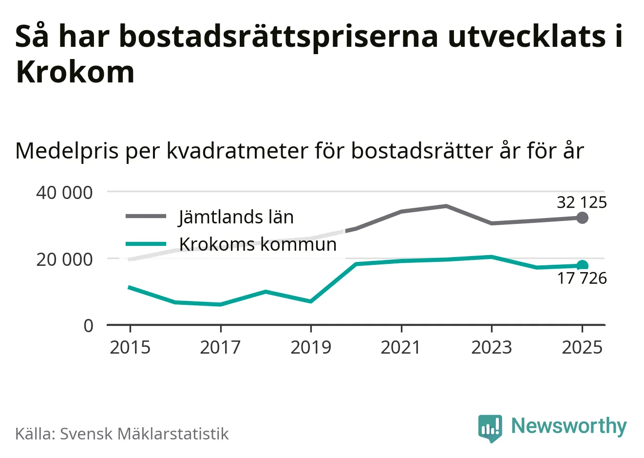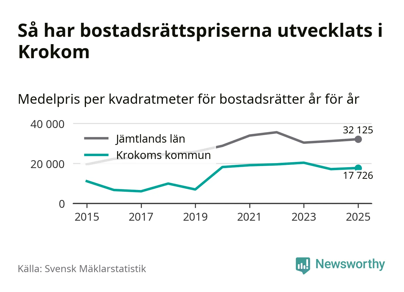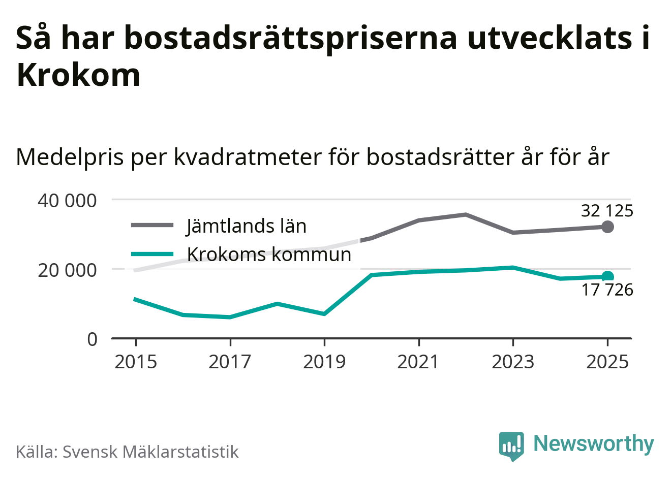 Det såldes totalt 36 bostadsrätter i Krokoms kommun under året. Det är fler än något annat år sedan 2015. Genomsnittspriset per kvadratmeter landade på 17 726 kronor. Det är en ökning med tre procent i kommunen på ett år.