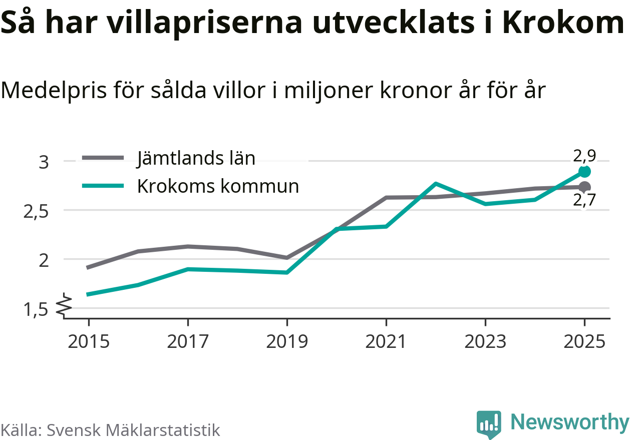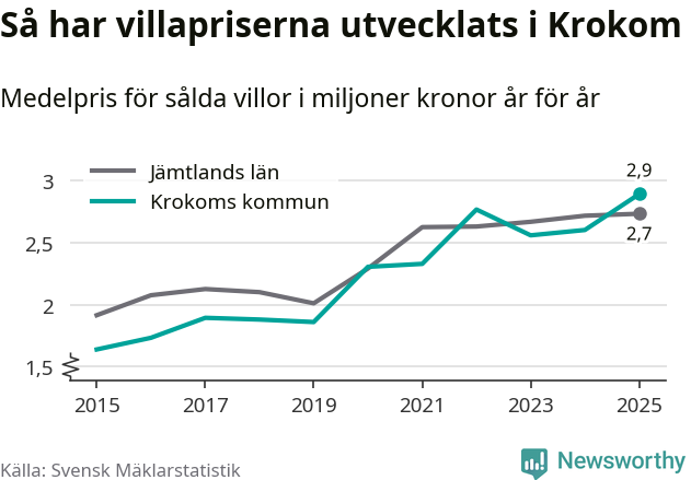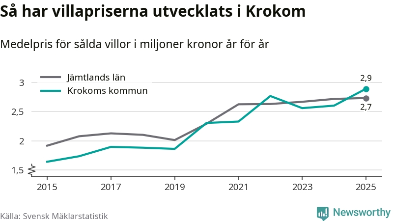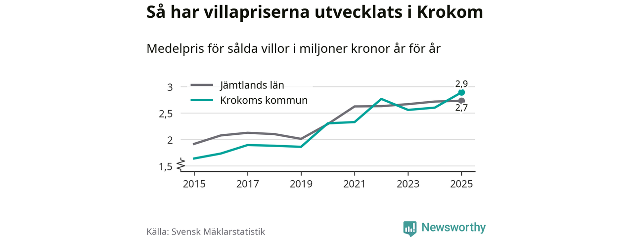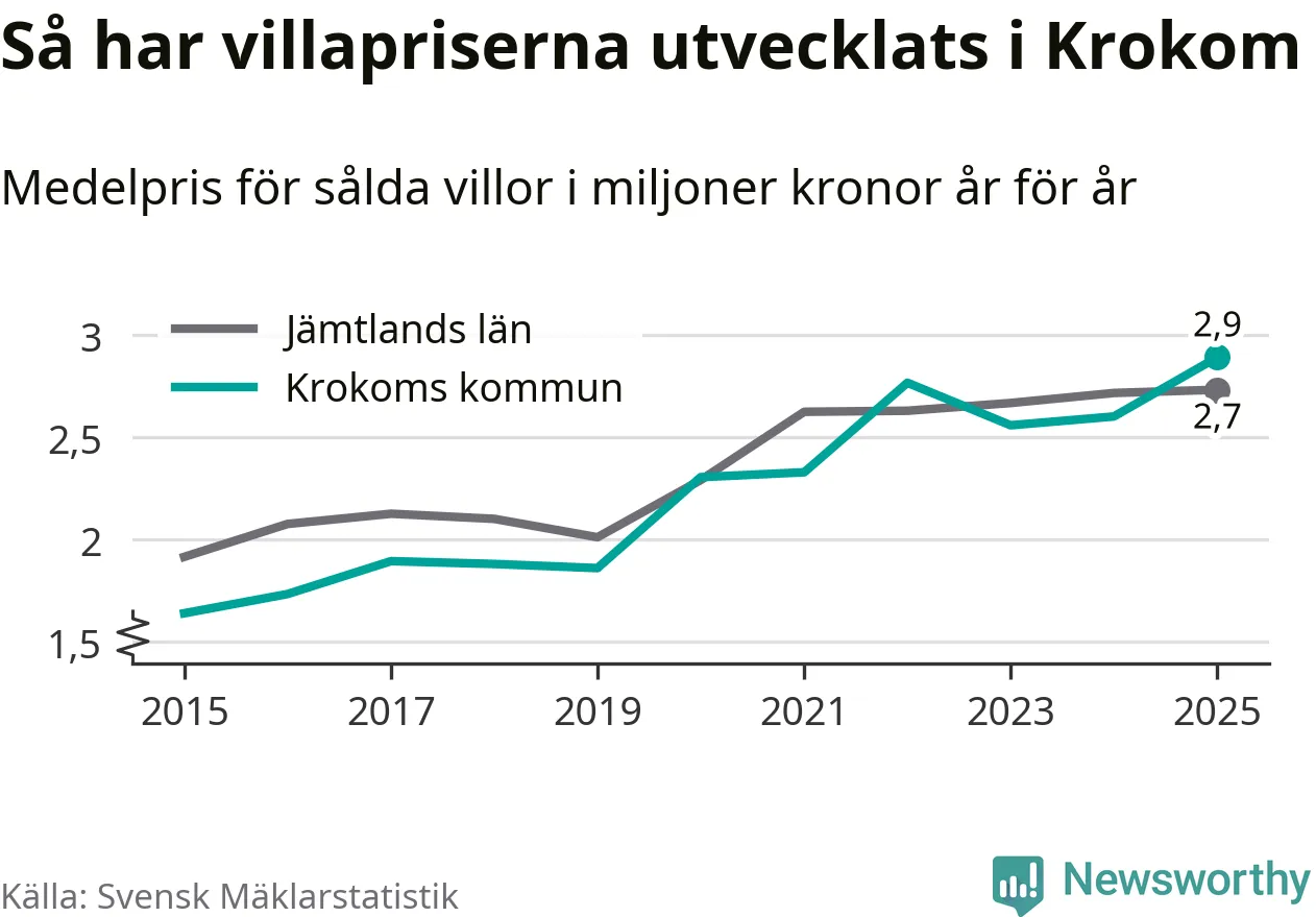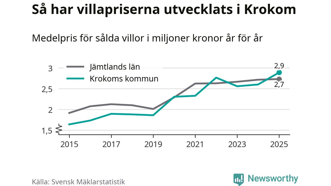 2,9 miljoner kronor är medelpriset för de villor som såldes i Krokoms kommun under året, eller 22 552 kronor per kvadratmeter. Det innebär en prisökning med elva procent på ett år. Det är det högsta årssnittet på åtminstone tio år.