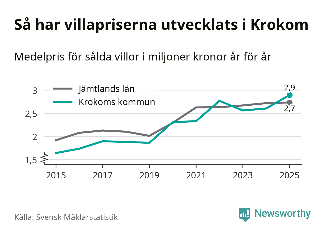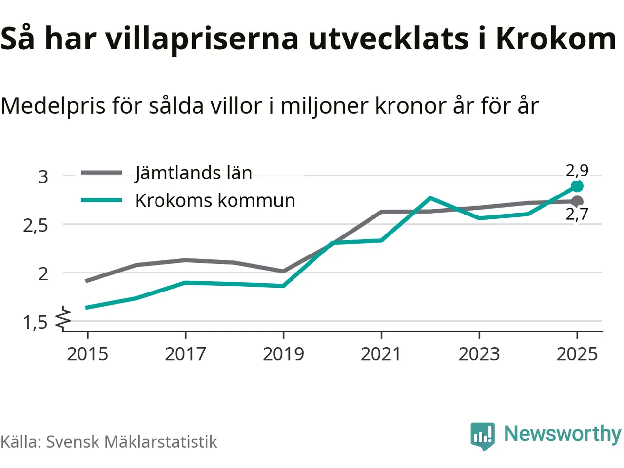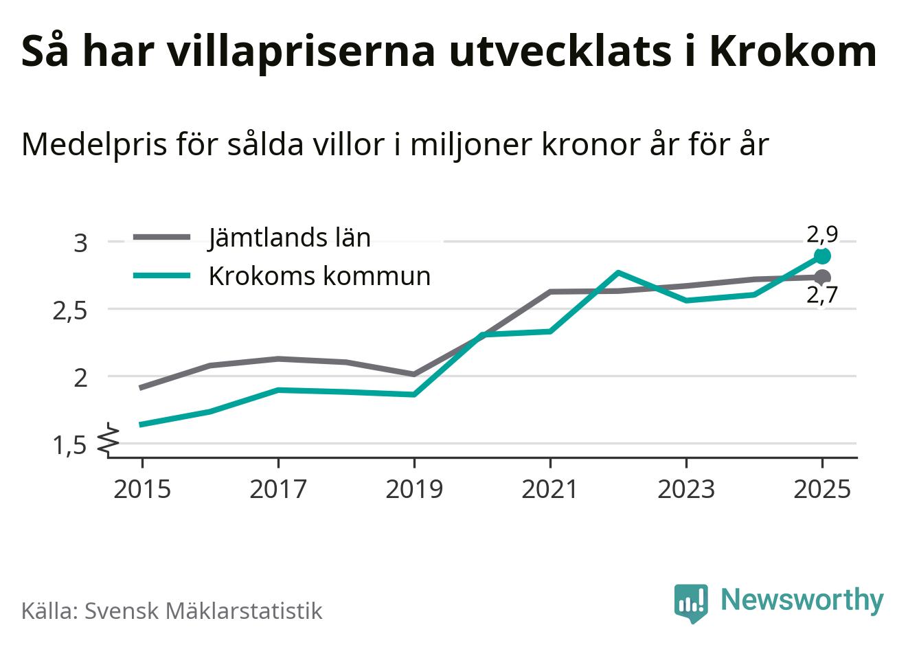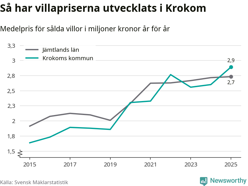 2,9 miljoner kronor är medelpriset för de villor som såldes i Krokoms kommun under året, eller 22 552 kronor per kvadratmeter. Det innebär en prisökning med elva procent på ett år. Det är det högsta årssnittet på åtminstone tio år.