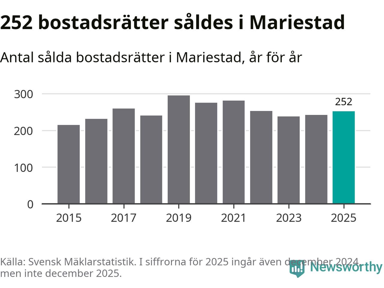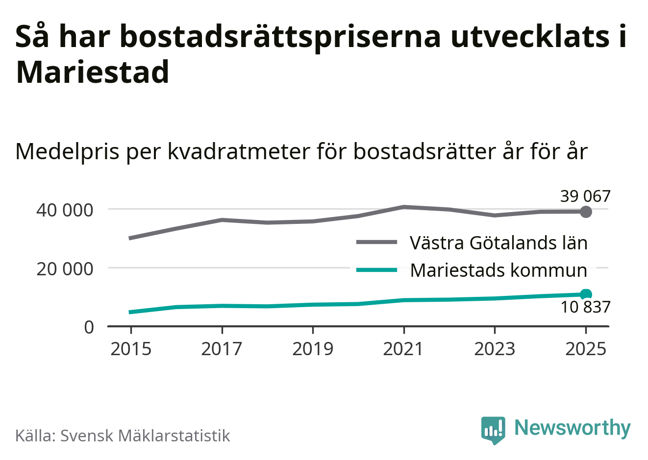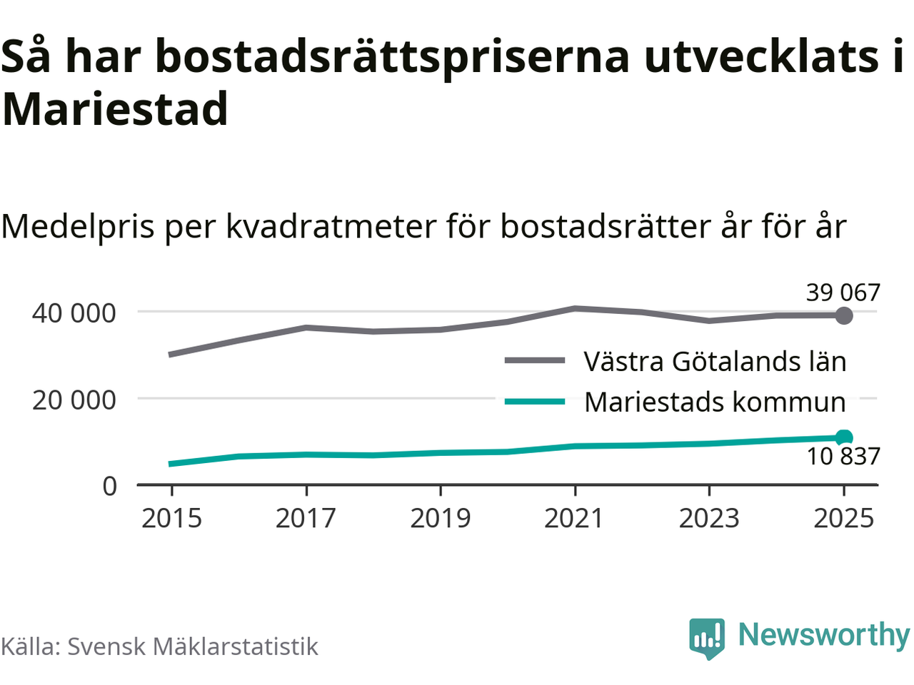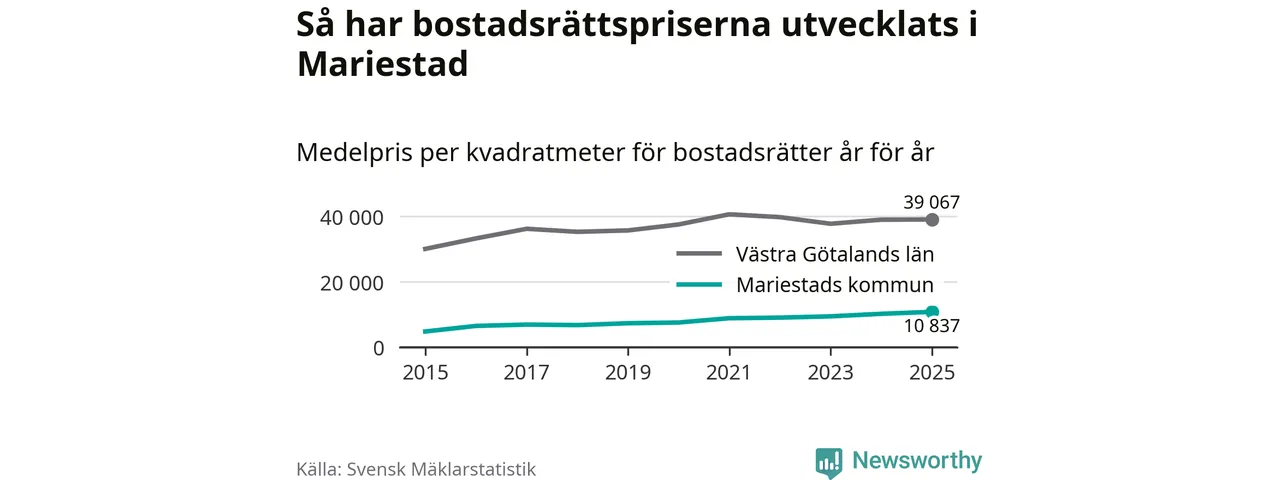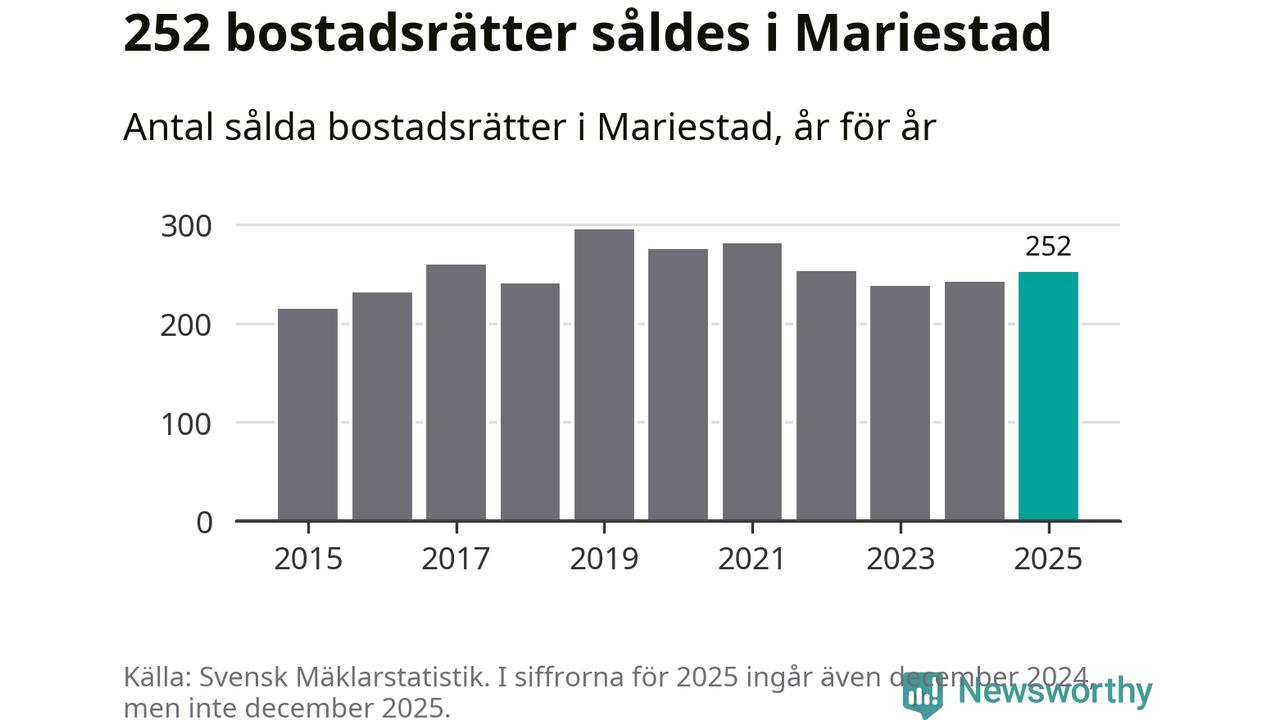 Det såldes totalt 252 bostadsrätter i Mariestads kommun under året. Genomsnittspriset per kvadratmeter landade på 10 837 kronor. Det är en ökning med sex procent i kommunen på ett år och den högsta årsnivån på över ett decennium.