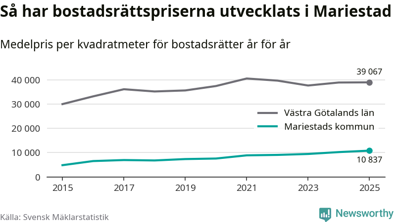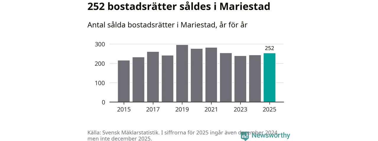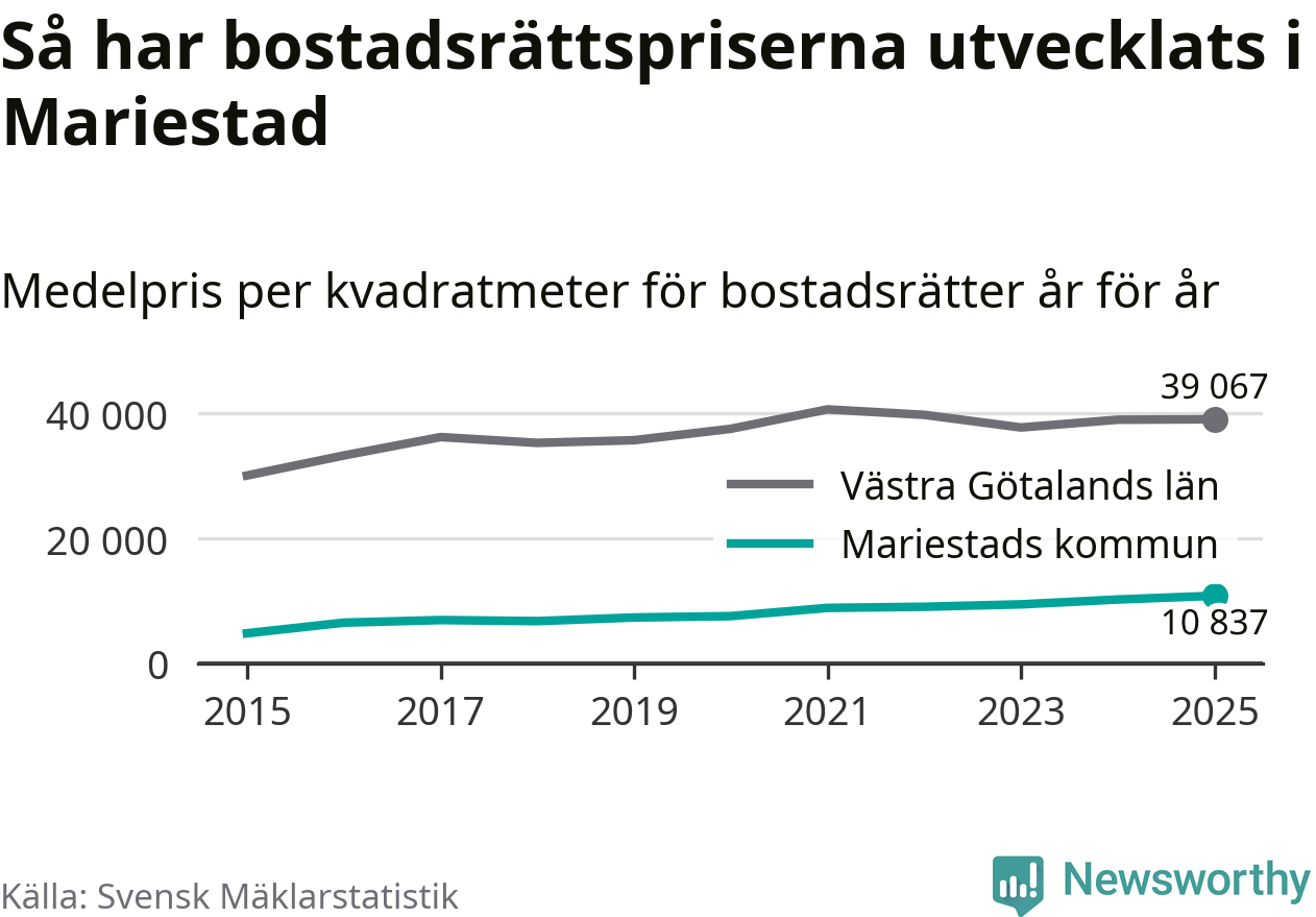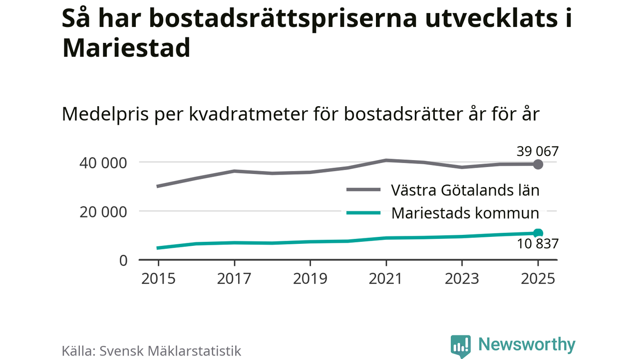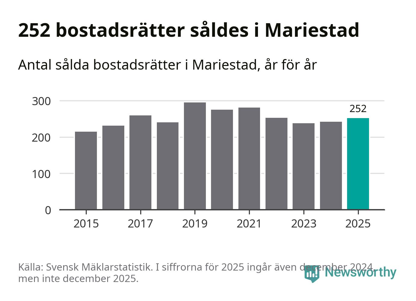 Det såldes totalt 252 bostadsrätter i Mariestads kommun under året. Genomsnittspriset per kvadratmeter landade på 10 837 kronor. Det är en ökning med sex procent i kommunen på ett år och den högsta årsnivån på över ett decennium.
