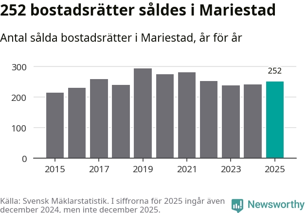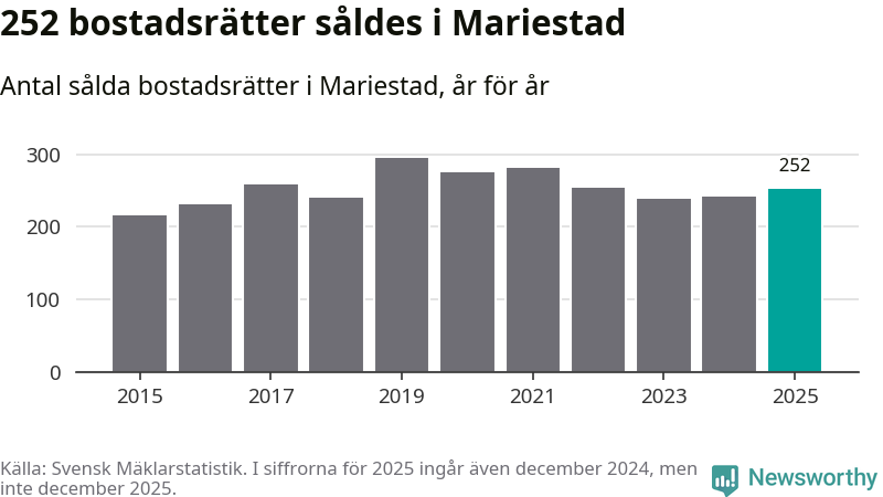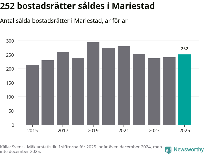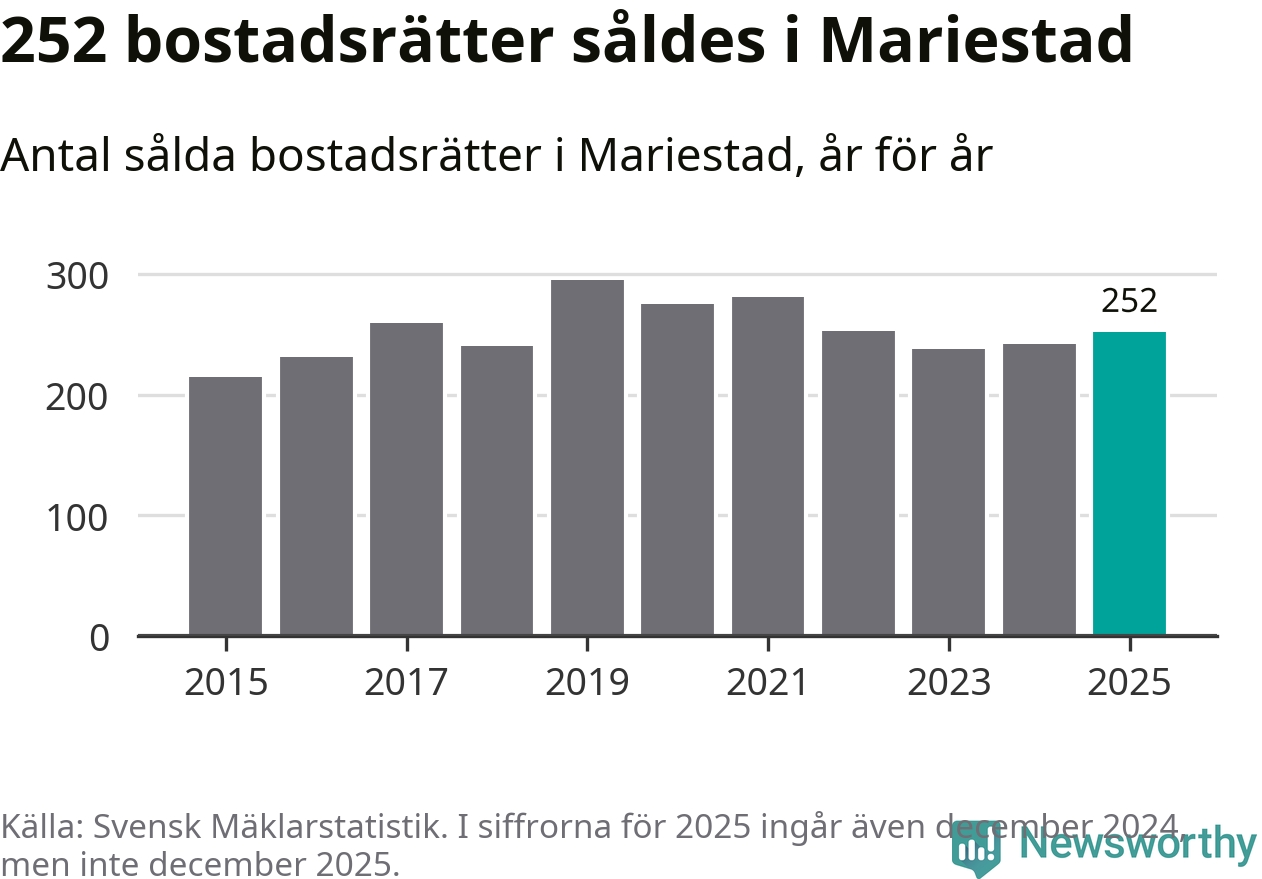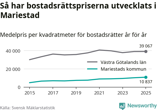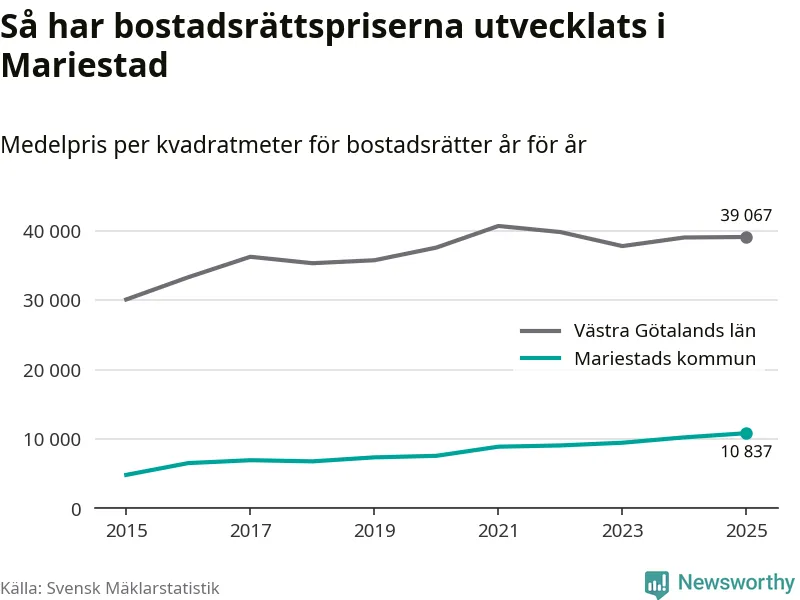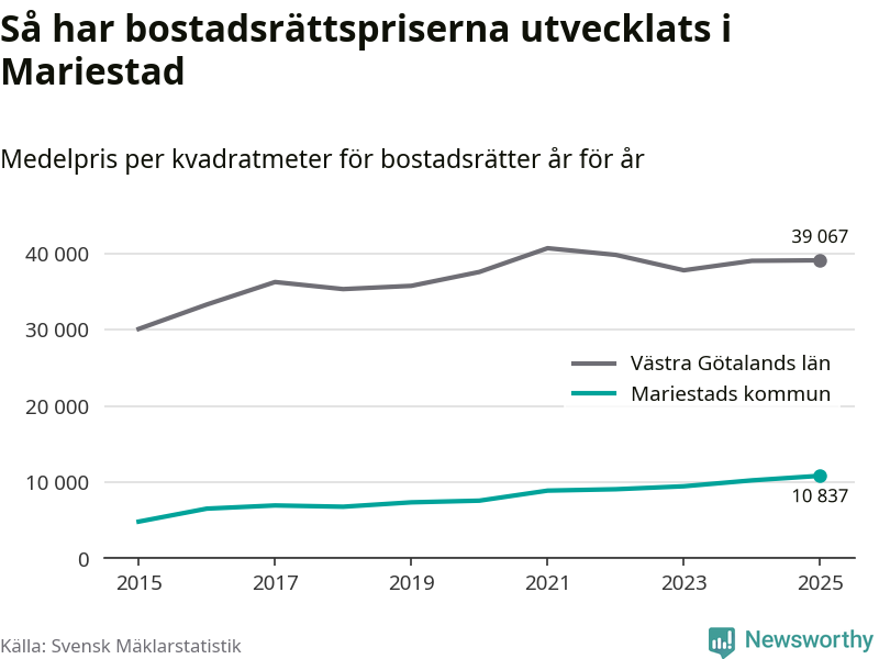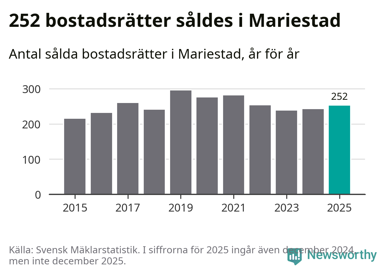 Det såldes totalt 252 bostadsrätter i Mariestads kommun under året. Genomsnittspriset per kvadratmeter landade på 10 837 kronor. Det är en ökning med sex procent i kommunen på ett år och den högsta årsnivån på över ett decennium.