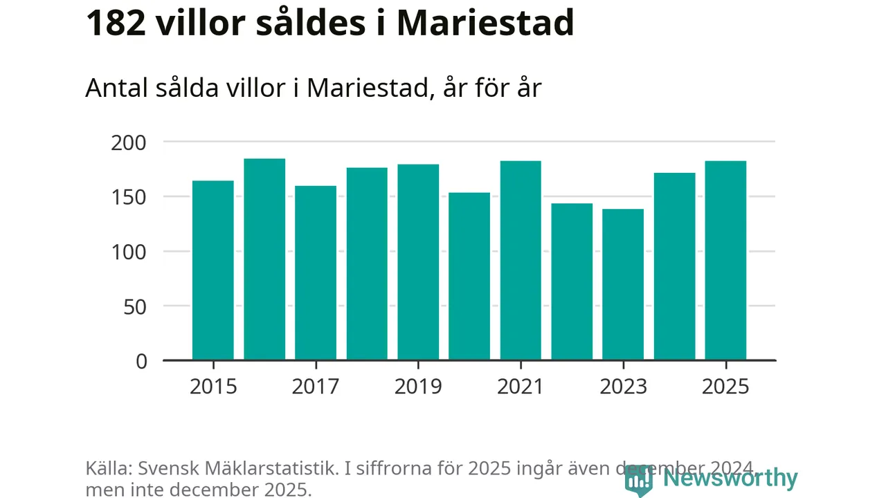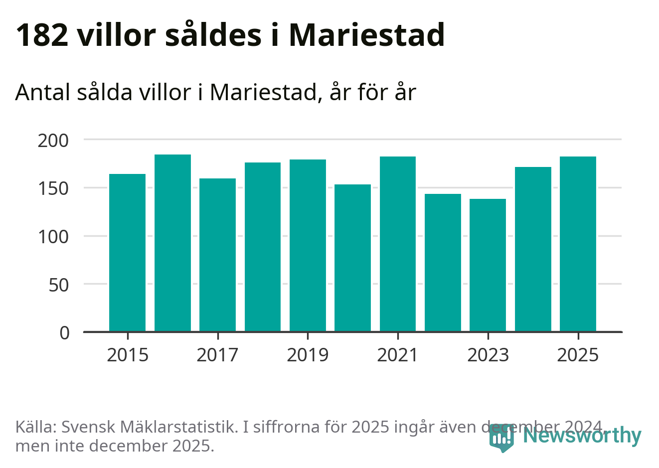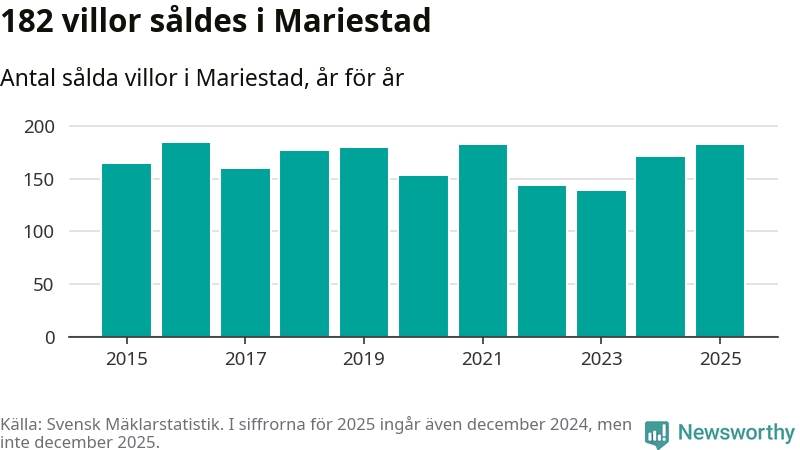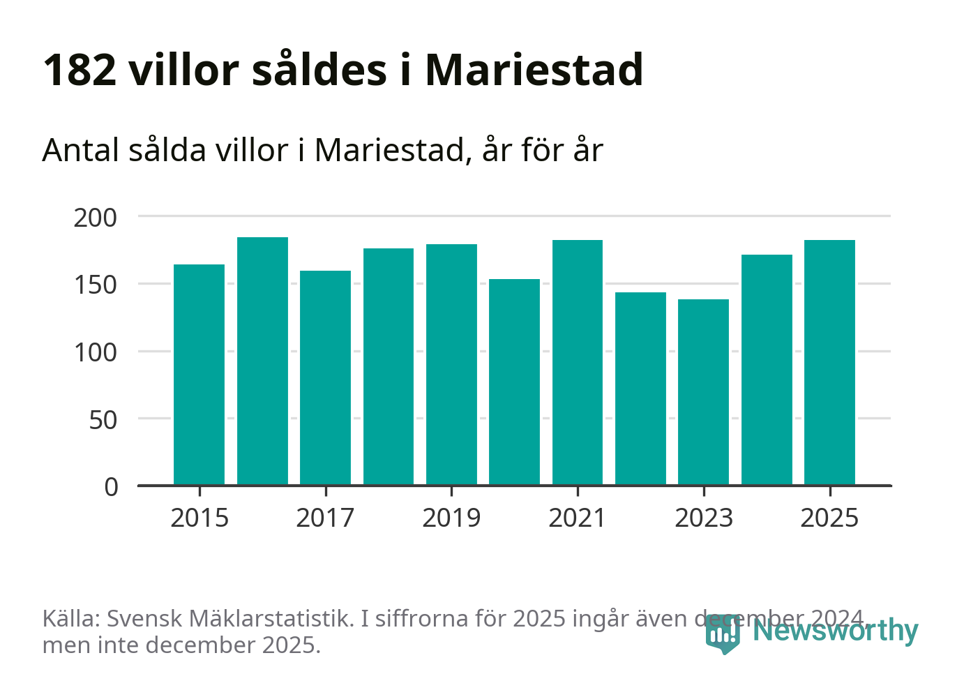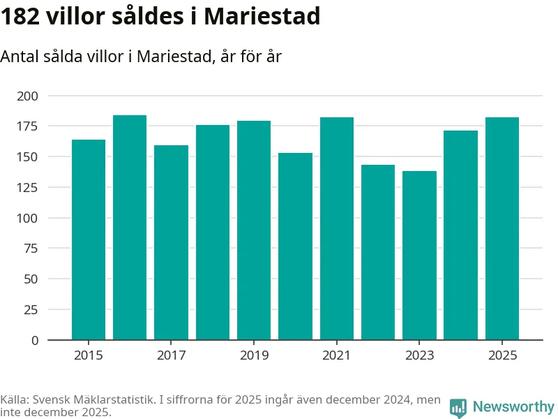 Däremot ökade antalet sålda villor. Totalt såldes 182 villor, att jämföra med 171 under 2024. Det är andra året i rad som antalet sålda villor ökar i kommunen.