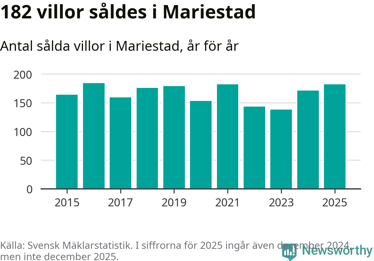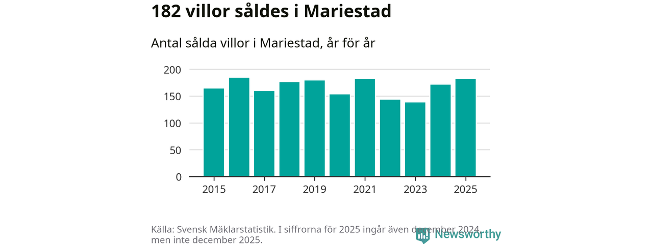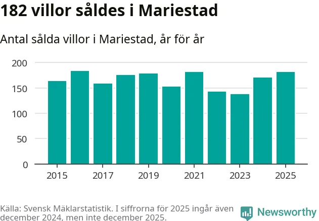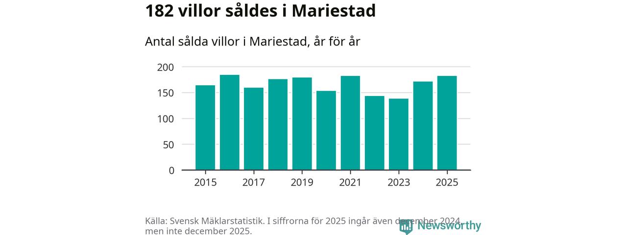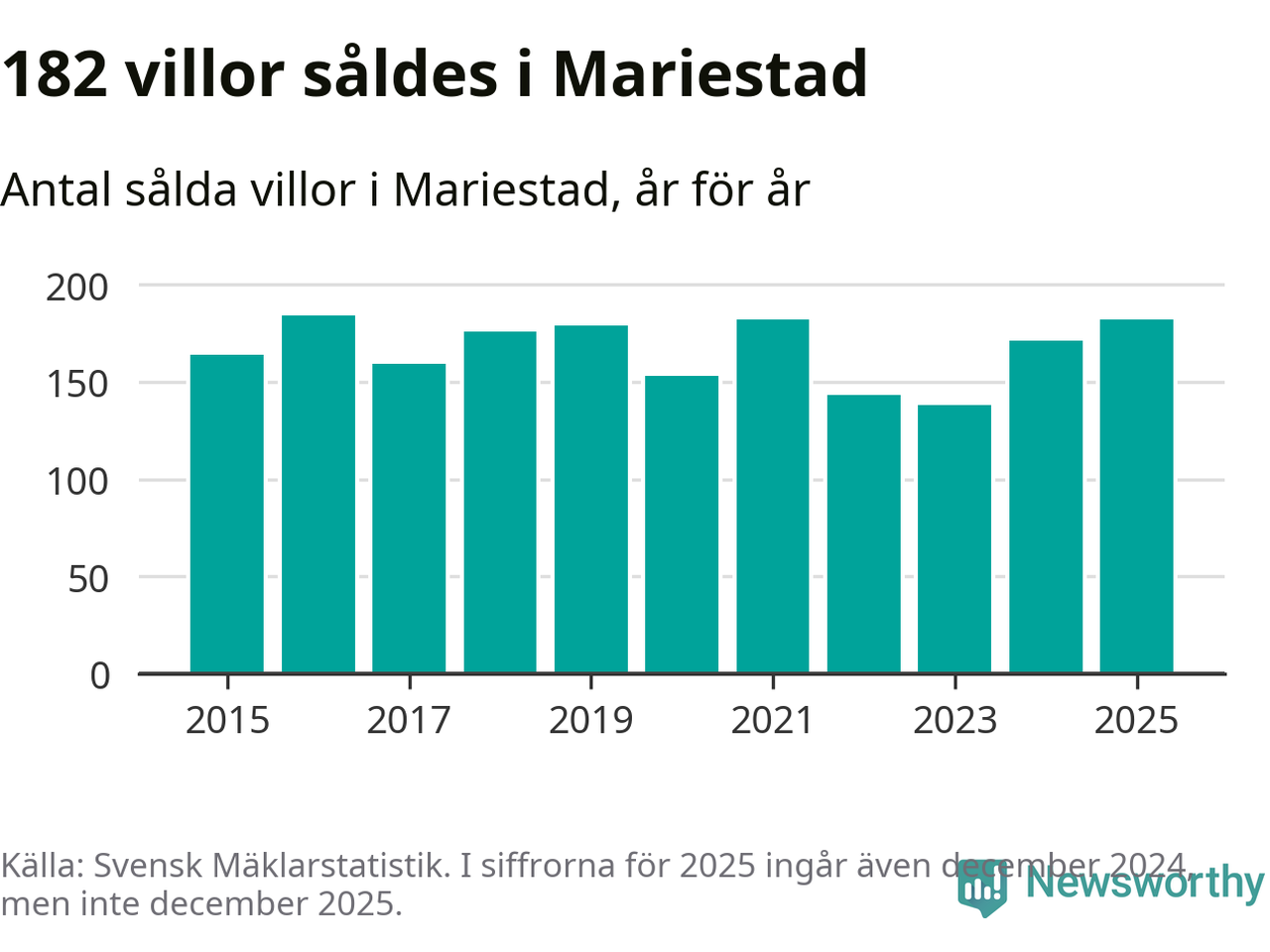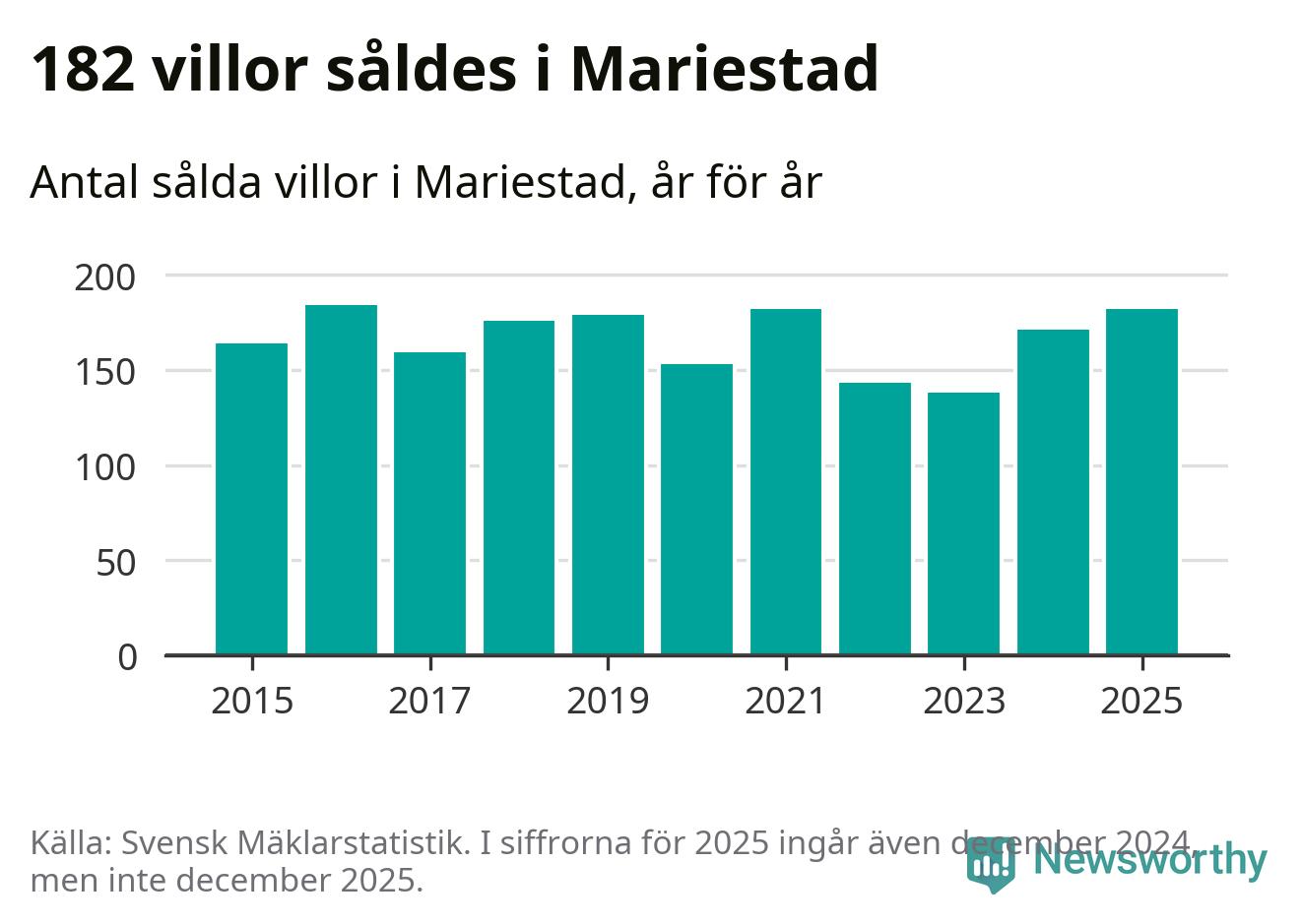 Däremot ökade antalet sålda villor. Totalt såldes 182 villor, att jämföra med 171 under 2024. Det är andra året i rad som antalet sålda villor ökar i kommunen.